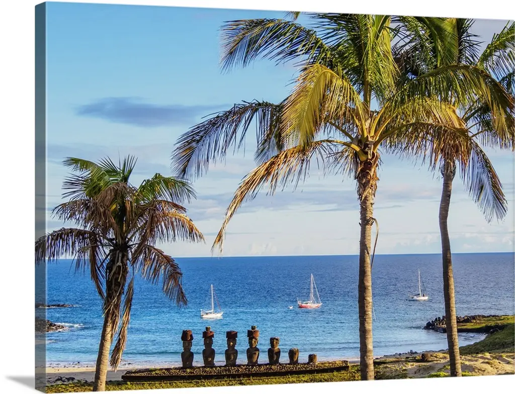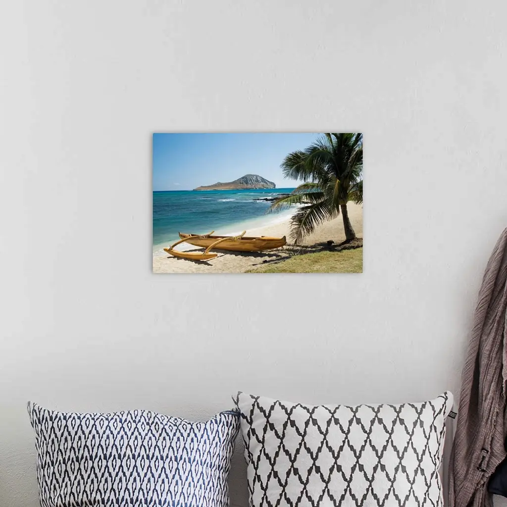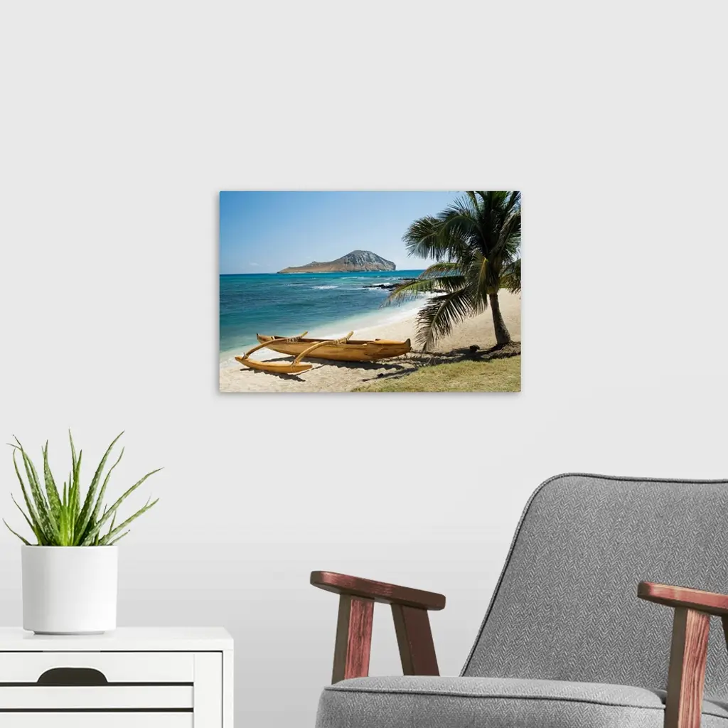 Landscape photograph on a giant canvas of a koa canoe sitting beneath a palm tree, along the East shore of Rabbit Island in Oahu, Hawaii. A large island can be seen past the blue waters, on the horizon.