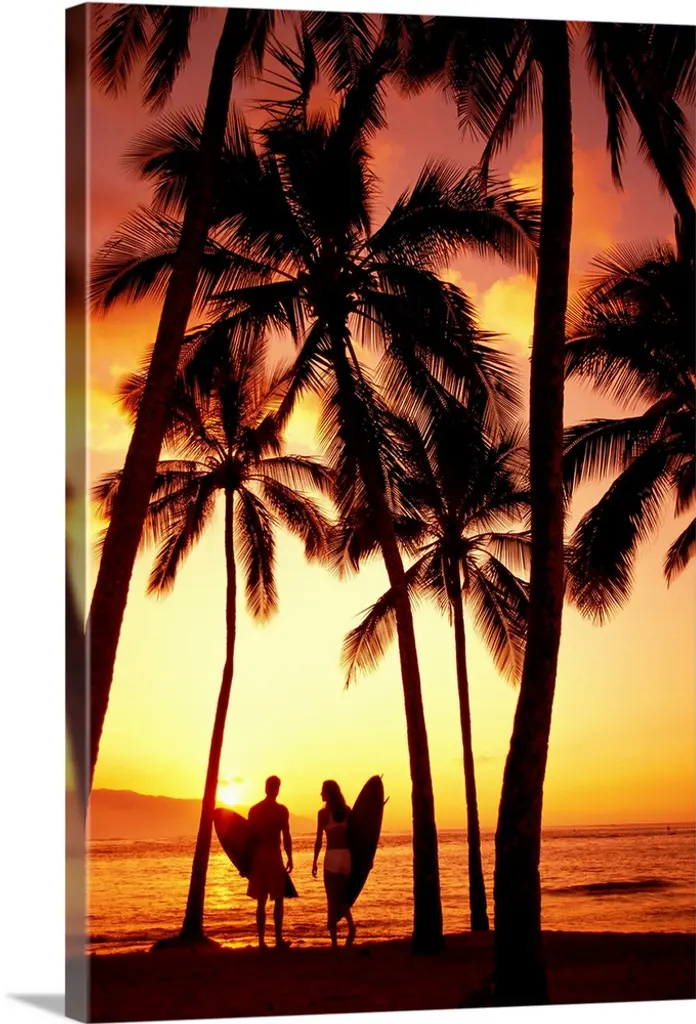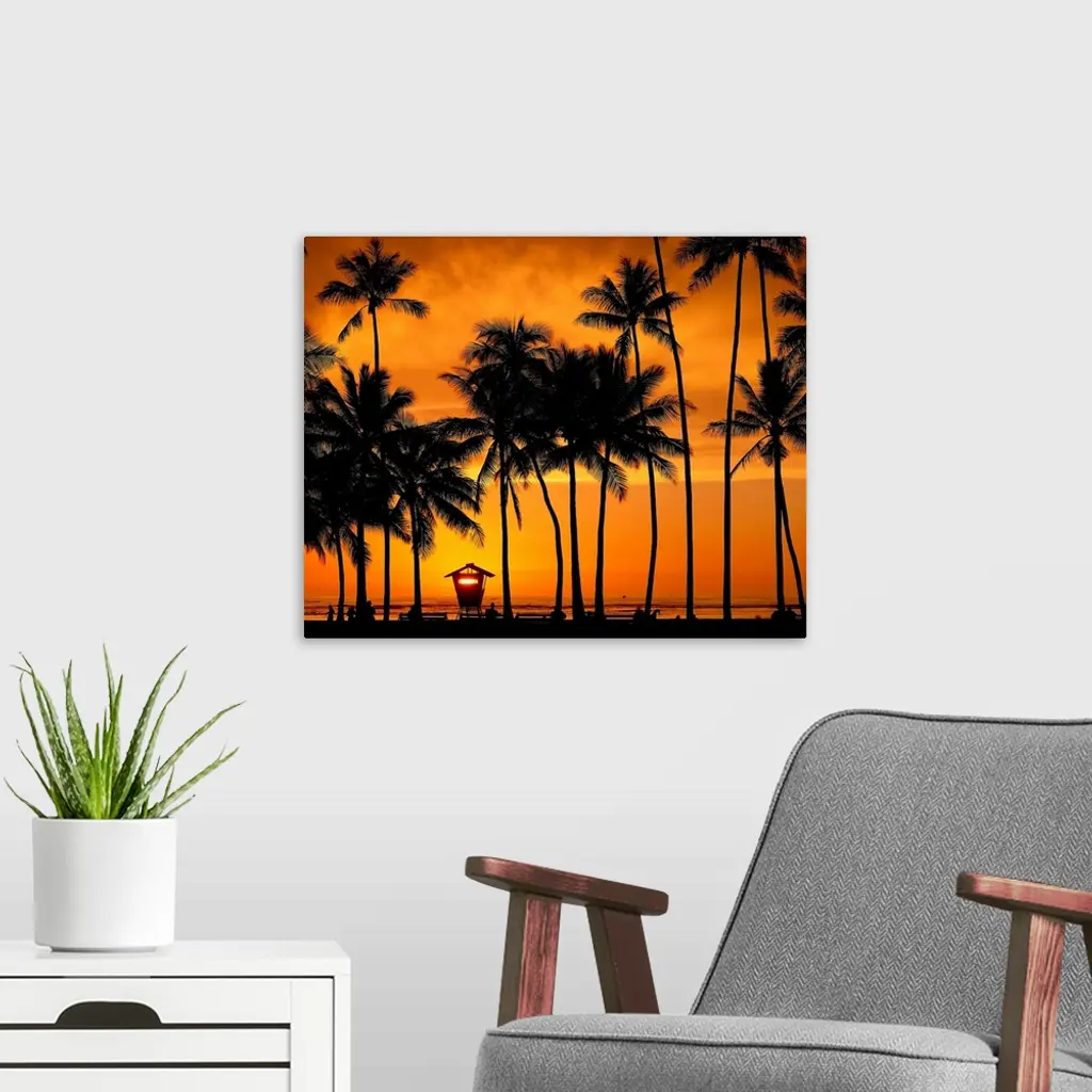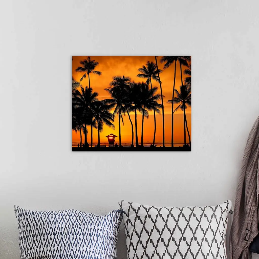 Hawaii, Oahu, Honolulu, Waikiki beach at sunset with palm-trees wall art for home and office decor. Discover canvas art prints, photos, mural, big canvas art and framed wall art in GreatBigCanvas.com's varied collections.