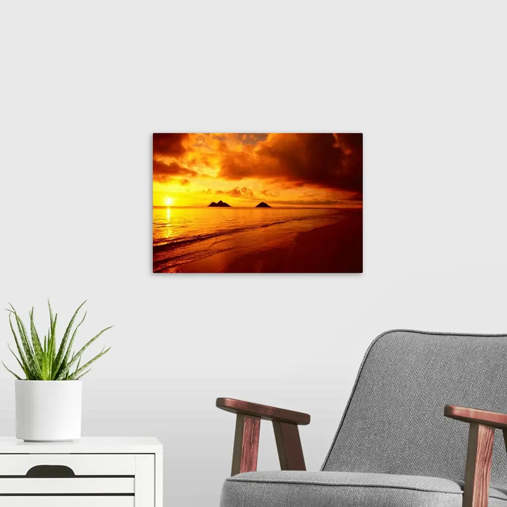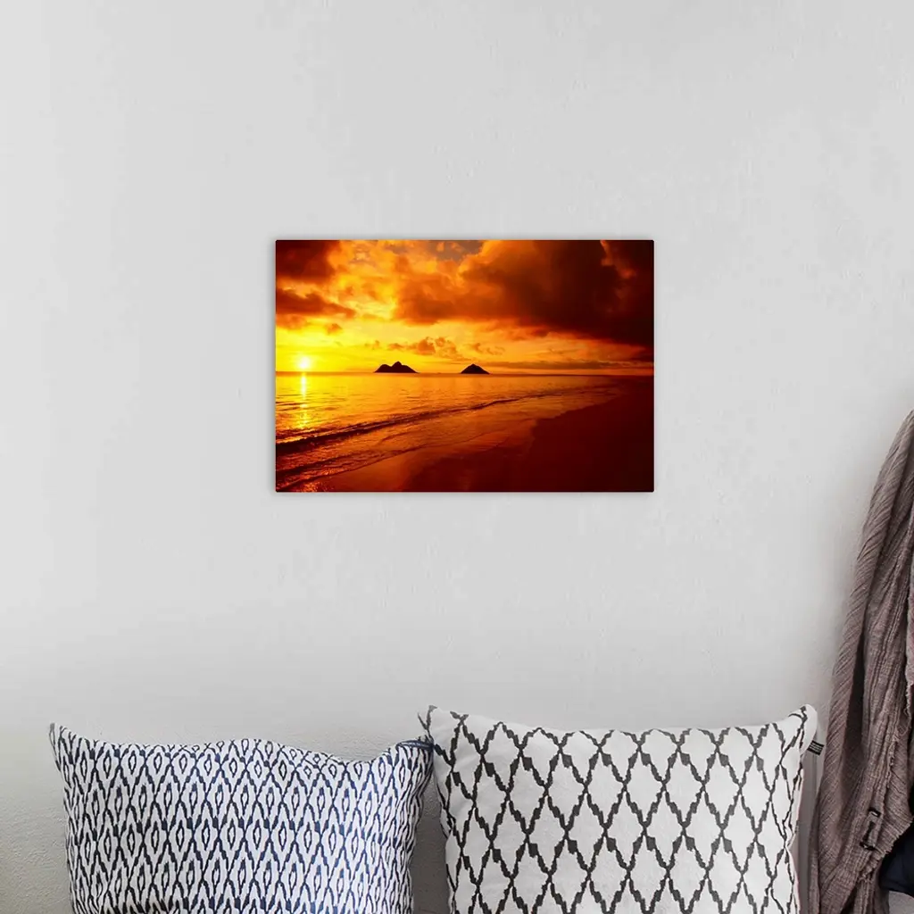 Hawaii, Oahu, Lanikai Beach, Orange Sunrise Over Tranquil Ocean wall art for home and office decor. Discover canvas art prints, photos, mural, big canvas art and framed wall art in GreatBigCanvas.com's varied collections.
