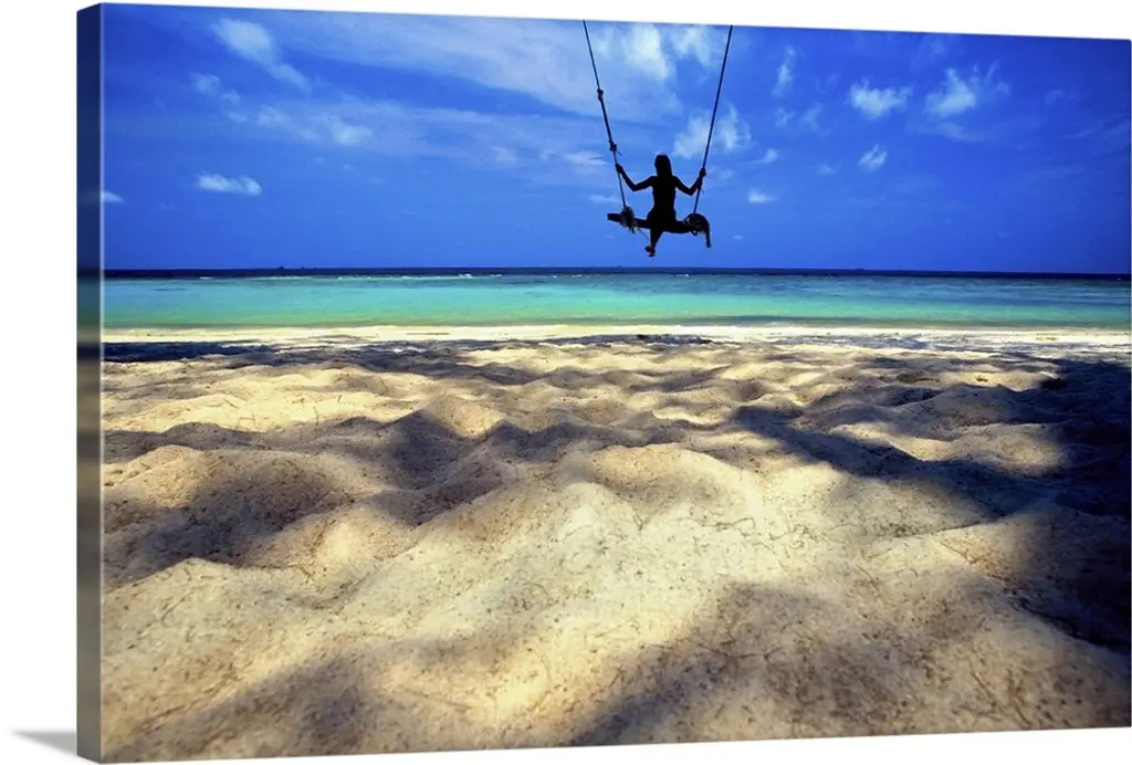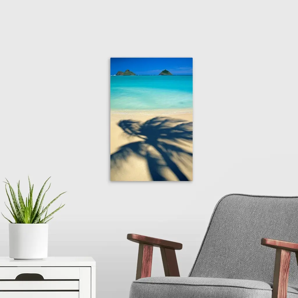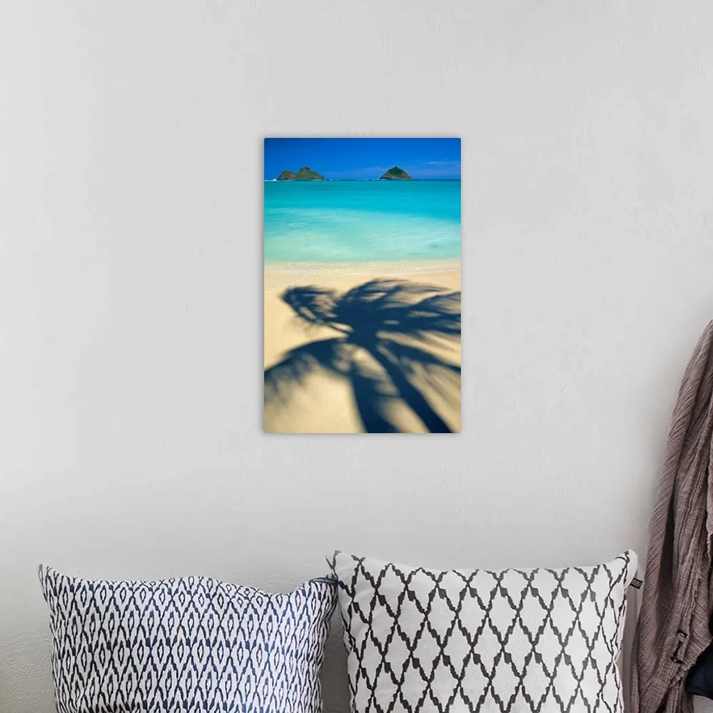 Portrait, oversized photograph of the shadow of a swaying palm tree on Lanikai Beach, the Mokulua Islands sit in the distance, over the clear blue waters of Oahu, Hawaii.