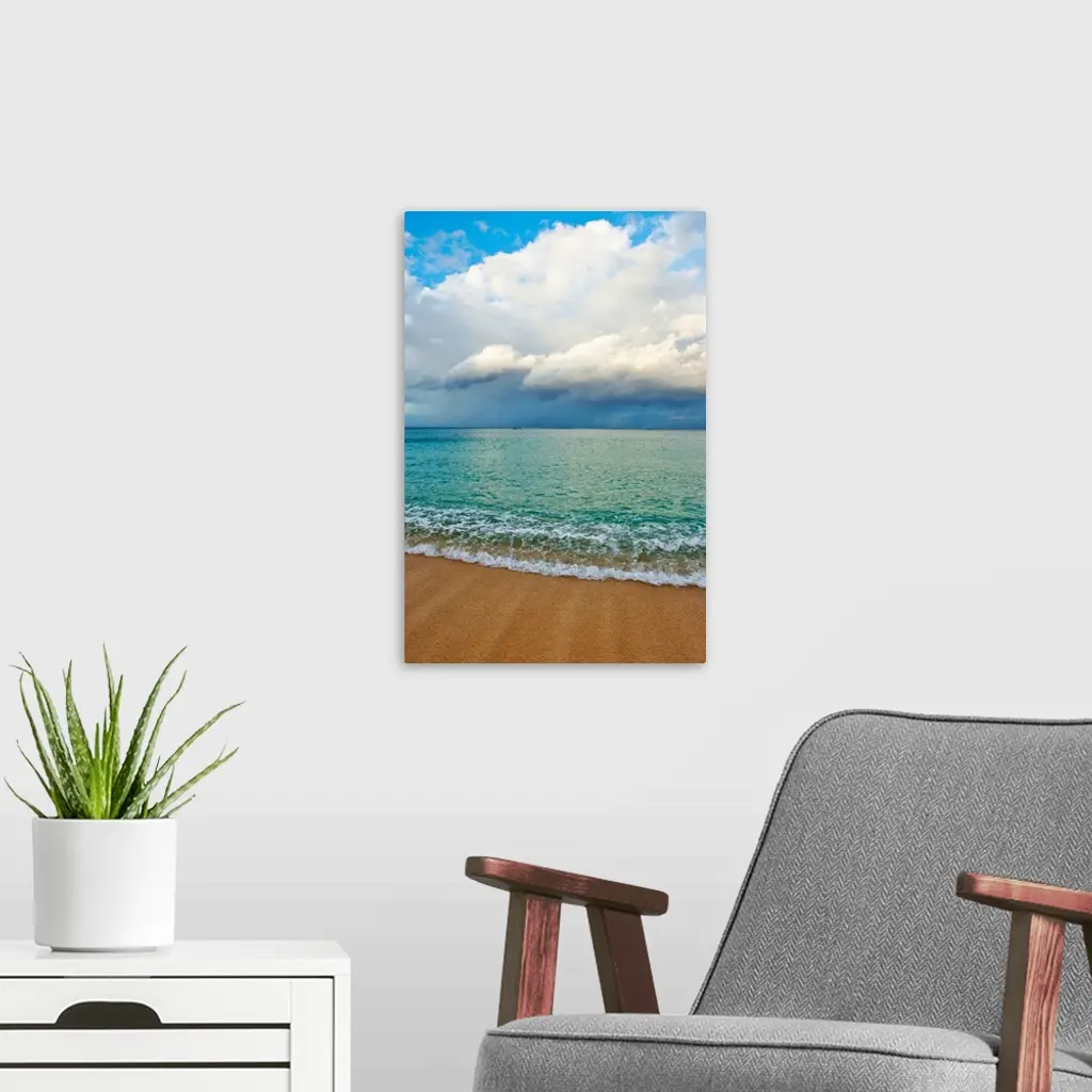 This photograph is taken on a beach in Hawaii of immense clouds that hang in the sky over a teal colored ocean.