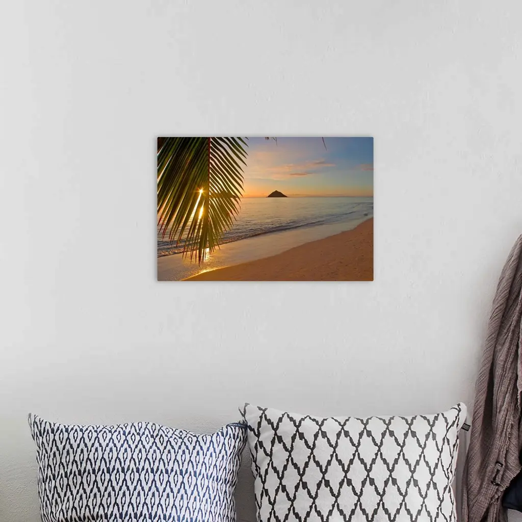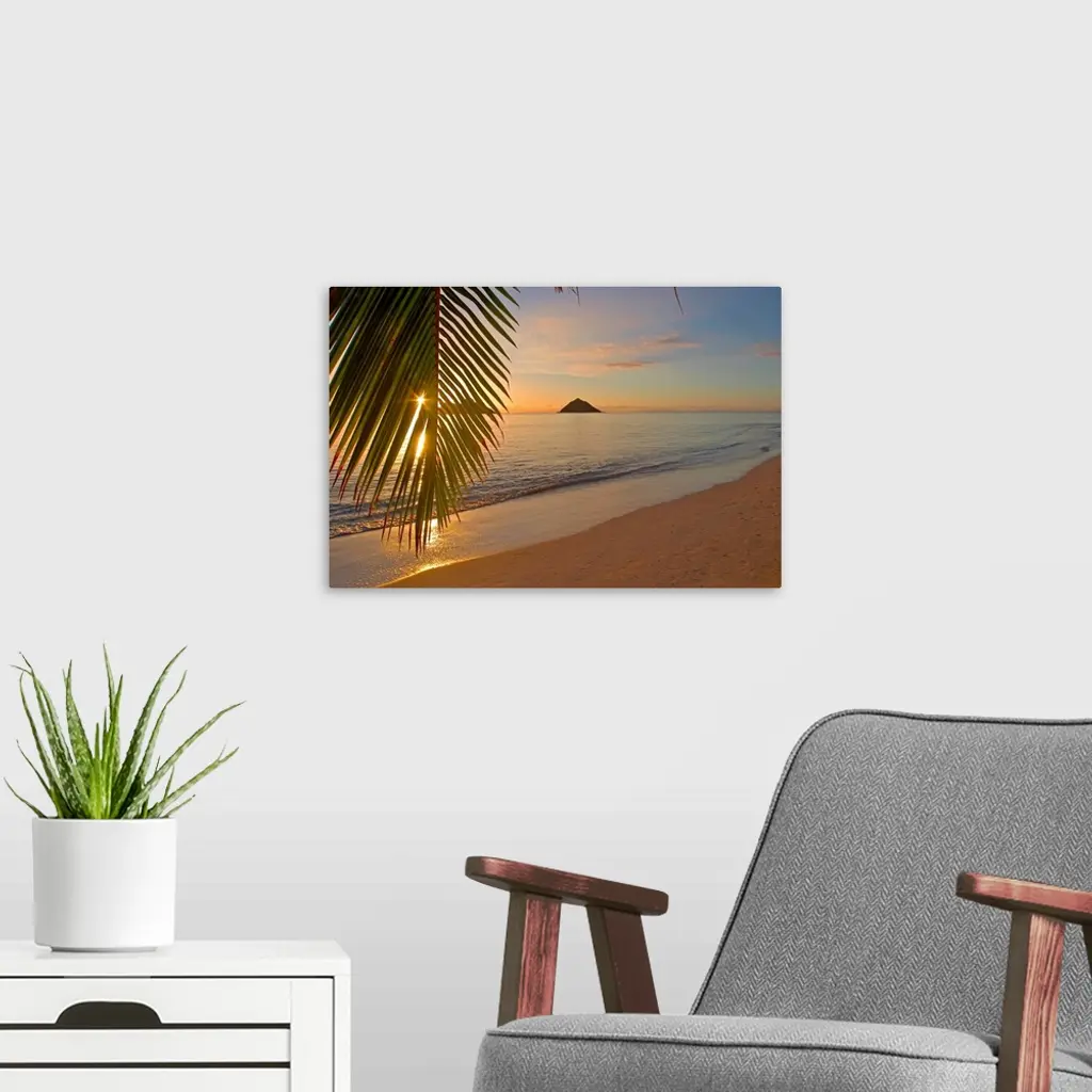 Photograph of beach at dawn with mountain silhouettes in distance. There is a single palm tree leaf hanging over half the image.