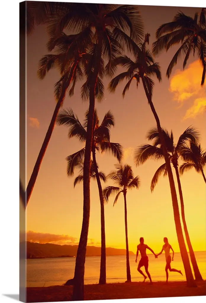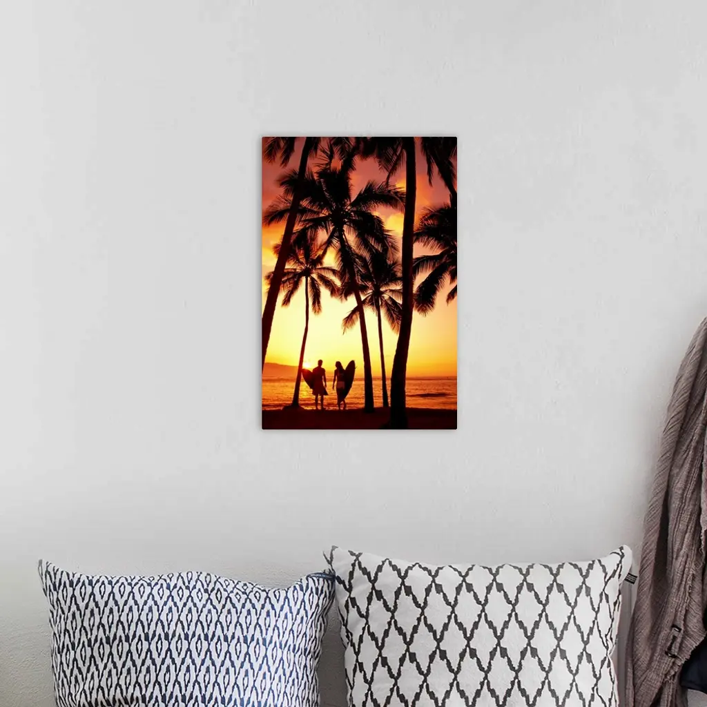 Hawaii, Oahu, North Shore, Couple Walk Under Palms With Surfboards At Sunset wall art for home and office decor. Discover canvas art prints, photos, mural, big canvas art and framed wall art in GreatBigCanvas.com's varied collections.