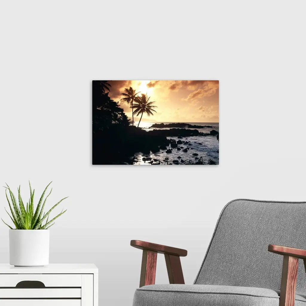 Hawaii, Oahu, North Shore, Rocky Shoreline With Palms Silhouetted At Sunset wall art for home and office decor. Discover canvas art prints, photos, mural, big canvas art and framed wall art in GreatBigCanvas.com's varied collections.