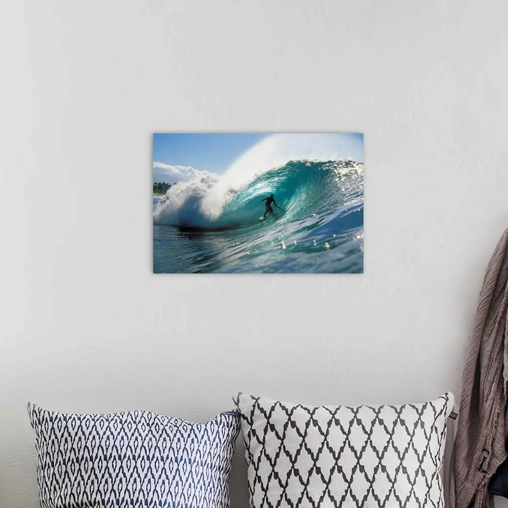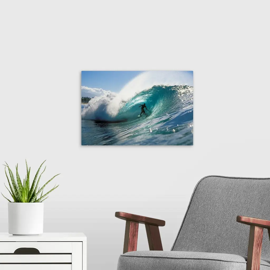 Oversized, landscape photograph of a surfer riding down the center of Pipeline Wave, in the blue waters of North Shore, Oahu in Hawaii.