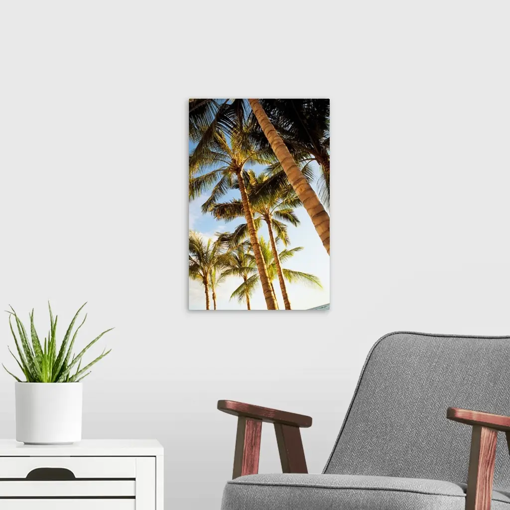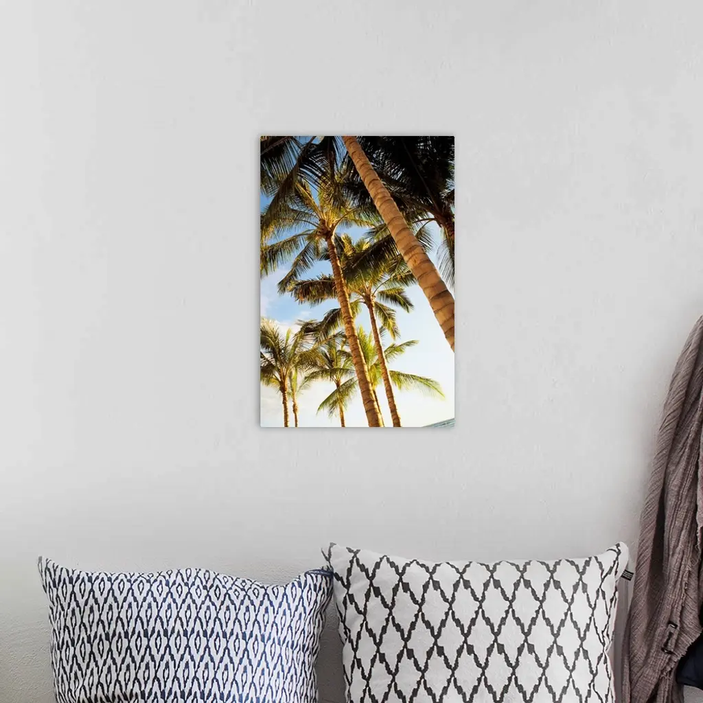 Hawaii, Oahu, Waikiki, Many Palm Trees Against Blue Sky From Below wall art for home and office decor. Discover canvas art prints, photos, mural, big canvas art and framed wall art in GreatBigCanvas.com's varied collections.