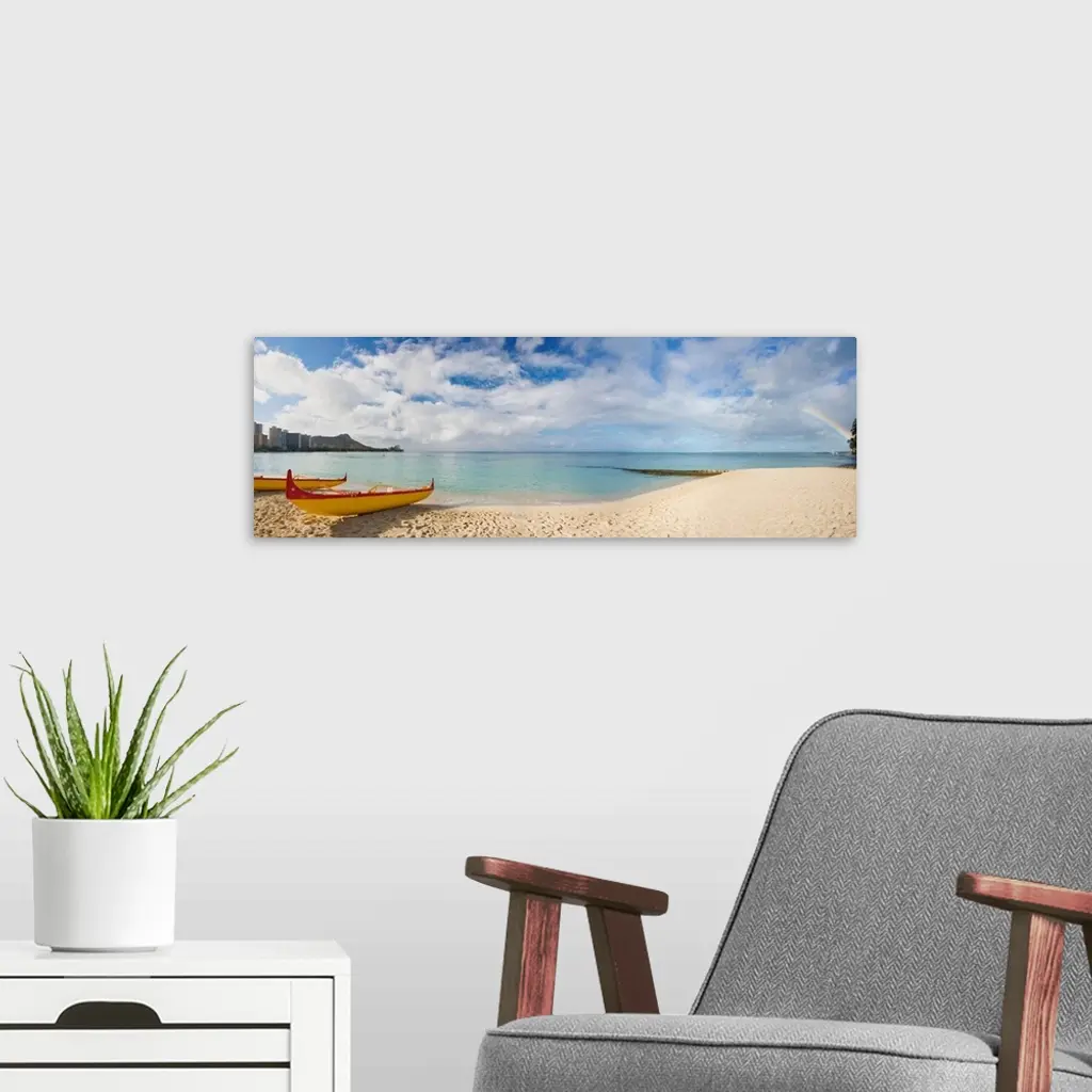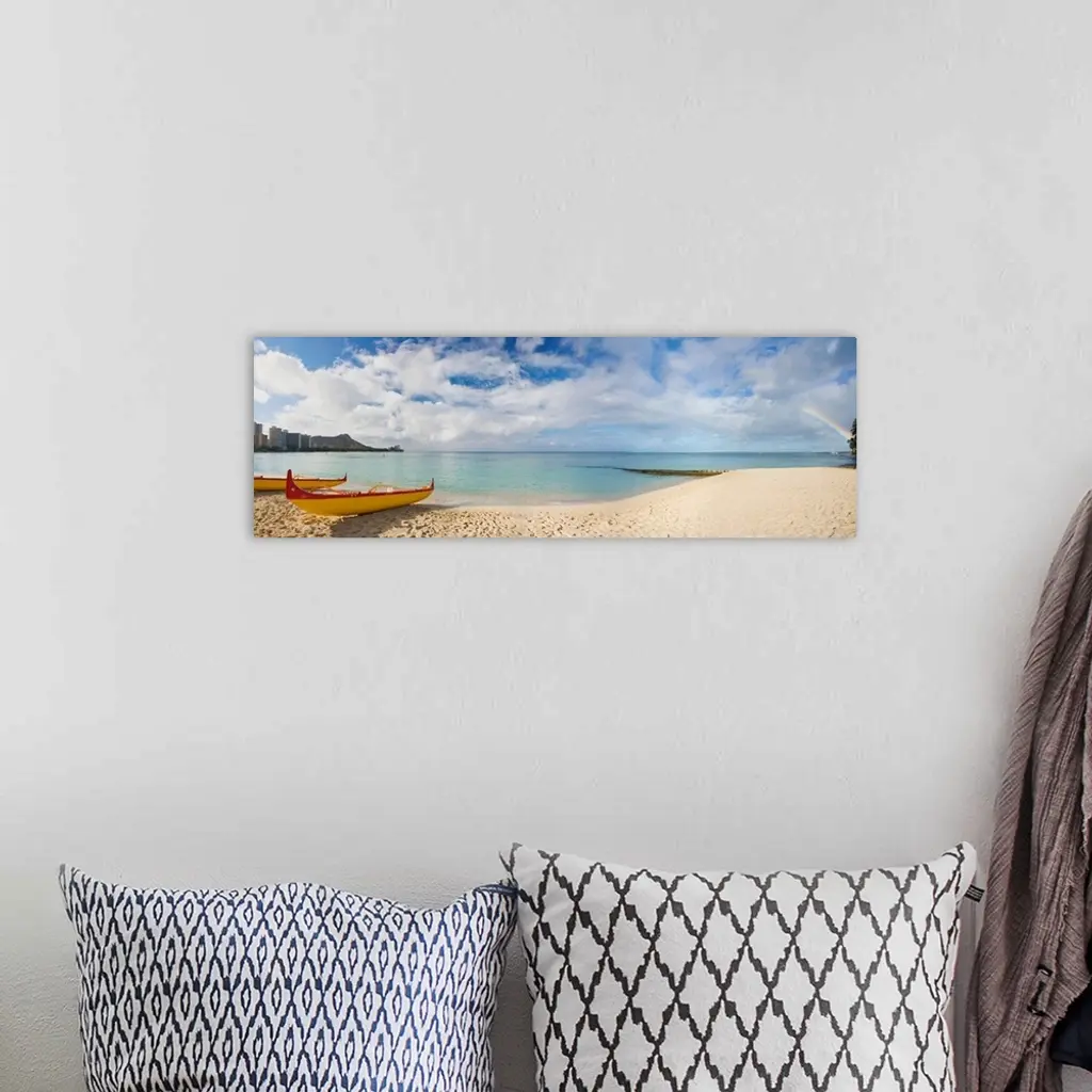 Hawaii, Oahu, Waikiki, Outrigger Canoes On The Beach wall art for home and office decor. Discover canvas art prints, photos, mural, big canvas art and framed wall art in GreatBigCanvas.com's varied collections.
