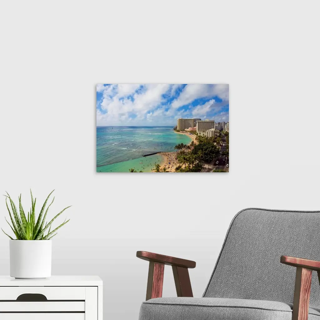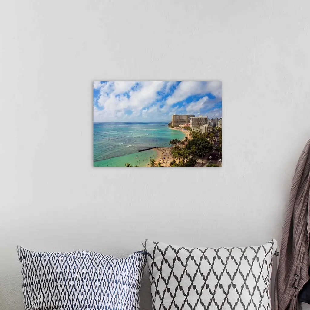 Hawaii, Oahu, Waikiki, View of the Pacific Ocean, Waikiki Beach, and famous hotels wall art for home and office decor. Discover canvas art prints, photos, mural, big canvas art and framed wall art in GreatBigCanvas.com's varied collections.