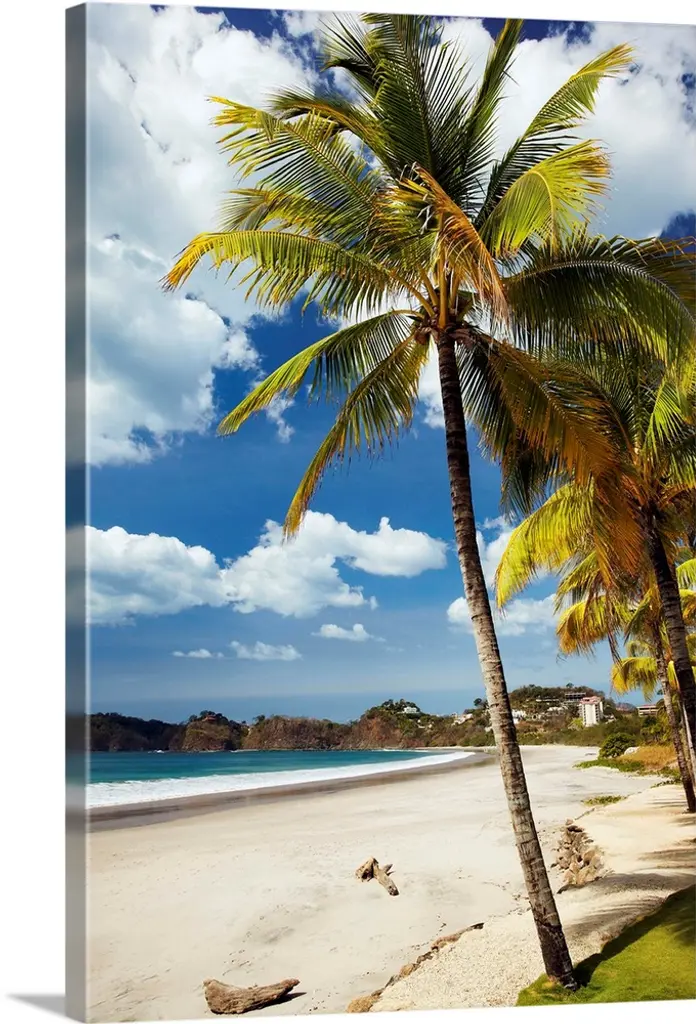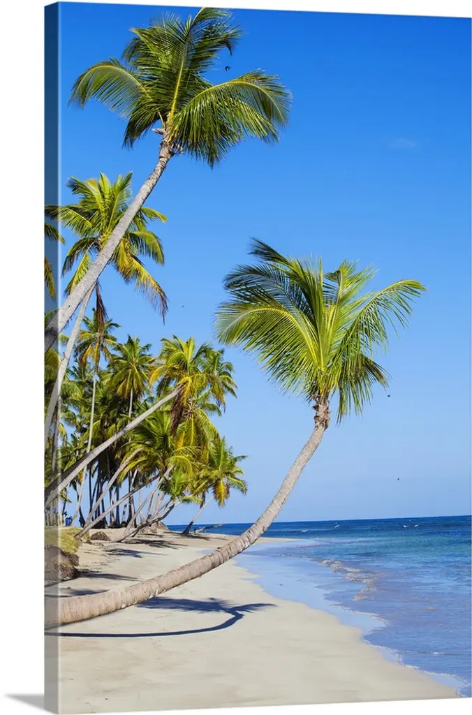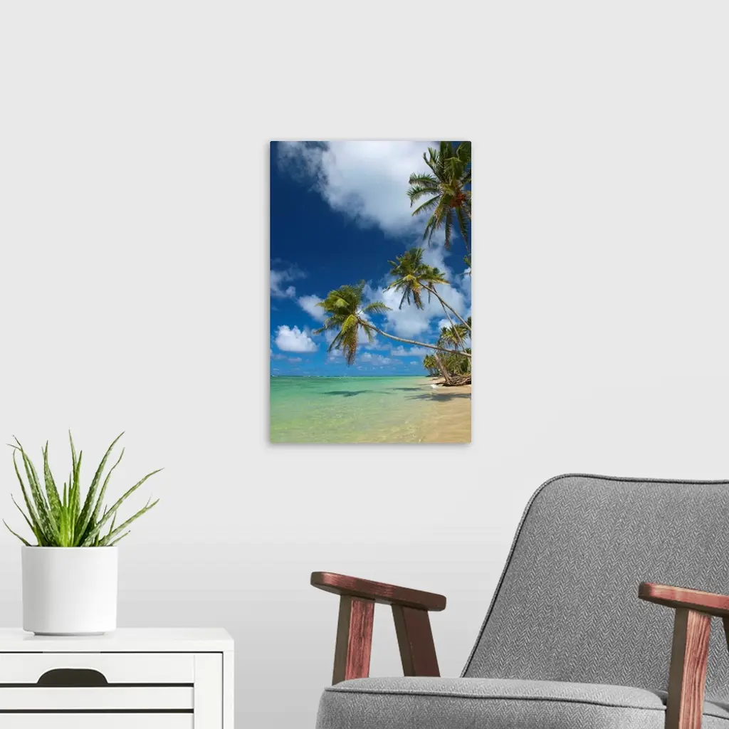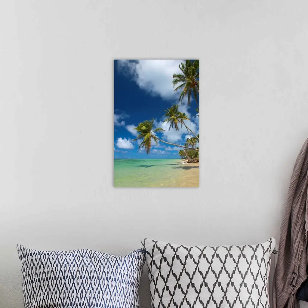 This large vertical piece consists of several palm trees that stretch over crystal clear ocean water.