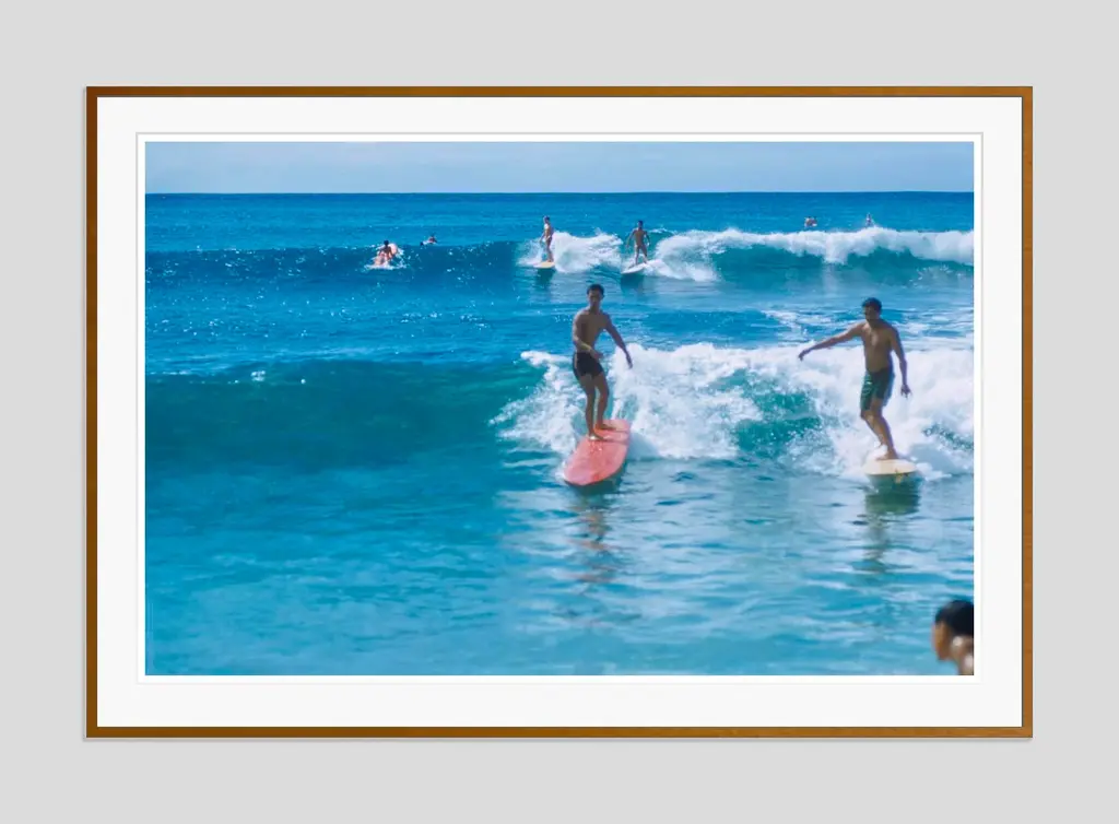Hawaiian Scenes 1957 Two surfers ride a wave, Hawaii, 1957. Toni Frissell Antoinette Frissell Bacon (March 10, 1907 – April 17, 1988), known as Toni Frissell, was an American photographer, known for her fashion photography, World War II photographs, and portraits of famous Americans, Europeans, children, and women from all walks of life. GALERIE PRINTS is delighted to bring you a selection of almost 250 of some of her most beautiful works. available as fine art archival photographic prints. paper size - 48 x 72" / 121 x 182 cm approximate frame size - 55 x 79" / 139 x 200 cm c print Framed in brown solid wood frame with mount and glazing - ready to hang Shipped securely, cost includes crating where necessary