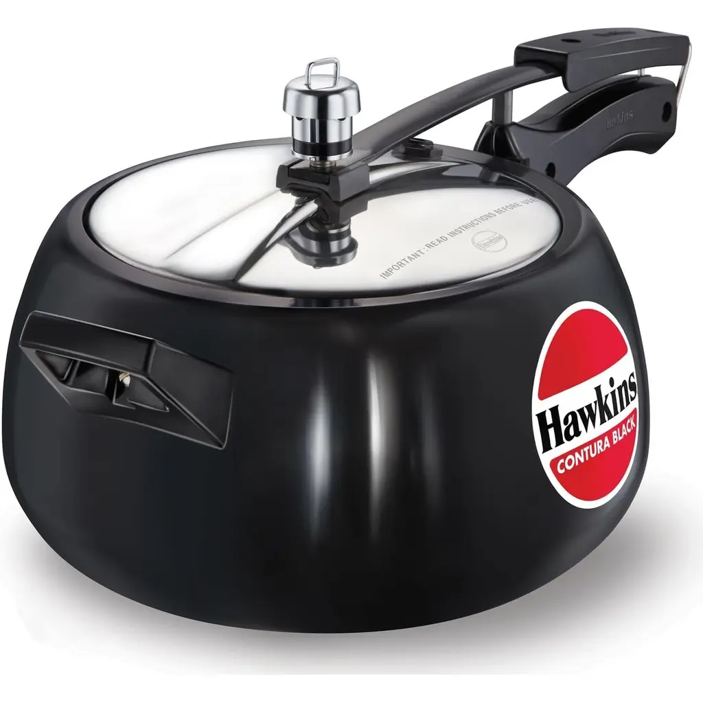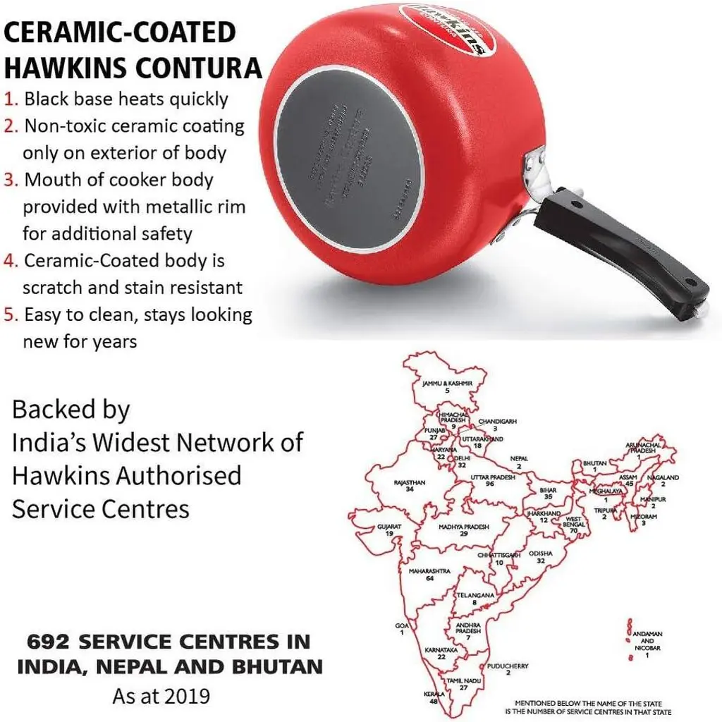 The Ceramic-Coated Hawkins Contura features a non-toxic ceramic coating on the exterior of the cooker body, which provides scratch and stain resistance. The mouth of the cooker body boasts a metallic rim for safety. The black base of the cooker ensures rapid heating for efficient cooking. Its unique curved body, facilitates easier stirring, improved visibility, and effortless removal of food. The stainless steel lid complements the ceramic-coated body, ensuring durability and safety. The inside-fitting lid enhances safety by pressure-locking, similar to the mechanism on a jetliner door. The improved pressure regulator not only ensures efficient cooking but also contributes to fuel savings. The valve strategically is placed under the lid handle bar to deflect steam safely downwards in case of operation. The gasket, with minimal steam exposure, lasts longer. Stay-cool handles with a sturdy pivot ensure durability. Recommended for gas stoves, this cooker is a reliable kitchen essential.