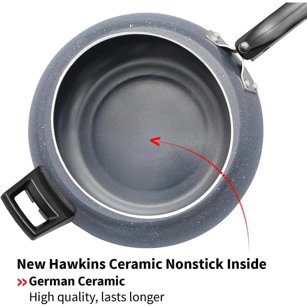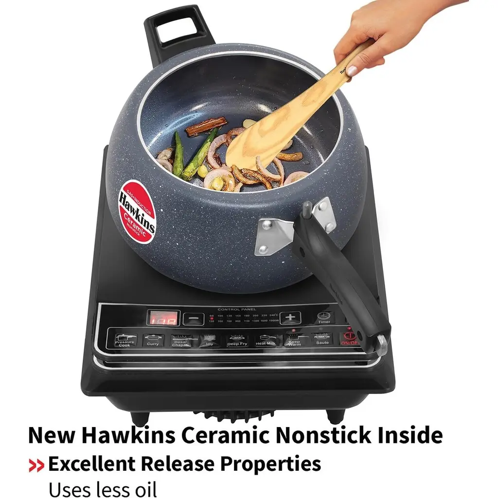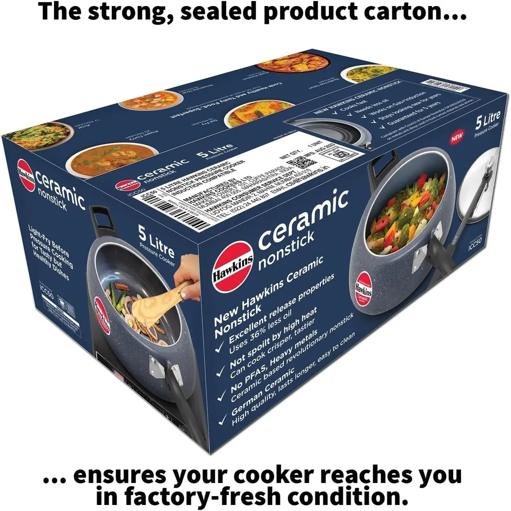 Meet the Hawkins Ceramic Nonstick Pressure Cooker boasting excellent release properties. This pressure cooker minimizes oil usage without compromising on flavor. Its nonstick coating, unfazed by high heat, promises crisper and tastier food. Crafted with high-quality German ceramic, the ceramic nonstick coating ensures durability, making it a reliable and long-lasting addition to your kitchen. A standout feature of the Hawkins Ceramic Nonstick Pressure Cooker is its commitment to health and safety. Free from PFAS and heavy metals, it provides a healthier option for your cooking endeavors. The exterior is adorned with an attractive ceramic coating that is not only pleasing to the eye but also resistant to scratches and stains, ensuring a fresh, new look for years to come. Performance takes center stage with this cooker, as it cooks fast and requires minimal oil. It effortlessly transitions between gas and induction stovetops, making it an adaptable choice for any kitchen setup.