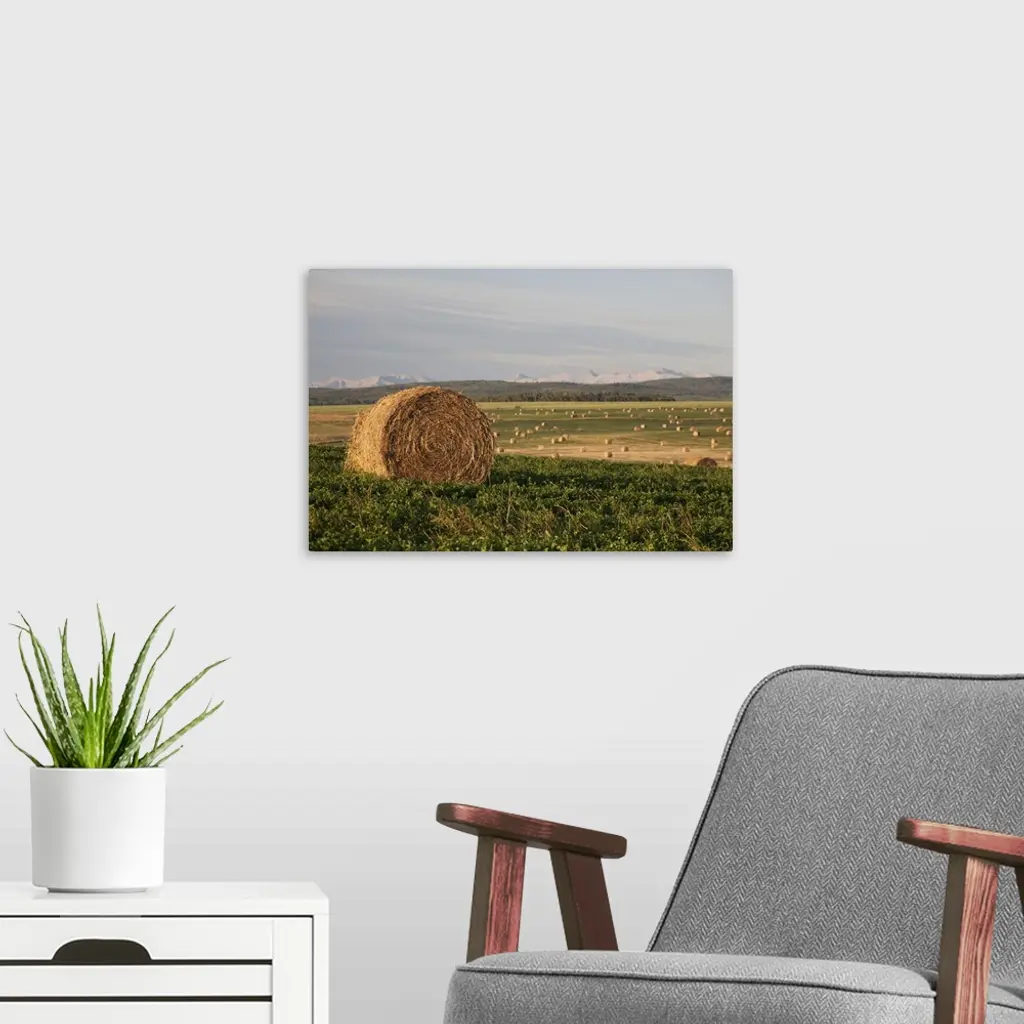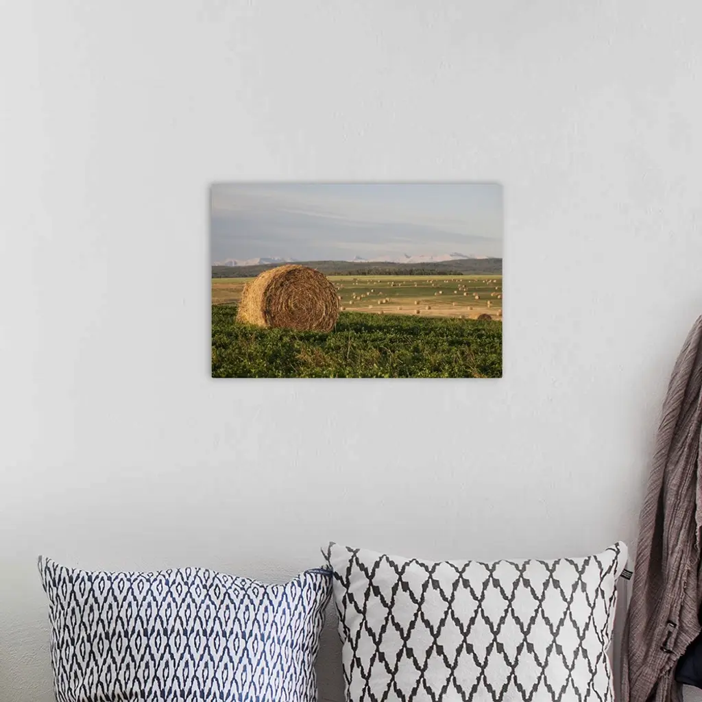 Hay Bales In A Field With Mountains In The Background At Sunrise; Alberta, Canada wall art for home and office decor. Discover canvas art prints, photos, mural, big canvas art and framed wall art in GreatBigCanvas.com's varied collections.