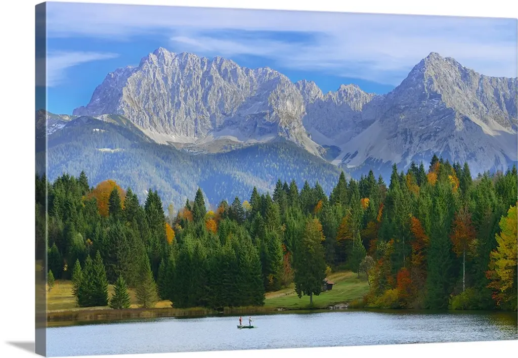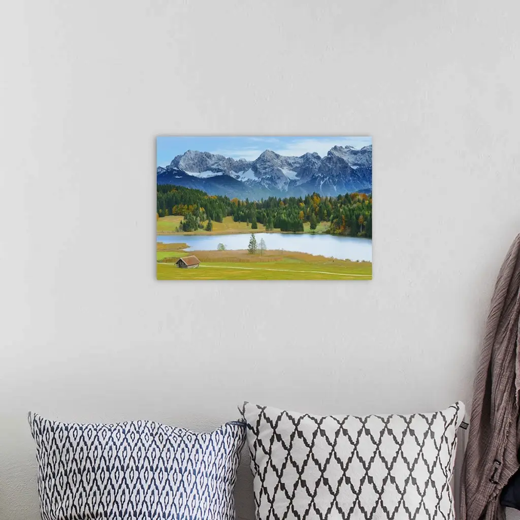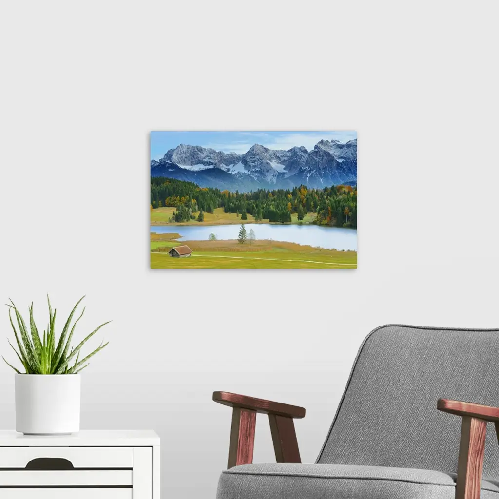 Hay Barn, Lake Geroldsee and Karwendel Mountain Range in Autumn, Werdenfelser Land, Upper Bavaria, Bavaria, Germany