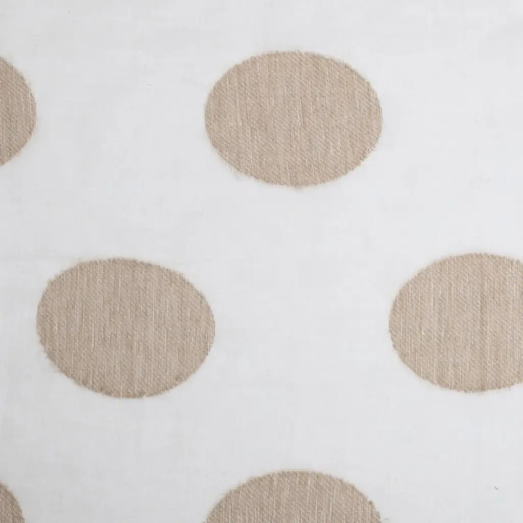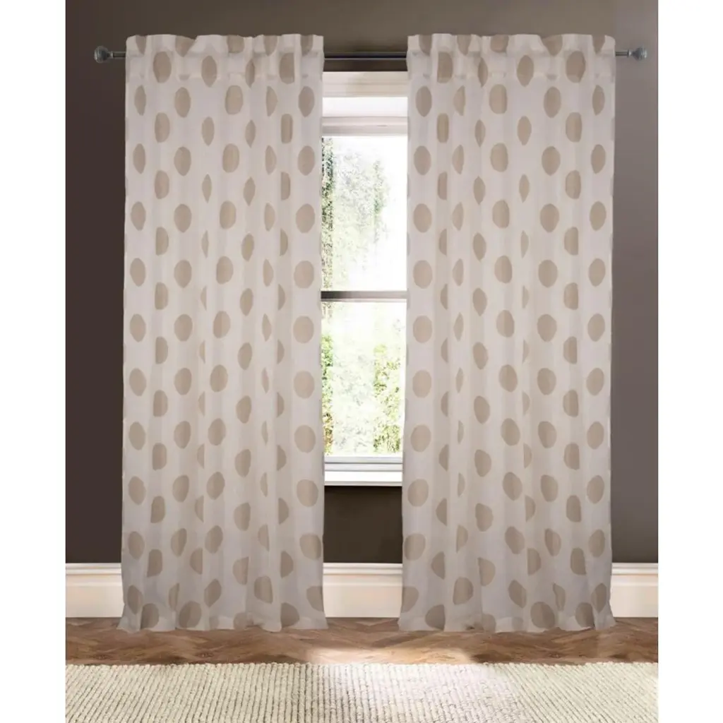 These beautiful natural + taupe polka dot curtains bring style + light. Featuring a sheer fabric, perfect for adding a pop of fun and sun to any room!