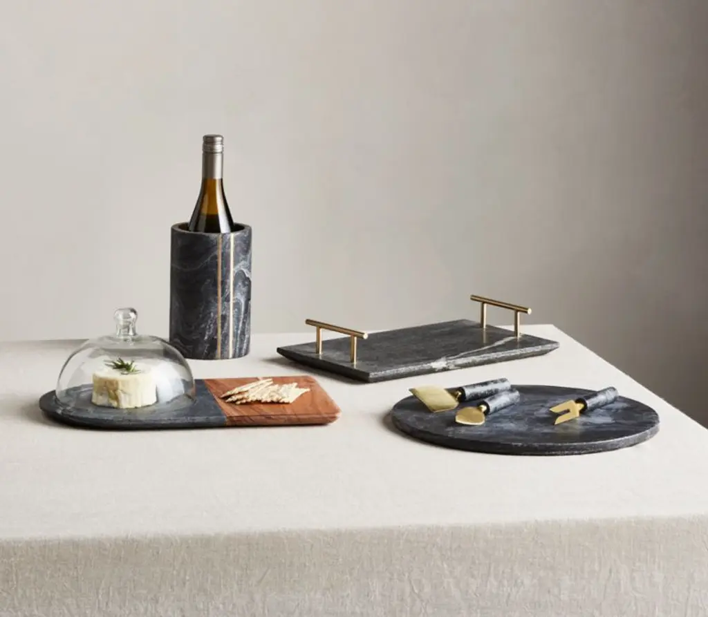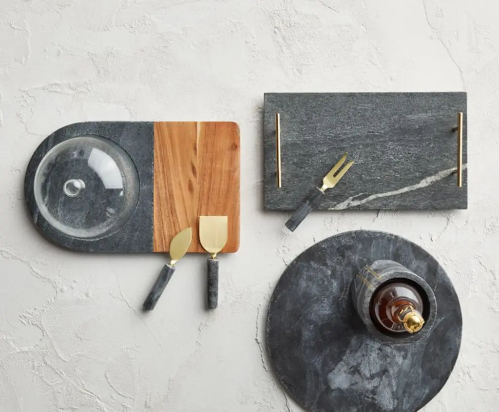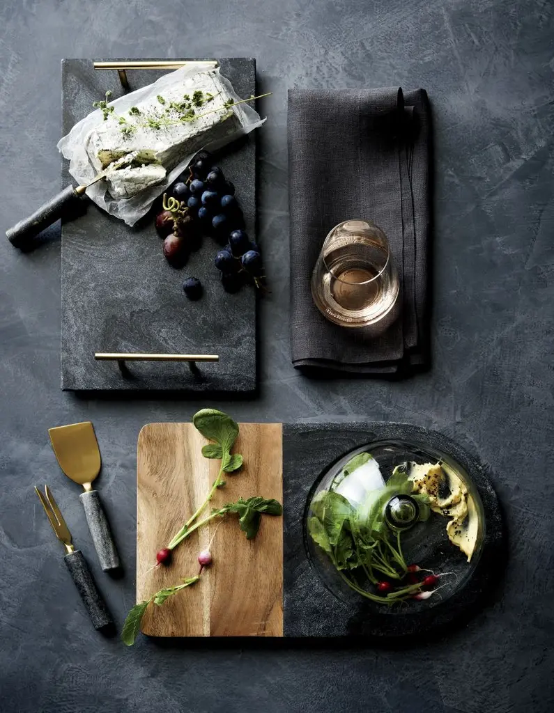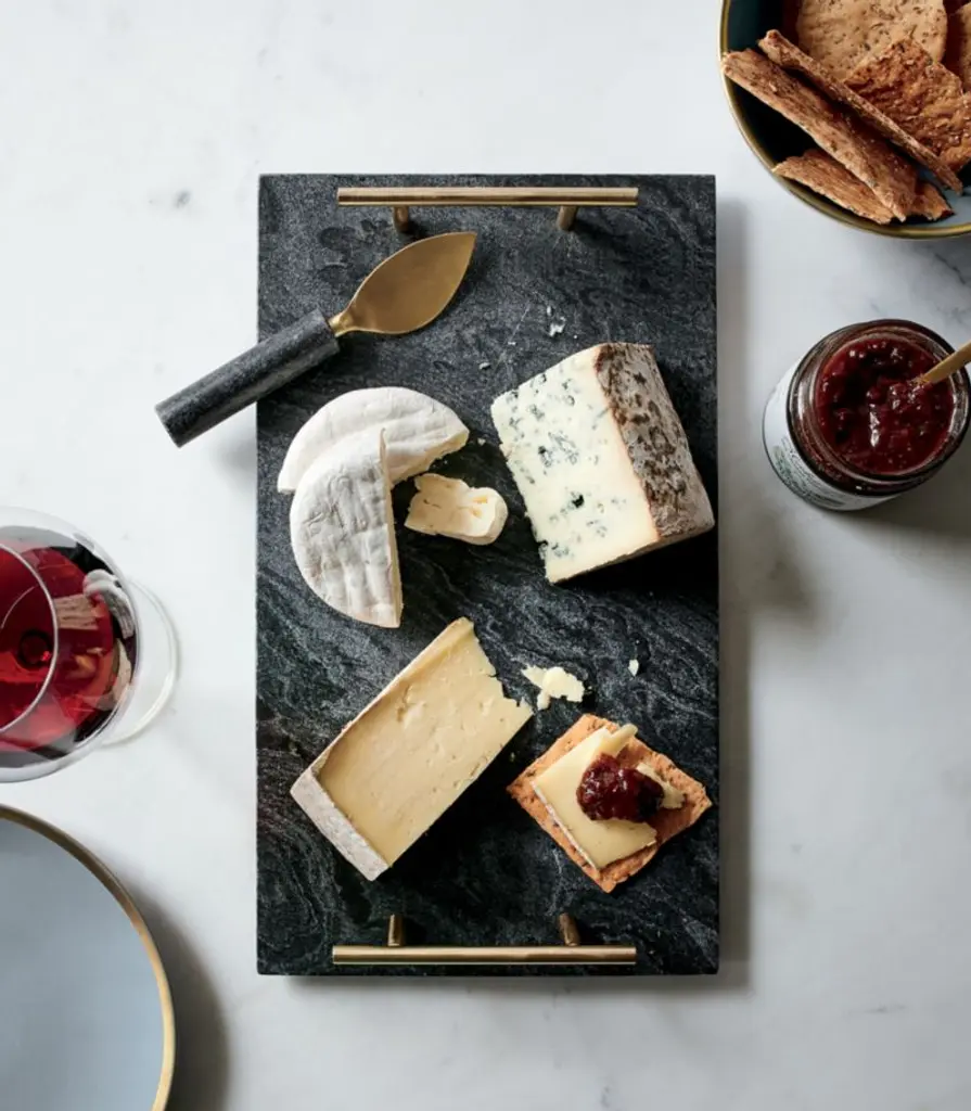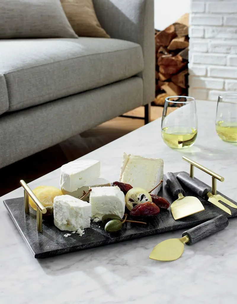 Gorgeous black marble, polished to showcase its natural color and unique veining fashions a stunning serving board for cheeses and charcuterie. Naturally cool to the touch, marble transfers heat away from cheeses and meats, preventing foodstuffs from becoming too warm. We just love the way creamy white cheeses, fresh fruit and crispy crackers look so appetizing in contrast to the dark, sleek surface.