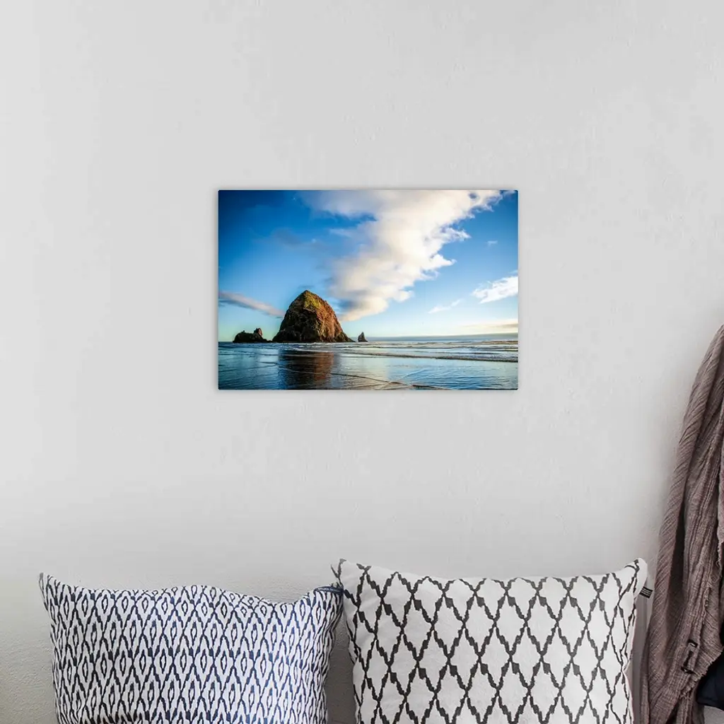 Panoramic photograph of Haystack Rock at golden hour, just before sunset, Cannon Beach, Oregon.