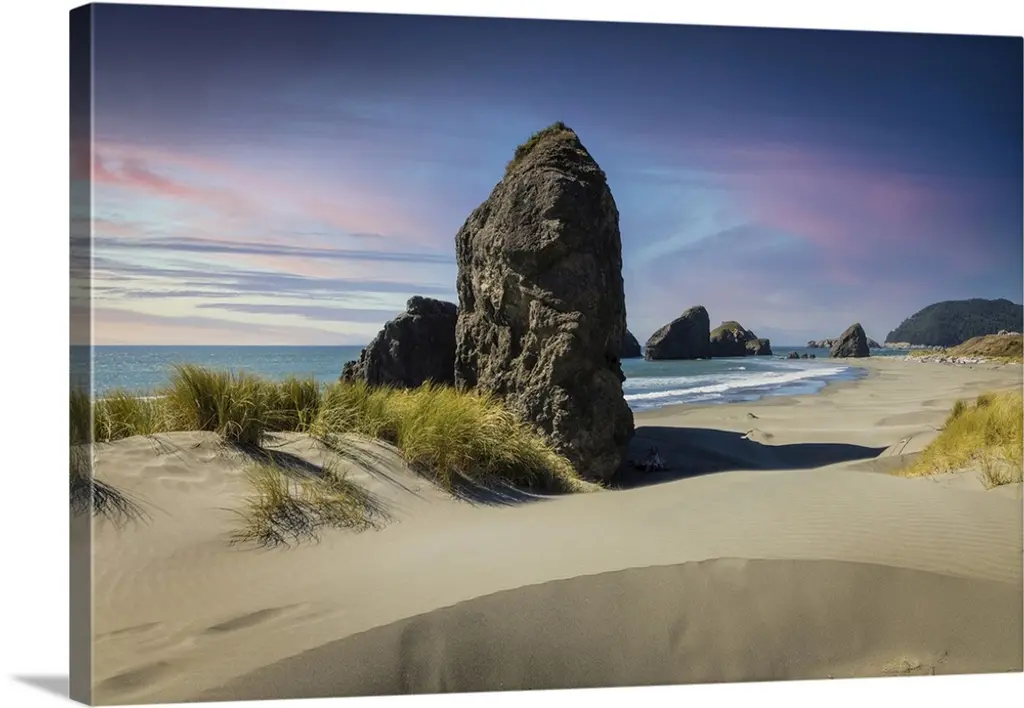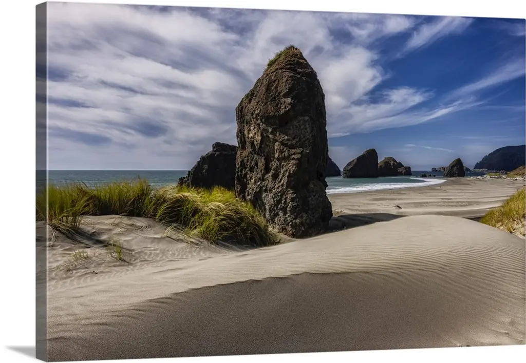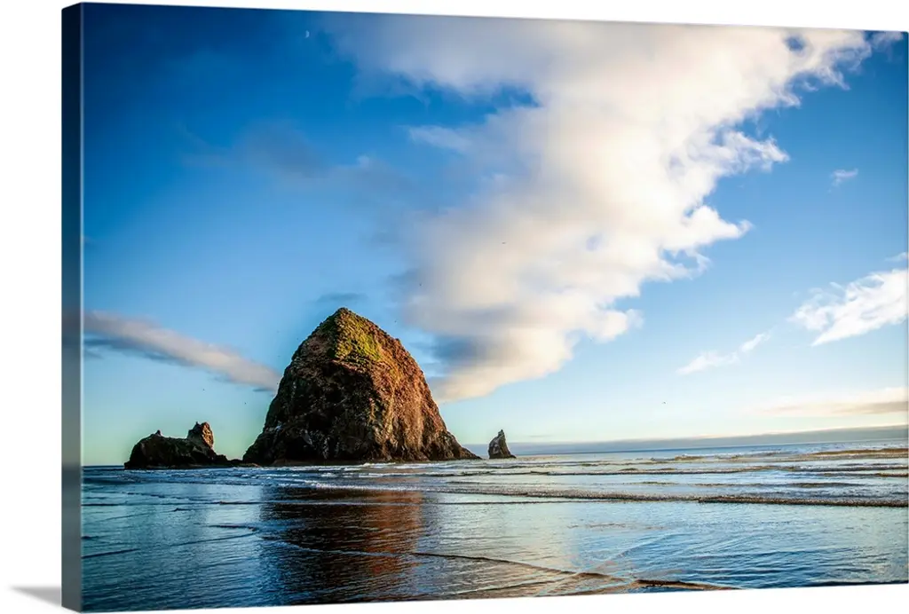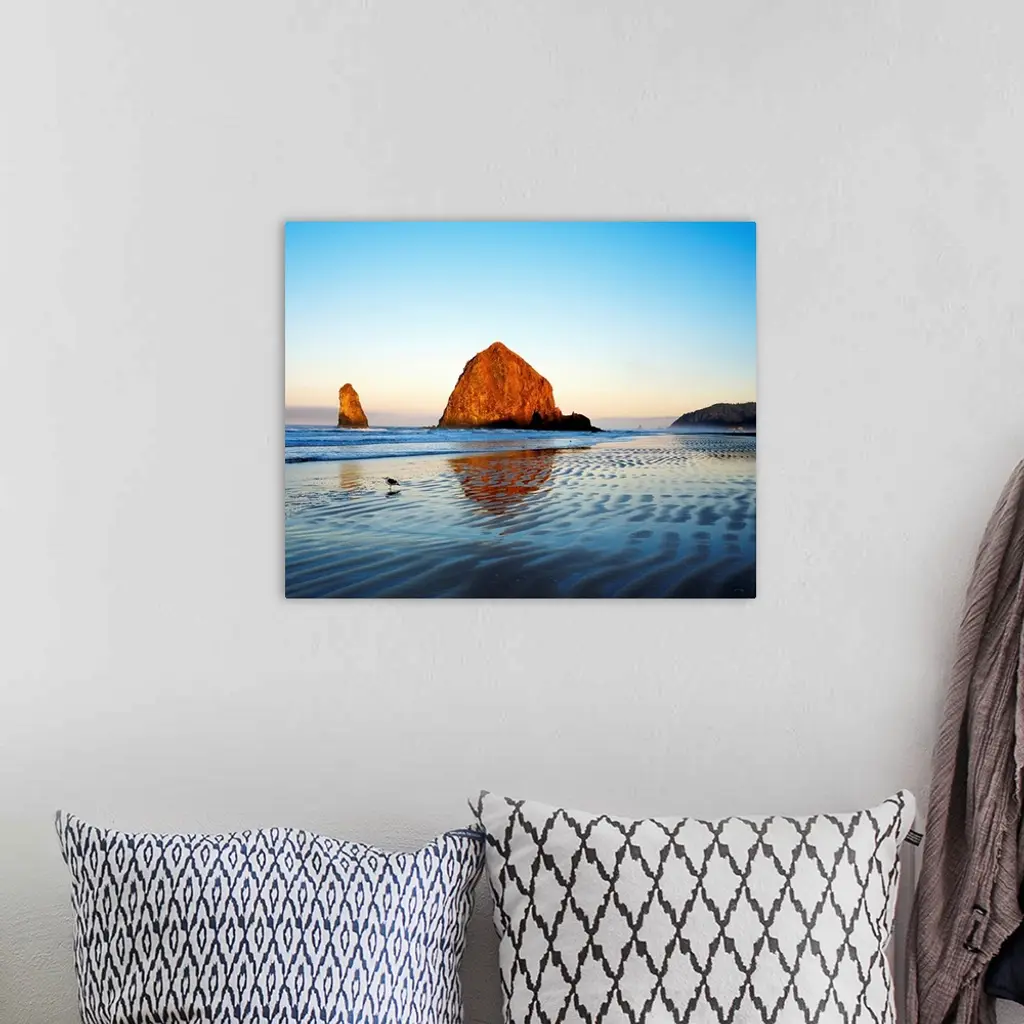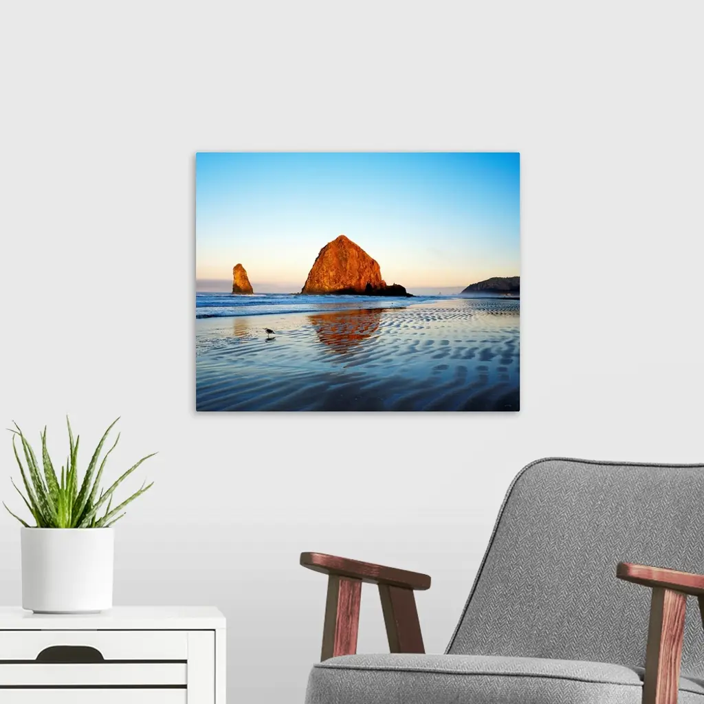 Giant photograph taken of a huge rock sitting on the edge of a beach on a sunny day. In the background the ocean gently crashes into the beach towards a lone bird in the foreground.