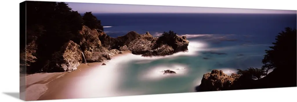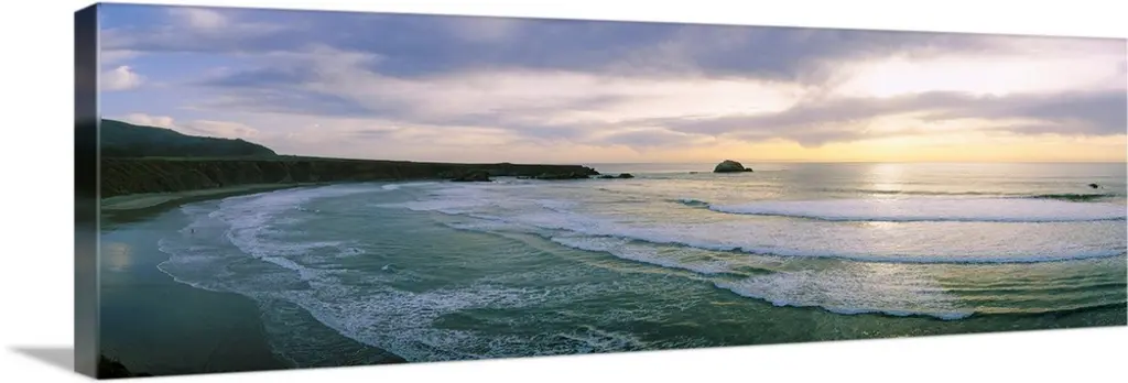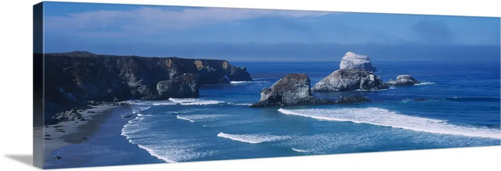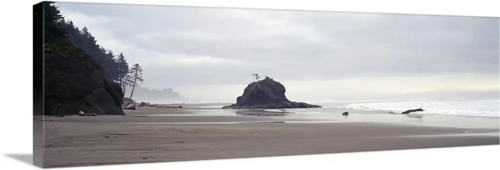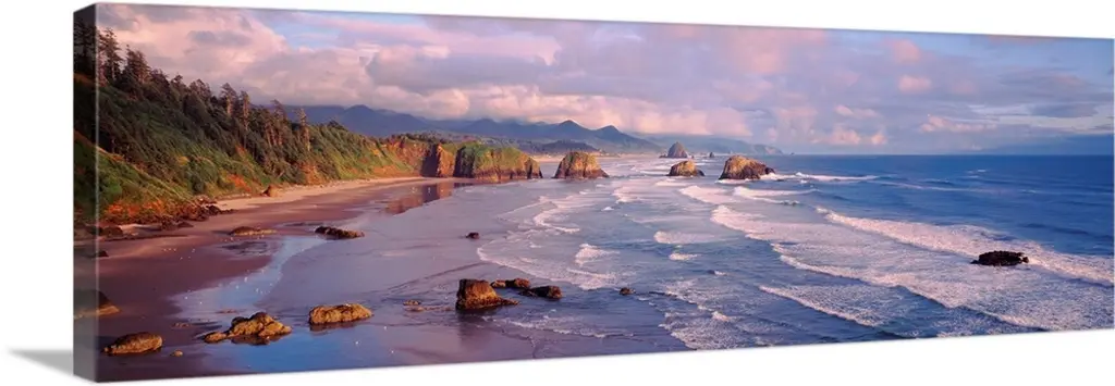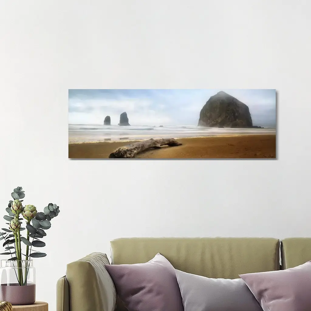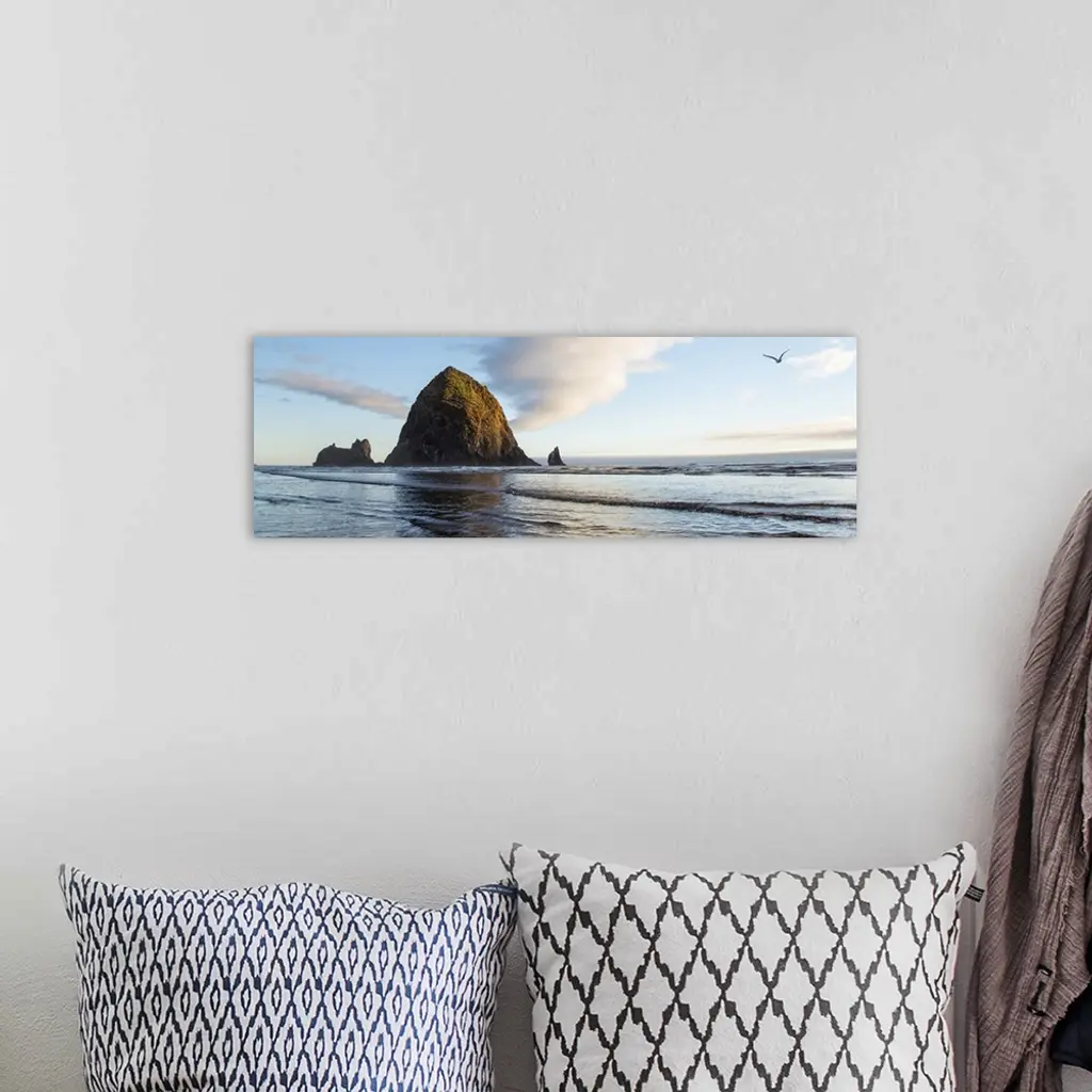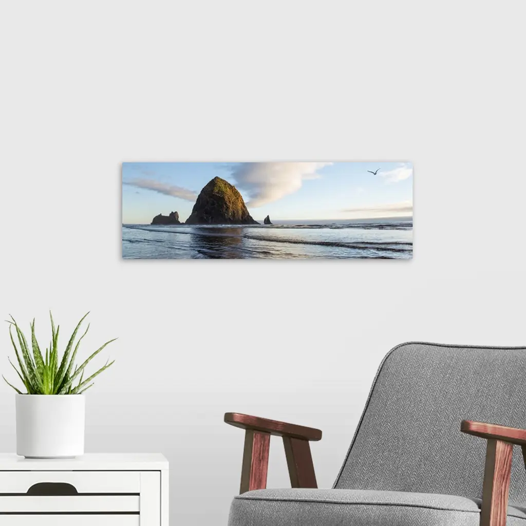 Panoramic photograph of Haystack Rock with a bird flying in the sky at Cannon Beach.
