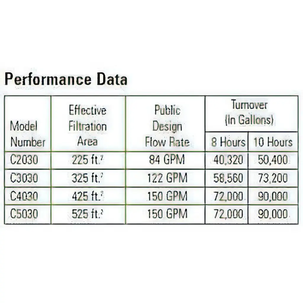The Hayward W3C5030 SwimClear Cartridge Pool Filter is a top-tier, large capacity pool filter designed to provide maximum efficiency and superior water clarity with minimal maintenance. With a sizable 525 square foot filtration area, it stands out as an ideal choice for pool owners looking to maintain a clean and healthy swimming environment. Here’s a detailed overview of its features and benefits:Extensive Filtration Capacity: The SwimClear features a large 525 square foot filtration surface area, which enables it to handle high amounts of dirt and debris, reducing the frequency of cleanings and maintaining clearer water for longer periods.High Flow Rates: Engineered to support high flow rates with minimal pressure drop, this filter ensures optimal performance of your pool system, allowing for quicker pool turnover rates. This efficiency helps in reducing energy costs as the pump needs to work less strenuously.Durable Construction: Built with durable, reinforced thermoplastic, the W3C5030 SwimClear stands up to the harshest pool chemicals and weather conditions, offering longevity and reliability. This robust construction ensures that the filter will serve your pool needs for years to come without significant wear and tear.Easy Maintenance: The SwimClear is designed for easy and hassle-free maintenance. It is equipped with a top manifold configuration that provides excellent filtration and allows for quick and easy cartridge removal. The filter's design means that cleaning is required less frequently and is more straightforward when necessary.Energy Efficient: By optimizing water flow and reducing hydraulic resistance, this filter helps conserve energy. This efficiency translates to lower operational costs and a smaller environmental impact over the life of the product.Improved Water Quality: With its superior filtration capabilities, the SwimClear effectively removes both large debris and finer particles, improving water clarity and purity. This level of filtration also helps in reducing the amount of chlorine needed, which can make the swimming experience more pleasant and less harsh on skin and eyes.Space Saving Design: Despite its large filtration area, the SwimClear is designed to be compact, making it suitable for installations where space might be limited. This feature allows more pool owners to benefit from high-capacity filtration without requiring a large footprint.Versatility: The Hayward W3C5030 is versatile and suitable for all types of in-ground pools, spas, and water features, regardless of size and shape. It is a perfect match for residential pools that require high levels of cleanliness and low maintenance.The Hayward W3C5030 SwimClear Cartridge Pool Filter is a powerful, efficient solution for keeping pool water clean, clear, and inviting. With its advanced features and strong performance, it sets itself apart as a premier choice for homeowners looking to enhance their pool maintenance routine.