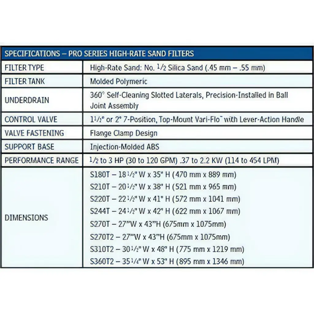 The FILTER-SAND, 24 IN, TOP MT, W VLV-OL is a reliable and efficient pool filter designed to keep your pool water clean and clear. Its multilateral underdrain assembly features precision-engineered, self-cleaning 360° slotted laterals for totally balanced flow and backwashing, ensuring that your pool stays sparkling clean. The integral top diffuser ensures even distribution of water over the top of the sand media bed for optimal filtration. The unitized, corrosion-proof filter tank is molded of rugged, colorfast polymeric material, making it weather-resistant and dependable. The 6-position control valve with an easy-to-use lever-action handle lets you easily switch between any of the valve/filter functions for maximum control. The large pressure sand/water drain allows for rapid winterizing or servicing, making maintenance a breeze. Choose the FILTER-SAND, 24 IN, TOP MT, W VLV-OL for a reliable and efficient pool filtration solution.