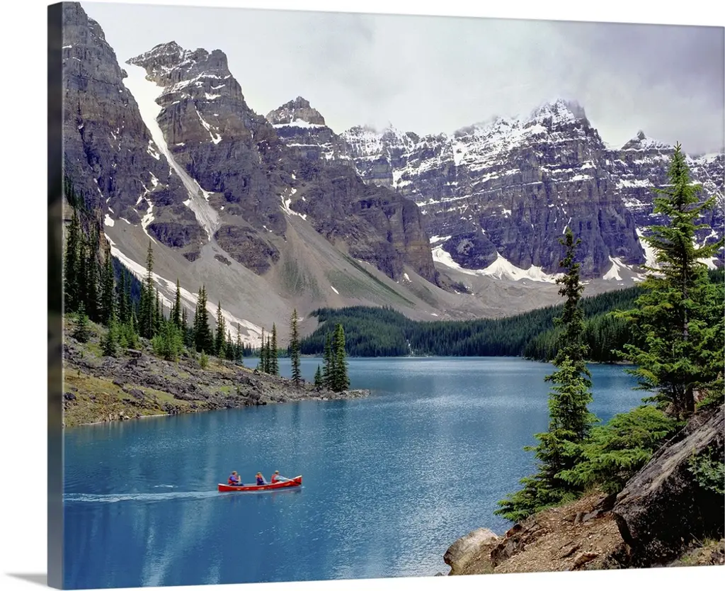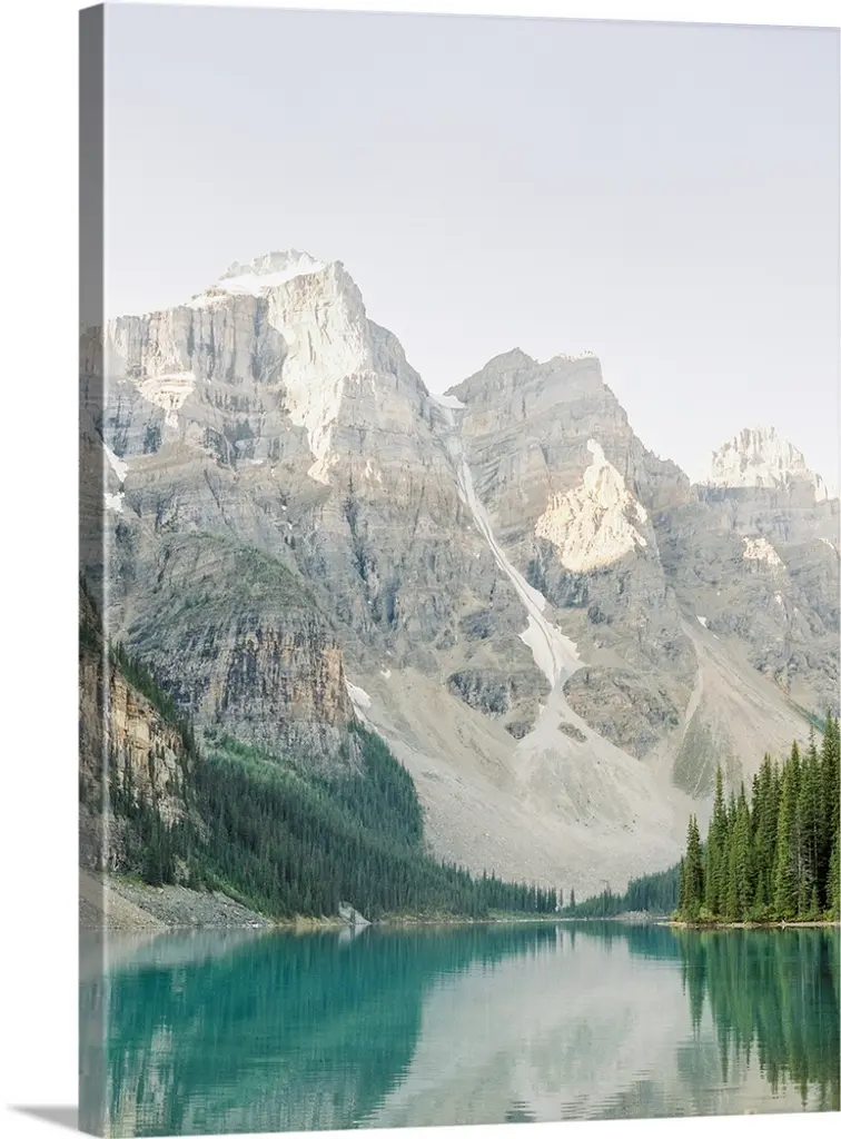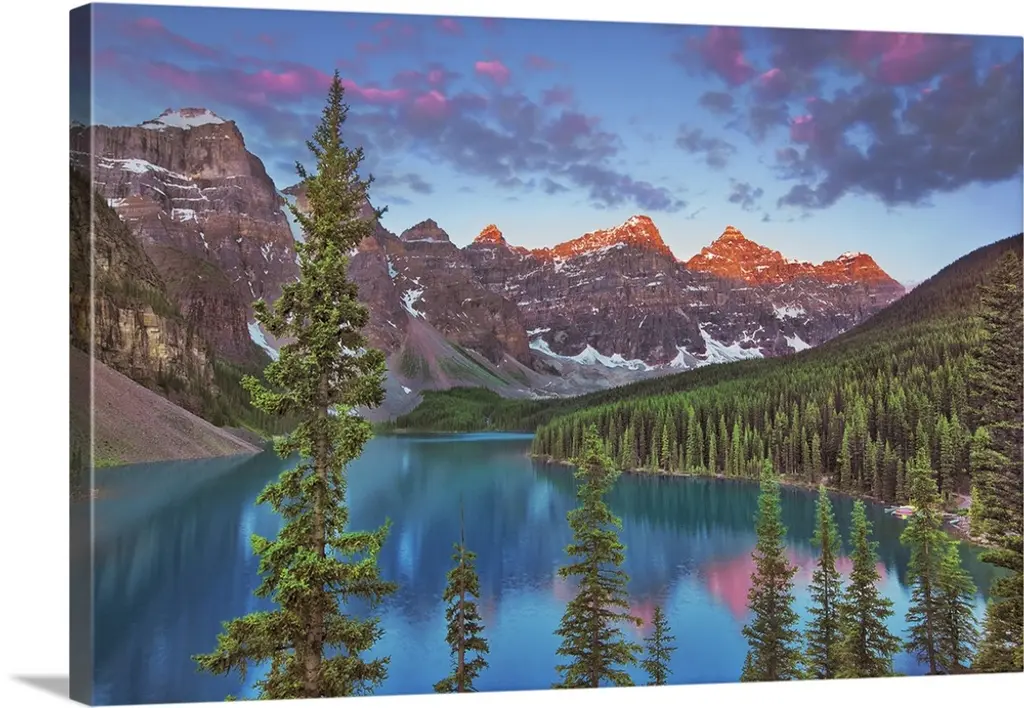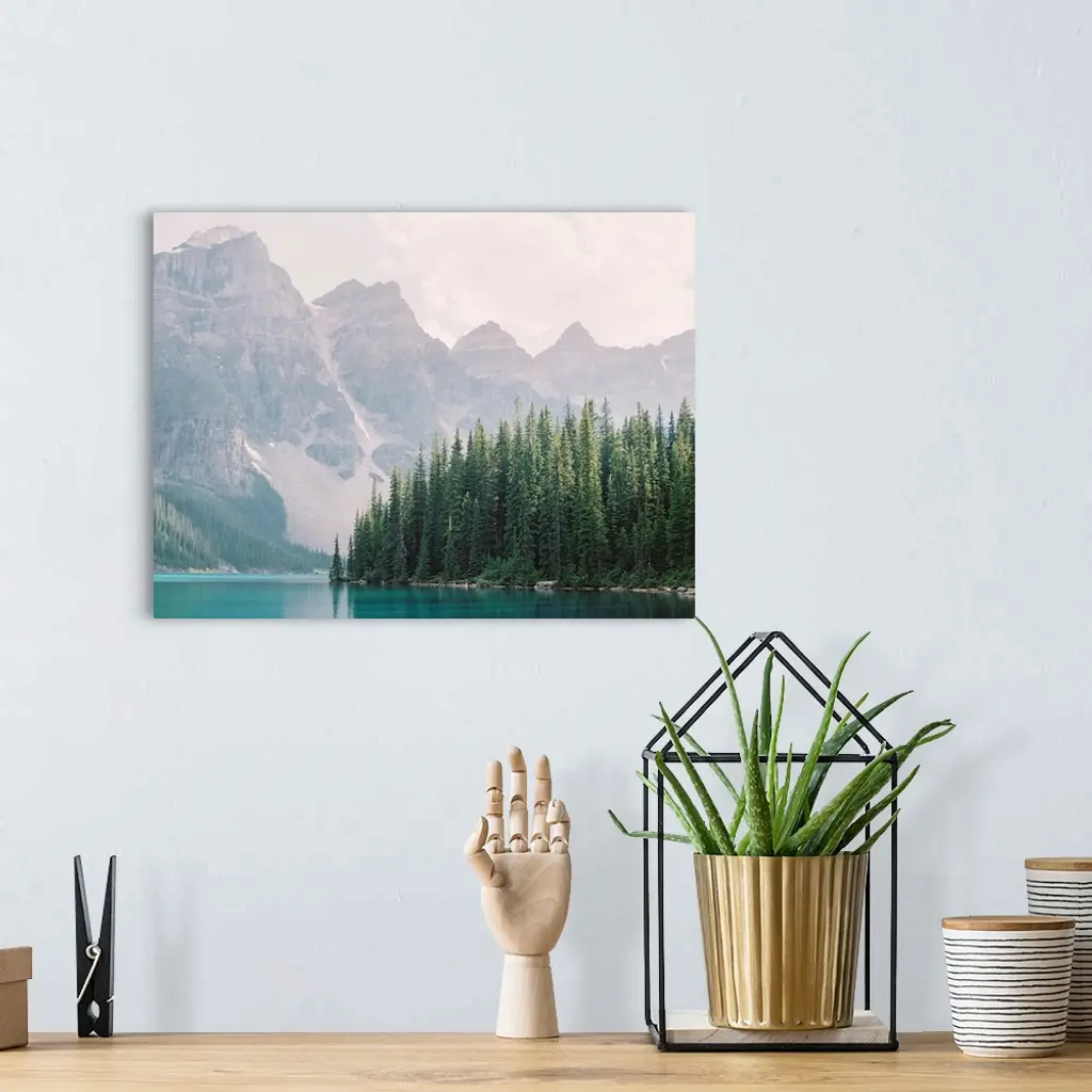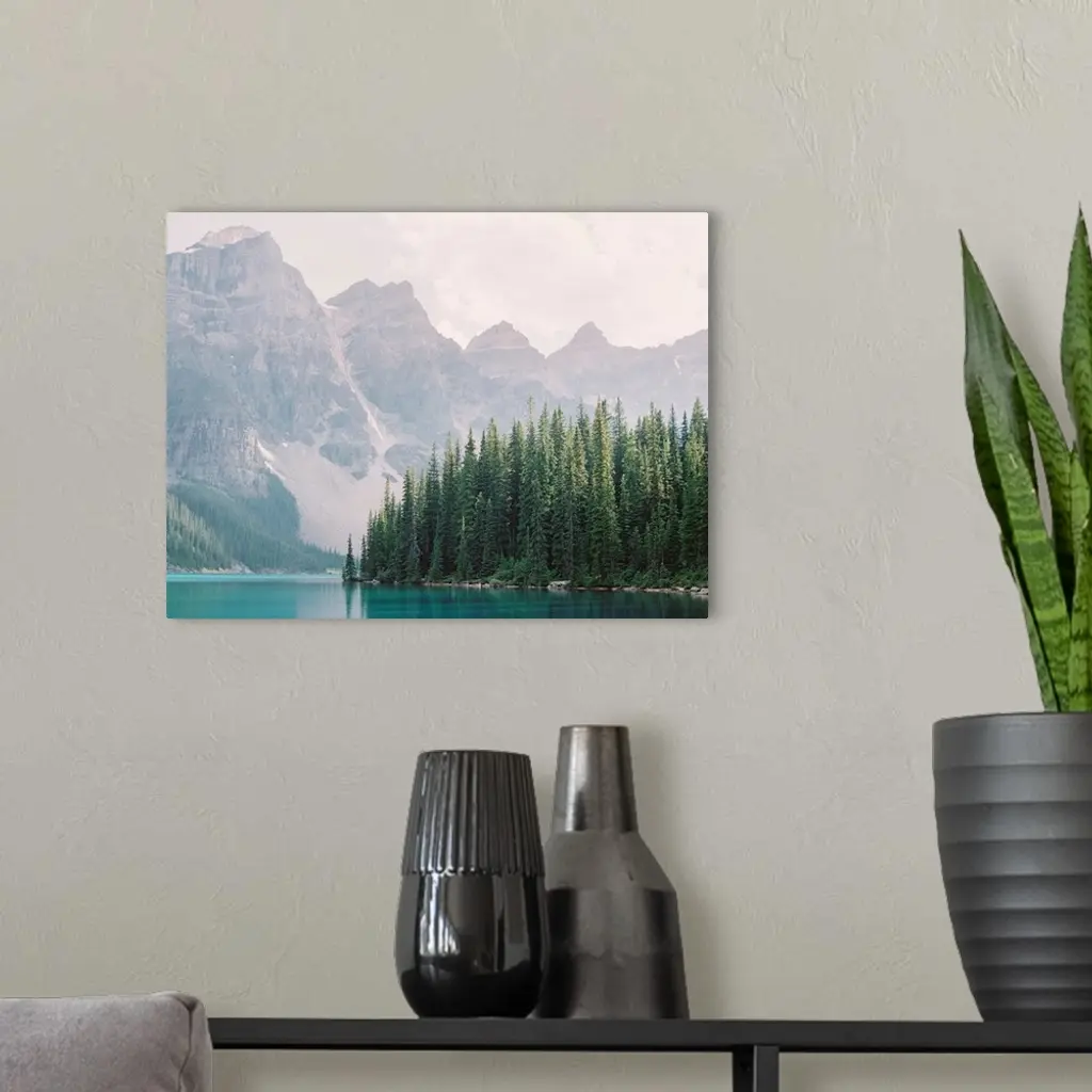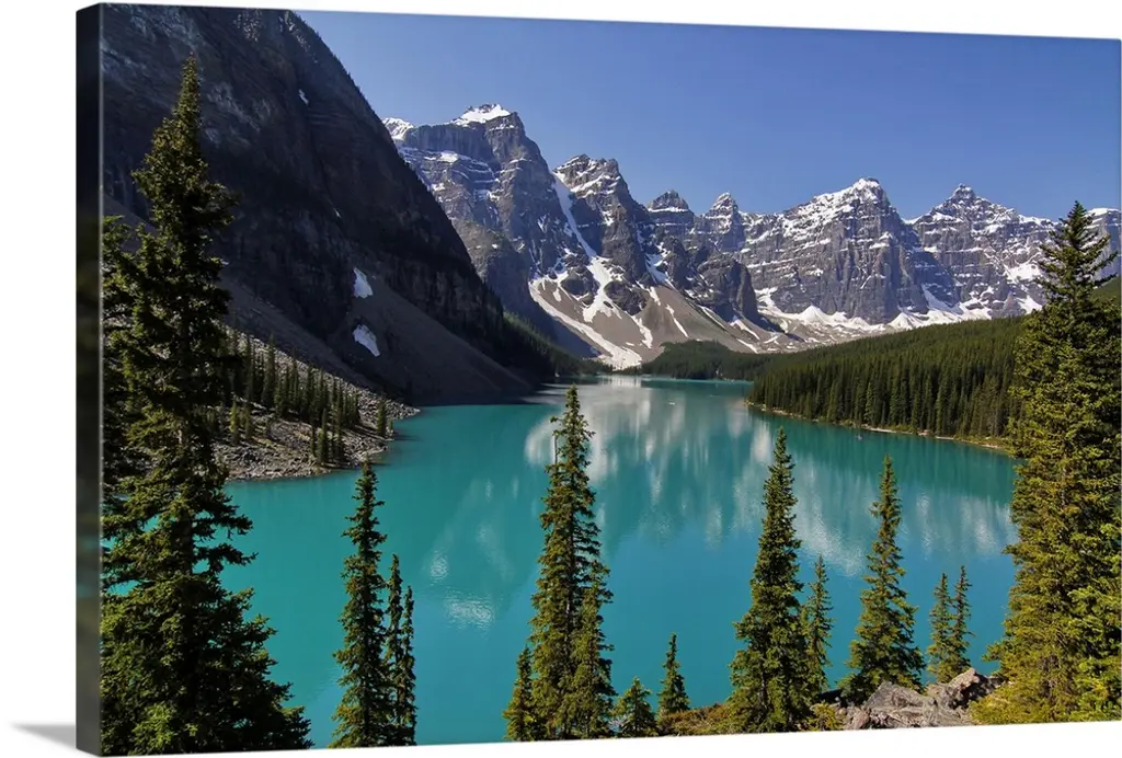 Photograph of tall evergreen trees at the edge of a clear blue lake, Moraine Lake, Banff national park, Canada.