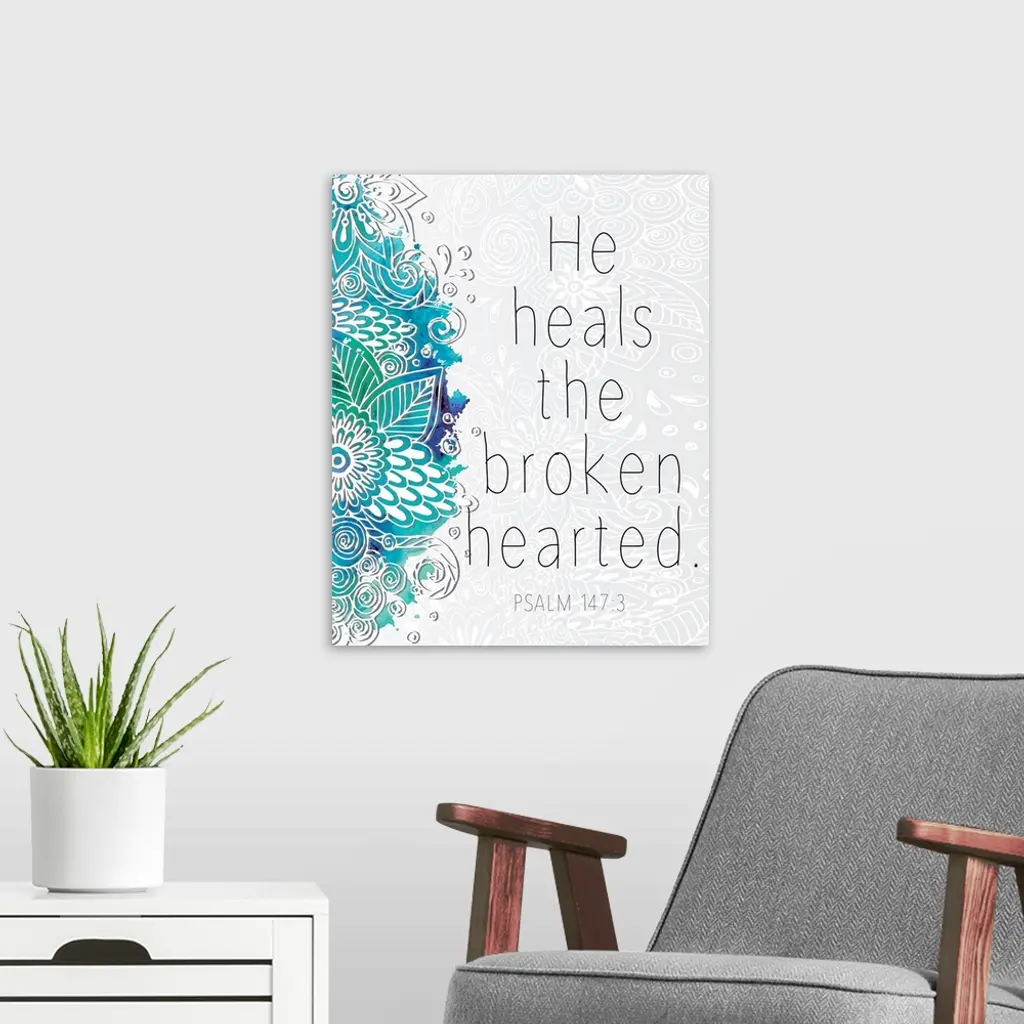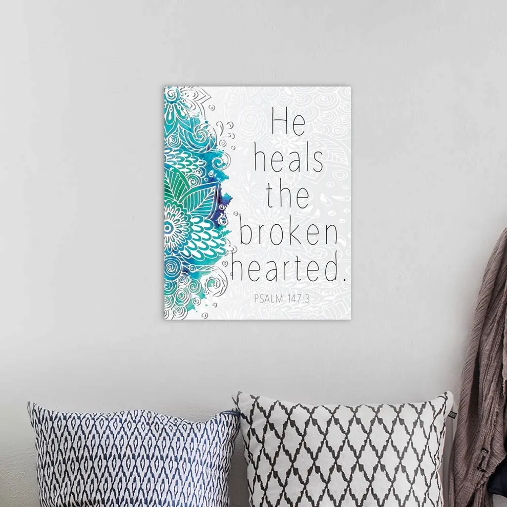 Bible verse Psalm 147:3 with a blue floral design.
