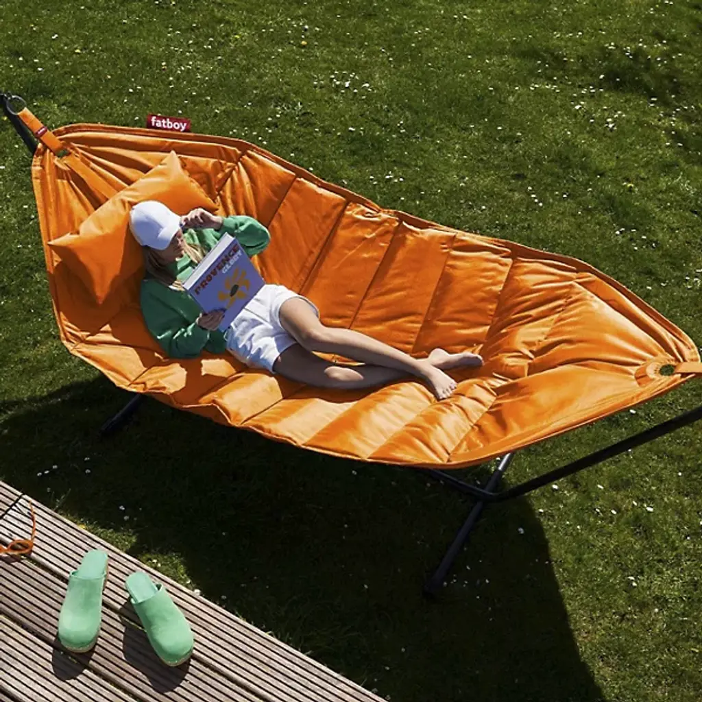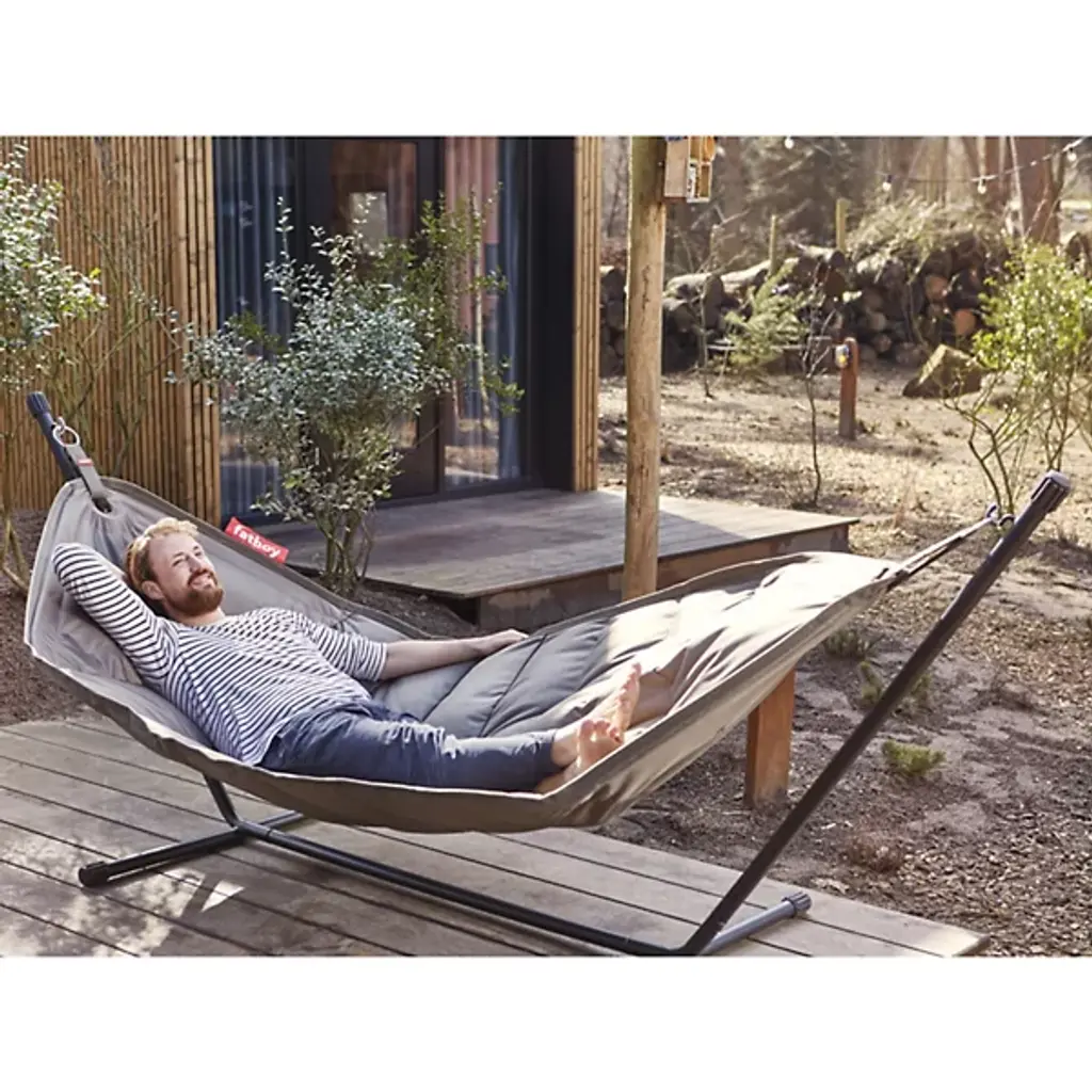 Made for days when you have nothing to do. The Fatboy Headdemock Deluxe Hammock makes those days fun and relaxing, with a durable and comfortable polyester hammock built for two, suspended between a durable free-standing frame. Suitable for indoor or outdoor use. Available in a variety of colors to coordinate with the Black frame.