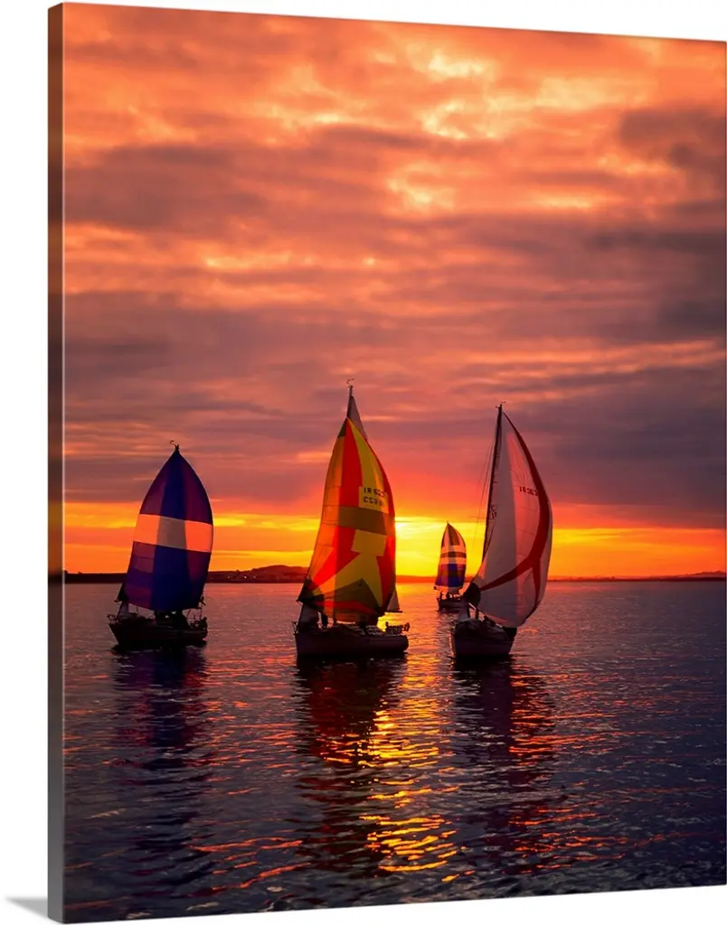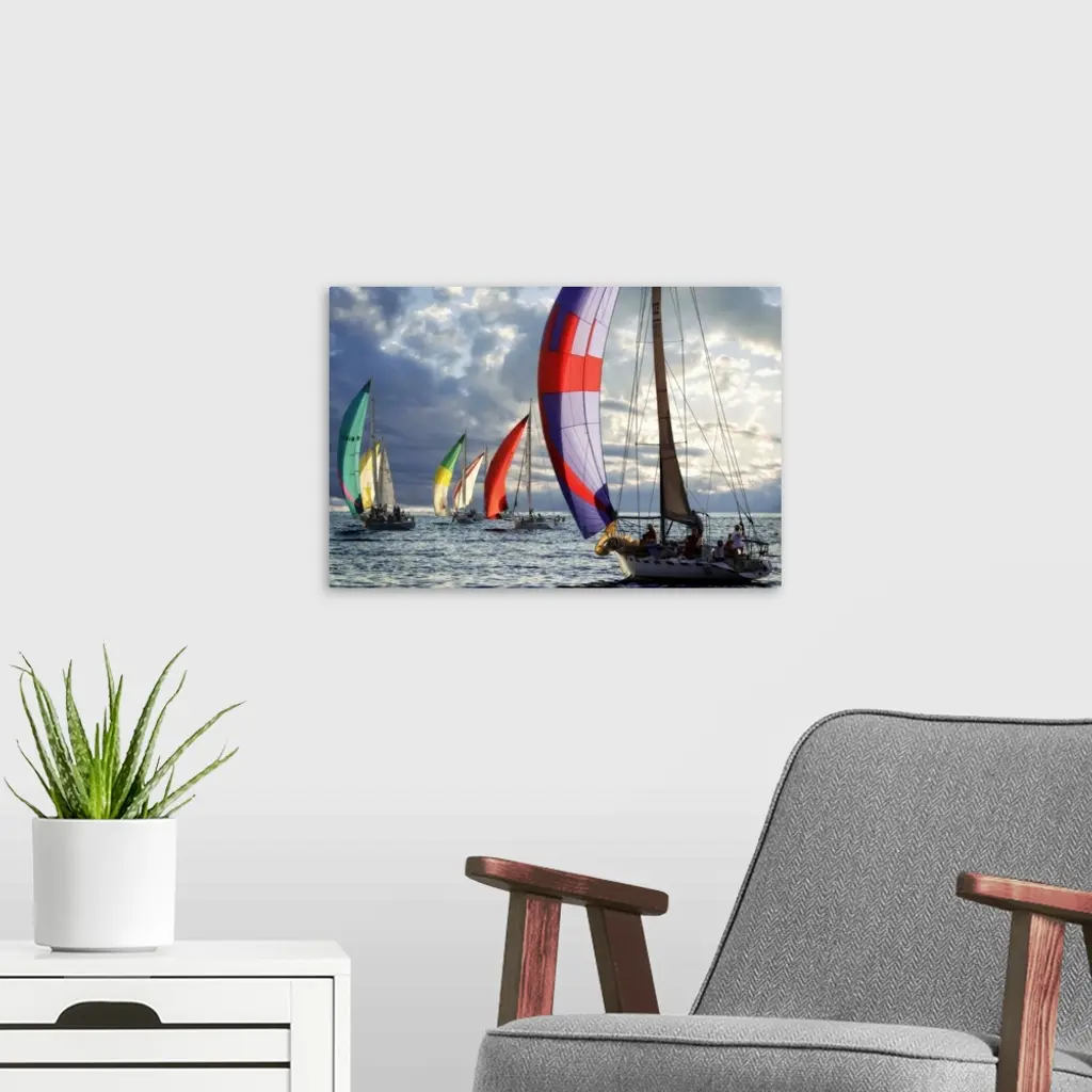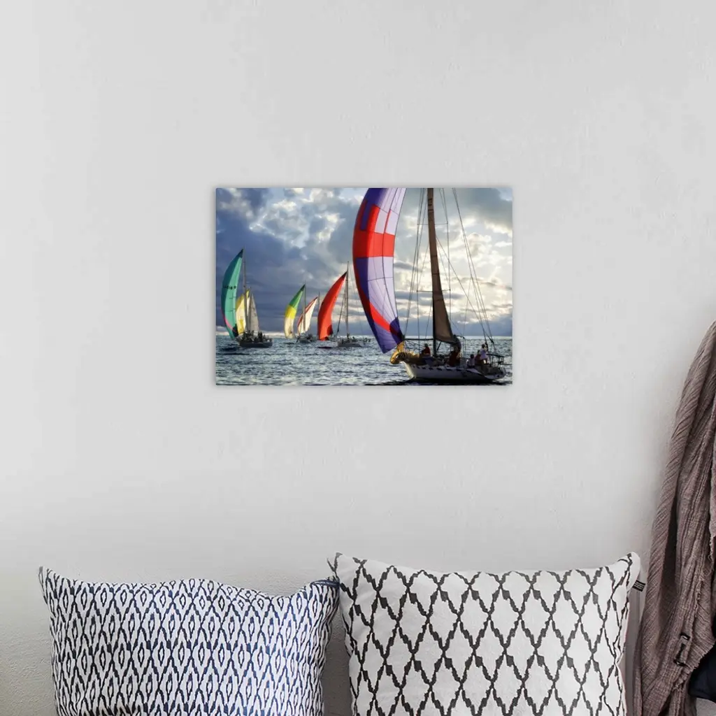 Several sailboats with colorful sails under a cloudy sky in the evening.