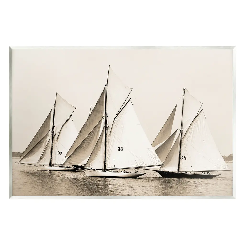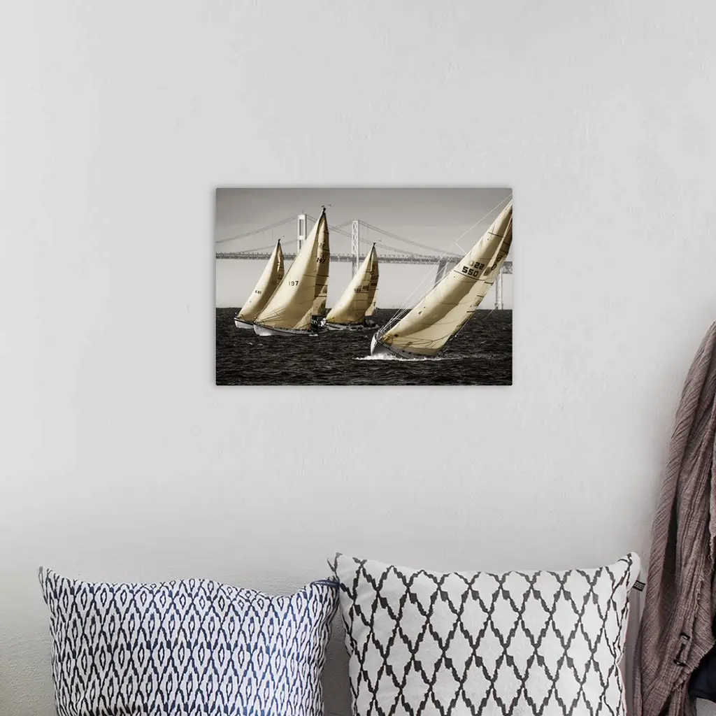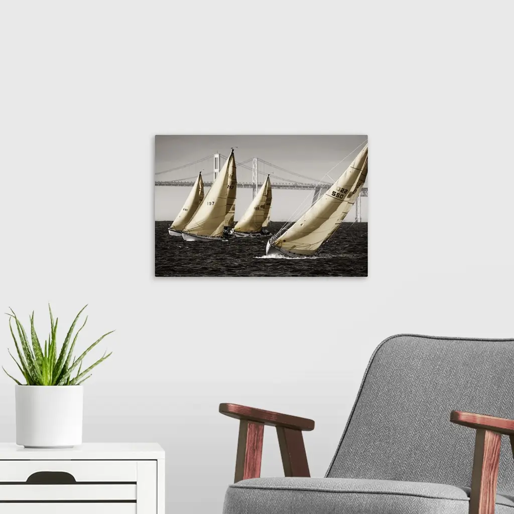 A group of sailboats on the water in Chesapeake Bay near a bridge.