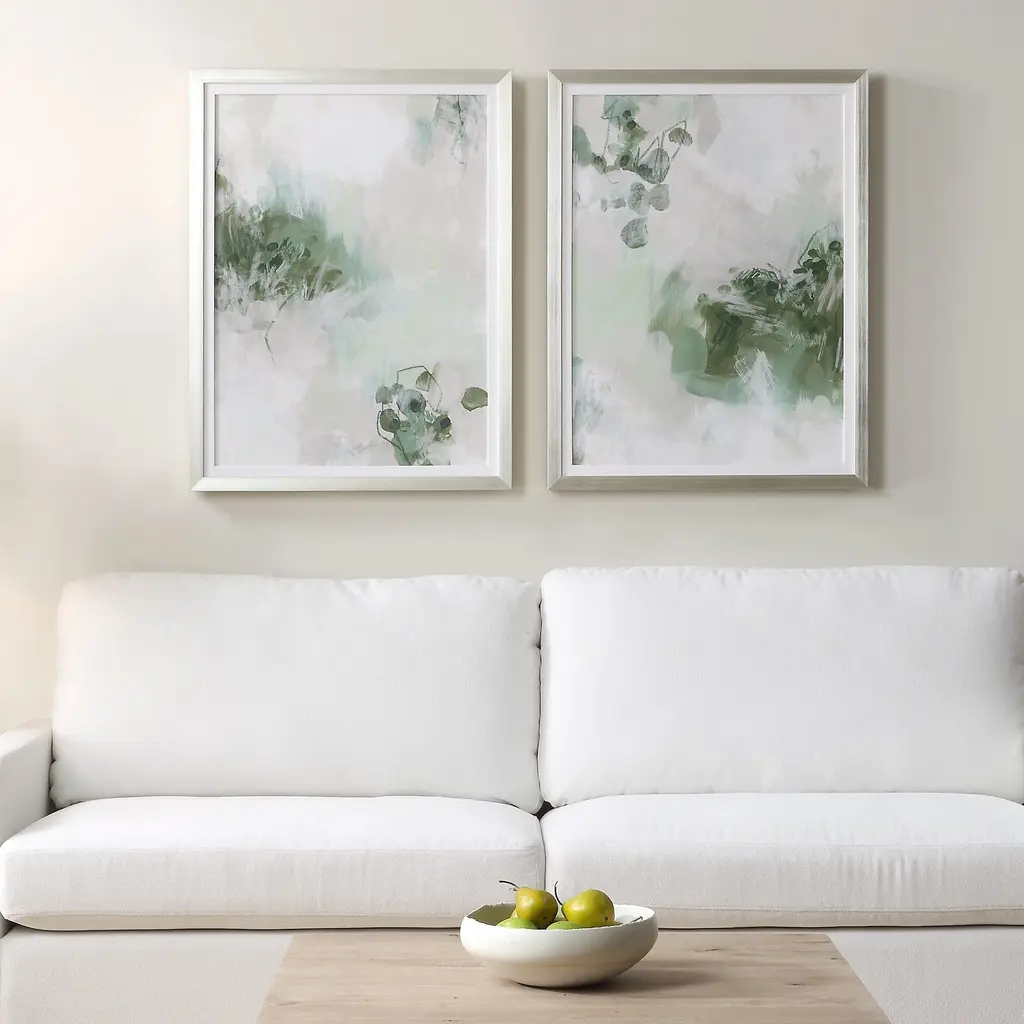 The Soft, Muted Greens And Grays Of These Prints Interplay With The Brushstrokes To Suggest Hazy Reflections Of Lily Pads On A Still Pond. Encased In A Champagne Silver Frame With A White Linen Liner.