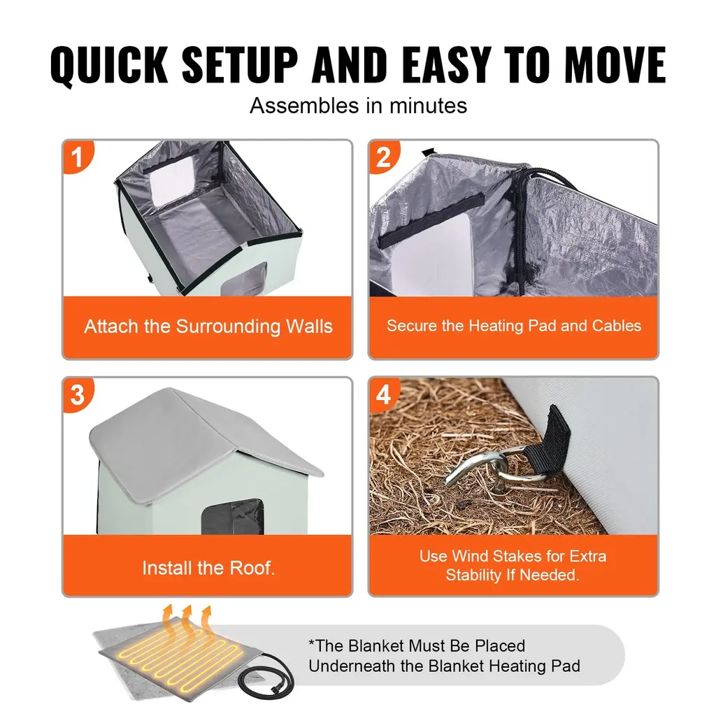 Safe Heating Pad: Equipped with a waterproof heating pad rated at 30W(19.29×15.35 in / 22.44×19.29 in option) / 50W(24.80×22.83 in option), this heated cat house provides a heating temperature range of 40℃ to 60℃ (104-140℉), ensuring your cat stays warm in cold weather. / Equipped with a waterproof heating pad rated at 55W(21.25×18.11 in option) / 30W(13.77×11.81 in option), this heated cat house features an adjustable temperature range from 26℃ to 55℃ (78.8℉ to 131℉) and allows for timer settings of 4/8/12/24 hours, ensuring your cat stays warm. It is particularly suitable for use in winter or colder regions. With built-in power failure protection and an intelligent thermostat, it can continuously stay powered on while offering over-temperature and over-current protection for the safe use of the heating pad. Powerful Insulation: The interior utilizes thermal insulation materials like aluminum foil and pearl cotton, effectively reflecting and retaining heat, preventing heat loss from the cat shelter. A blanket is included to assist in keeping your cat warm, working in tandem with the heating pad to ensure your cat's belly and other body parts stay cozy. High Waterproof Capability: Constructed from 600D Oxford cloth, the interior features PVC waterproof coating on all six walls. The entrance includes a PVC curtain to minimize moisture and cold air intrusion, ensuring a comfortable outdoor heated pet shelter during rain or winter. The heating cord is wrapped in chew-proof material to prevent animals from biting it, making it a reliable waterproof heated cat house. Sturdy and Stable: This product features a multi-reinforced design, equipped with 4 wind pegs, ensuring it stays firmly in place on grass or muddy ground, ideal for an outdoor cat house heated experience. A thickened PP board in the middle provides additional support to ensure stability and durability for long-term use. For 21.25×18.11 in and 13.77×11.81 in option: The outdoor cat house has 5 elevated support legs. Private and Comfortable Design: This product features two exits and a removable transparent door panel. 49×39 cm (19.29×15.35 in) option suitable for 1-2 cats, with exit dimensions of 20×25 cm (7.87×9.84 in). It is not recommended for cats longer than 49cm/19.35 in to enter the cat shelter. / 57×49 cm/22.44×19.29 in option suitable for 1-2 cats, with exit dimensions of 20×24cm/7.87×9.44 in. It is not recommended for cats longer than 57 cm/22.44 in to enter the cat shelter. / 63×58cm/24.80×22.83 in option suitable for 1-2 cats, with exit dimensions of 18×21cm/7.08×8.26 in. It is not recommended for cats longer than 63cm/22.80 in to enter the cat shelter. / 54×46 cm/21.25×18.11 in option suitable for medium to small cats, with exit dimensions of 18×22 cm/7.08×8.66 in. It is not recommended for cats longer than 54 cm/21.25 in to enter the cat shelter. / 35×30 cm (13.77×11.81 in), suitable for medium to small cats, with exit dimensions of 20×22cm (7.87×8.66 in). It is not recommended for cats longer than 35cm (13.77 in) to enter the cat shelter. Friendly reminder: In extreme weather conditions such as rain or snow, please promptly move the heated cat house to avoid prolonged exposure to wet conditions. Package Content 1 × Instruction Manual 2 × Wind Pegs 1 × Heating Pad 1 × Plush Cushion 1 × Shelter Body 1 × Roof