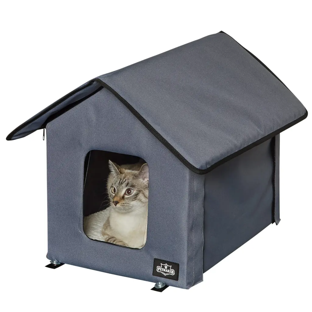 Safe Heating Pad: Equipped with a waterproof heating pad rated at 30W(19.29×15.35 in / 22.44×19.29 in option) / 50W(24.80×22.83 in option), this heated cat house provides a heating temperature range of 40℃ to 60℃ (104-140℉), ensuring your cat stays warm in cold weather. / Equipped with a waterproof heating pad rated at 55W(21.25×18.11 in option) / 30W(13.77×11.81 in option), this heated cat house features an adjustable temperature range from 26℃ to 55℃ (78.8℉ to 131℉) and allows for timer settings of 4/8/12/24 hours, ensuring your cat stays warm. It is particularly suitable for use in winter or colder regions. With built-in power failure protection and an intelligent thermostat, it can continuously stay powered on while offering over-temperature and over-current protection for the safe use of the heating pad. Powerful Insulation: The interior utilizes thermal insulation materials like aluminum foil and pearl cotton, effectively reflecting and retaining heat, preventing heat loss from the cat shelter. A blanket is included to assist in keeping your cat warm, working in tandem with the heating pad to ensure your cat's belly and other body parts stay cozy. High Waterproof Capability: Constructed from 600D Oxford cloth, the interior features PVC waterproof coating on all six walls. The entrance includes a PVC curtain to minimize moisture and cold air intrusion, ensuring a comfortable outdoor heated pet shelter during rain or winter. The heating cord is wrapped in chew-proof material to prevent animals from biting it, making it a reliable waterproof heated cat house. Sturdy and Stable: This product features a multi-reinforced design, equipped with 4 wind pegs, ensuring it stays firmly in place on grass or muddy ground, ideal for an outdoor cat house heated experience. A thickened PP board in the middle provides additional support to ensure stability and durability for long-term use. For 21.25×18.11 in and 13.77×11.81 in option: The outdoor cat house has 5 elevated support legs. Private and Comfortable Design: This product features two exits and a removable transparent door panel. 49×39 cm (19.29×15.35 in) option suitable for 1-2 cats, with exit dimensions of 20×25 cm (7.87×9.84 in). It is not recommended for cats longer than 49cm/19.35 in to enter the cat shelter. / 57×49 cm/22.44×19.29 in option suitable for 1-2 cats, with exit dimensions of 20×24cm/7.87×9.44 in. It is not recommended for cats longer than 57 cm/22.44 in to enter the cat shelter. / 63×58cm/24.80×22.83 in option suitable for 1-2 cats, with exit dimensions of 18×21cm/7.08×8.26 in. It is not recommended for cats longer than 63cm/22.80 in to enter the cat shelter. / 54×46 cm/21.25×18.11 in option suitable for medium to small cats, with exit dimensions of 18×22 cm/7.08×8.66 in. It is not recommended for cats longer than 54 cm/21.25 in to enter the cat shelter. / 35×30 cm (13.77×11.81 in), suitable for medium to small cats, with exit dimensions of 20×22cm (7.87×8.66 in). It is not recommended for cats longer than 35cm (13.77 in) to enter the cat shelter. Friendly reminder: In extreme weather conditions such as rain or snow, please promptly move the heated cat house to avoid prolonged exposure to wet conditions. Package Content 1 × Instruction Manual 2 × Wind Pegs 1 × Heating Pad 1 × Plush Cushion 1 × Shelter Body 1 × Roof