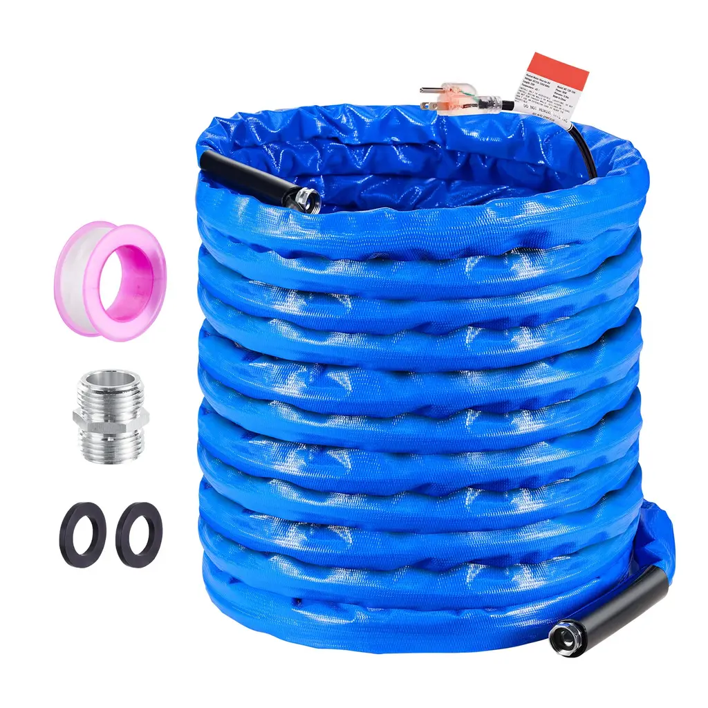 Stay Flowing in Low Temps: Even when winter nights drop to -45°F/-42.7℃, our heated RV water hose ensures steady water flow, preventing freezing and providing reliable water access. Available in 15, 25, 30, 50, and 100 ft lengths, it's perfect for RVs, trailers, boats, garden hoses, plant watering, and car washing in winter. Even Heating & Low Energy Consumption: The plug lights up when heating. The heated water hose has a variable frequency heating system that activates at 46°F/8°C and stops at 59°F/15°C, reducing energy use. It features a 0.6"/14 mm heating wire for faster heating, wrapped in a corrugated outer layer for better heat distribution. Healthy Drinking Water: Besides preventing freezing, safety in water usage is essential. The inner RV winter water hose is made from drinking water-safe materials, free of lead and BPA, ensuring safe for washing fruits and vegetables and bathing. Leak-Proof Hose Connectors: Equipped with a 3/4" (1.9 cm) GHT aluminum connector, compatible with most US water sources. Fits garden and outdoor hoses, making it a versatile accessory. Includes waterproof rubber rings and thread seal tape for enhanced sealing. Smooth Water Flow: Designed with a kink-free structure to prevent slow or blocked water flow. The 5/8" I.D. supports high water flow. Suitable for water pressure below 4 MPa/600 PSI, with a durable corrugated PVC outer layer that resists road gravel and ice. Package Content 1 x Heated Water Hose 1 x 3/4" Male Connector 2 x Waterproof Rubber Rings 1 x Thread Seal Tape 1 x User Manual