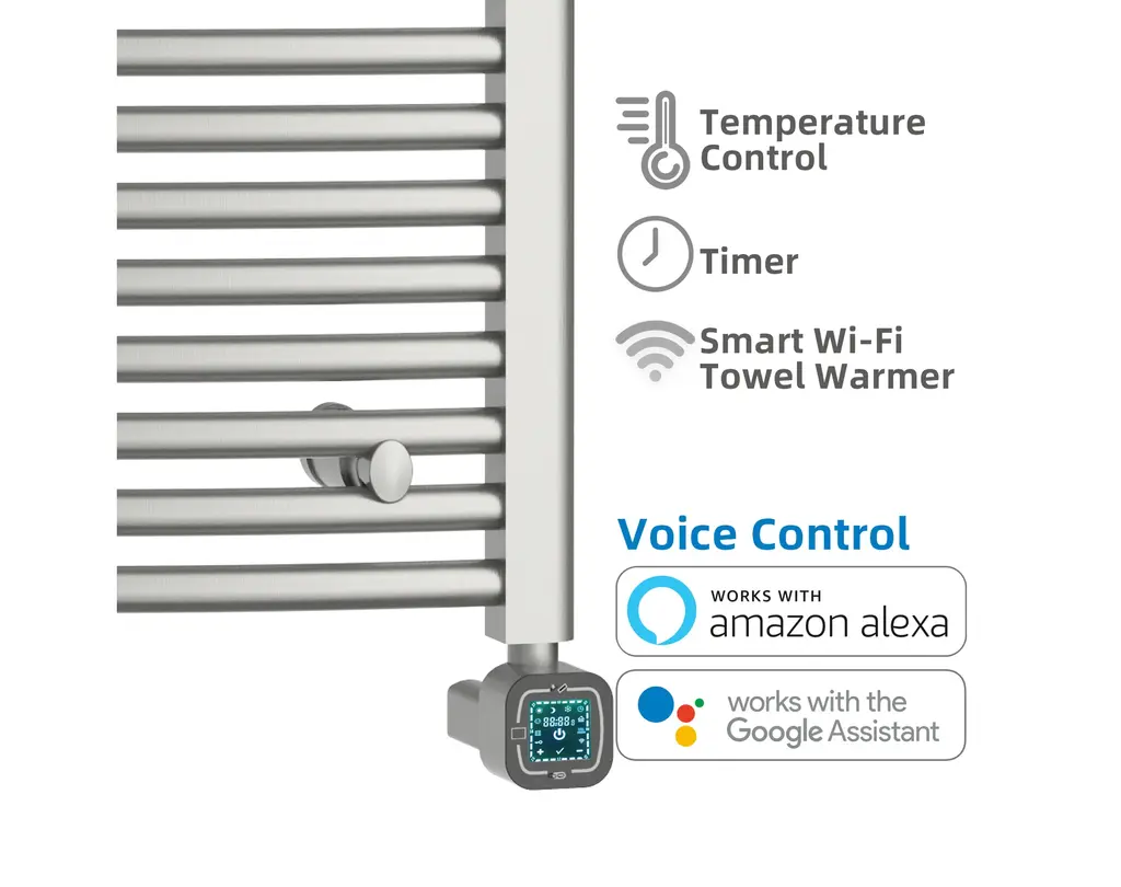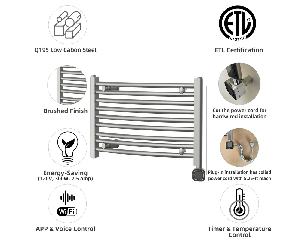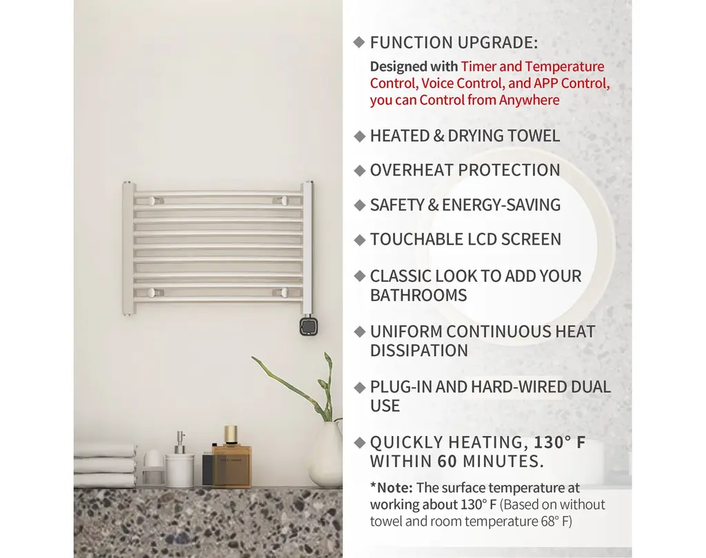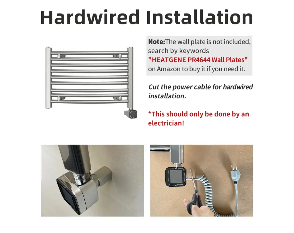 About HEATGENEFrom the beginning, we've maintained our commitment to developing and manufacturing products of the highest quality while making luxury affordable for our customers across all over the world.HEATGENE adopts high-quality materials to design electric heating towel warmers, including contemporary and traditional styles, various selections for you. Upgrade your towel rack and enjoy a fresh, soft and warm towel now!Why consider a towel warmer?Who doesn't enjoy being cloaked in warmth after a shower or bath?And beyond the spa comforts, heated towel bars offer these benefits:They dry towels more rapidly, keeping them fresher.They provides a soft ambient warmth in your bathroom.Gently dry delicate clothing and swimwear.Accelerate drying of wet outerwear, such as coats and gloves making towel warmers worth considering for mudrooms and laundry rooms.From now on, you'll never dread getting out of the shower again!Imagine that you step out of the shower and immerse yourself with a warm towel, you can always feel completely relaxed.Set the temperature and timers you need for towel warmers and let smart system turn them on or off automatically at a certain time.HIGH EFFICIENT CLOSED HYDRONIC HEATING SYSTEMThis intelligently designed towel rail utilizes an energy-efficient thermal fluid element that will make your bathroom and towels snugly warm in a very short time. The thermal fluid has excellent heat retention, so it can comfortably maintain a steady temperature without expending too much energy. Additionally, an inbuilt thermal fuse inside the heating elements protects the towel rail from overheating for added energy-saving plaudits.HIGH-QUALITY ONE-PIECE WELDINGAdvanced seamless welding technology makes the bar-to-bar seal better, and then achieves product voltage stabilization, moisture resistance, and electrical leakage resistance, also making the product have a longer life.Liquid-filled towel warming rack for more even heat distribution, and variable frequency operation mode for more energy efficiency.MORE USER-FRIENDLY INTELLIGENT OPERATION PANELModel HG-R02106 series smart towel rack warmer designed with an LCD touch screen as the operation panel, more intuitive and easy to use, you can easily set the working mode, timing set the temperature, and so on.You can also control your towel rack heater remotely through the Tuya app, and it also works well with Google Assistant or Alexa.NOTE: Built-in Temperature Control shows temperature in (Celsius)EASY INSTALLATIONHG-R02106 series towel warmer provides plug-in and hardwired installation methods. The package contains an "installation guide" to ensure that every HEATGENE user can understand and refer to the installation.The power cord is 5.25 feet long for easier installation.Please note: The hard-wiring should be carried out by a trained electrician.Free up your hands by using a simple voice to command your towel warmer with Alexa and Google Assistant. Control from AnywhereHEATGENE Smart Towel Warmer with Timer and Temperature Control, Large Smart Liquid Filled Towel Rails, Plug-in/Hardwired Towel Heater Works with Alexa and Google HomeVOICE AND REMOTE CONTROL: HEATGENE Smart towel warmer compatible with Alexa and Google Home, control your towel rail by simply giving voice commands to Alexa or Google Home. Free APP control the smart towel warmer by your smartphone (iOS 8.0 or above/Android 4.4 or above). You can control the smart towel warm rack at anytime anywhere. No Hub Required, the smart towel warmer works with any 2.4G Wi-Fi router without the need for a separate hub or paid subscription serviceENERGY-EFFICIENT: Rated power 300W (2.5 amp), it warms up within 15 minutes and reaches the optimal working temperature 130 degreeF (based on room temperature 68 degreeF) in an hour, 18 maintains constant temperature curved hanging bars evenly distributed to increase heat density for a larger heated area to meet the needs of the whole family, you can enjoy a warm towel at any time7 X 24 TEMPERATURE CONTROL and TIMER: Set the temperature and timers you need for towel warmers and let smart system turn them on or off automatically at a certain time, it can help you eliminate wasteful standby power and reduce energy consumption, and save on your electric bills and extend product lifeEASY INSTALLATION: This space-saving wall-mounted towel warmer offers two ways of wiring (hardwired/ plug-in). Whether you have a new bathroom or are retrofitting one, our warmers combine practicality and decoration, you should not miss out. Note: The price does not include the panel, search by keywords "HEATGENE PR4644 Wall Plates" on Amazon to buy it if you need itRELIABLE QUALITY and 2-YEAR MANUFACTURER'S WARRANTY: An ETL-certified towel warmer with a constant temperature of 130 degreeF, overheat protection ensures safety from excessive temperature, please feel free to contact us with any issues