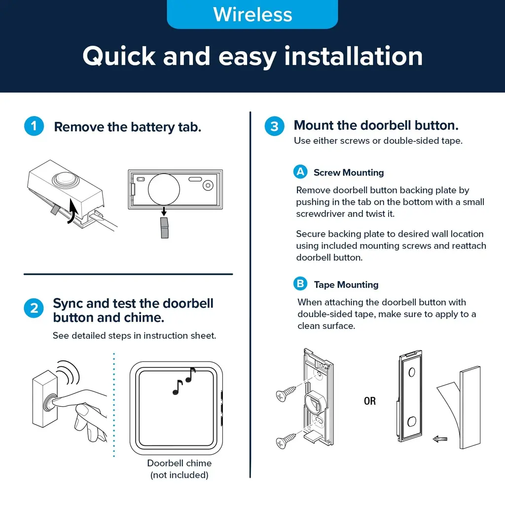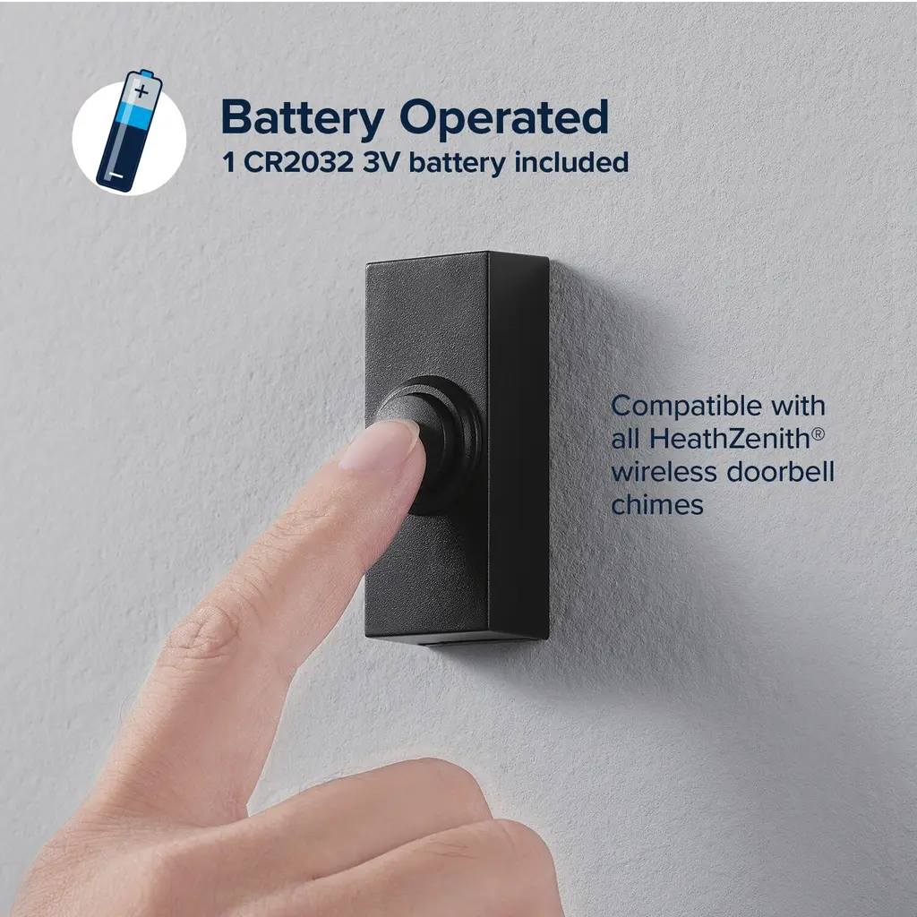 Upgrade your home's entrance with the Heath Zenith Black Plastic Wireless Push Button Doorbell, a sleek and modern addition to your door. With a compact design, this doorbell button has a total length of 2.48" and a distance of 1.38" between screw holes, making it easy to install on any wall or flat surface. Being battery-operated, it requires only 1x CR2032 or A23 battery (included), eliminating the need for complex or permanent wiring. Enjoy hassle-free compatibility with all Heath Zenith wireless doorbell chimes, providing a versatile solution for your specific needs. Backed by a 1-year limited manufacturer's warranty, this push doorbell button ensures durability and peace of mind. Crafted with black plastic construction, the button adds a touch of modernity to your house while effortlessly blending with any décor! Perfect for apartments, renters, or homes without wiring available!