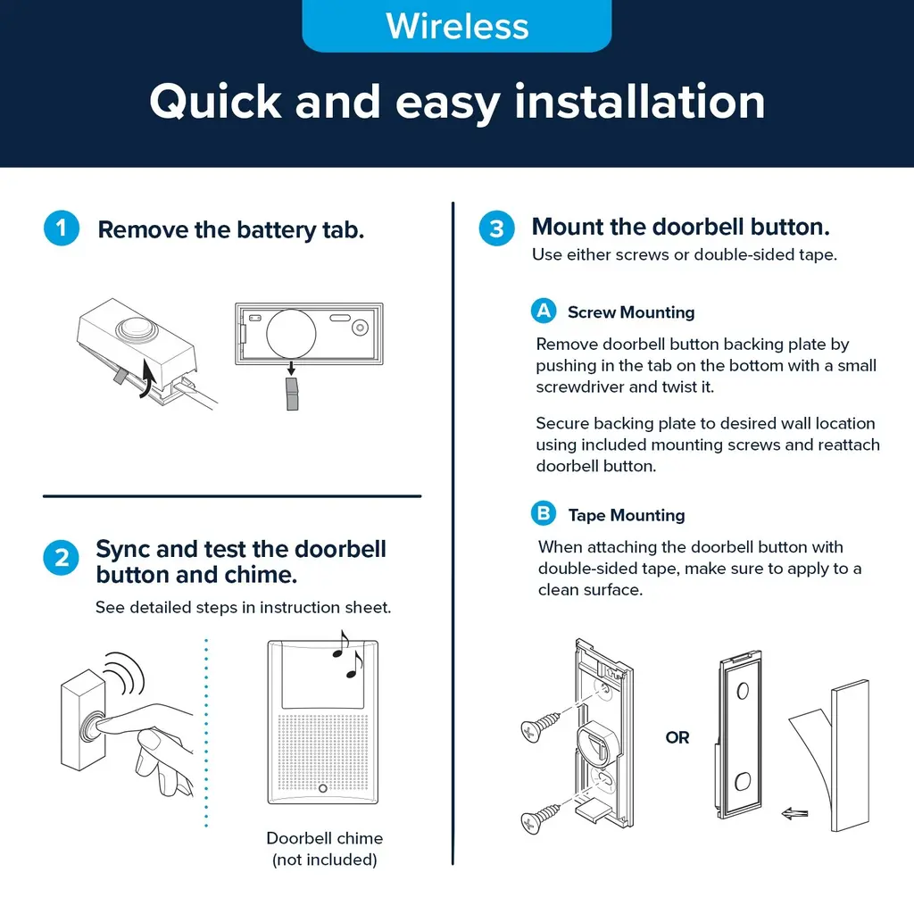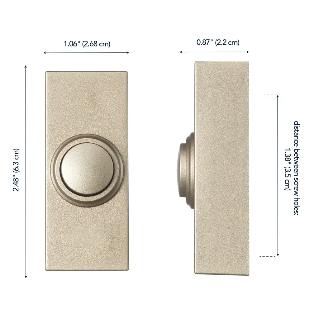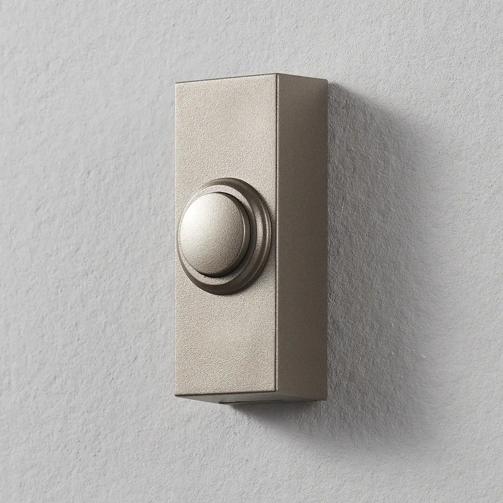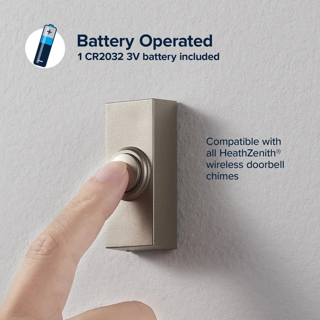 Transform your home's entrance with the Heath Zenith Wireless Push Doorbell Button, seamlessly combining style and convenience. Designed for effortless surface mount installation on any wall or flat surface area, this satin nickel doorbell button boasts a compact form with a total length of 2.48" and a 1.38" distance between screw holes, ensuring discreet placement in any living space. Operating on a CR2032 or A23 battery (included), this wireless doorbell offers the perfect solution for apartments, allowing inconspicuous installation without the need for hardwiring. With an impressive 150-ft transmission range, it ensures you hear the doorbell ring, even in larger homes or work settings. Compatible with all Heath Zenith wireless doorbell chimes, this push button doorbell seamlessly integrates into your existing setup. Backed by a 1-year limited manufacturer's warranty, it guarantees reliability and peace of mind!