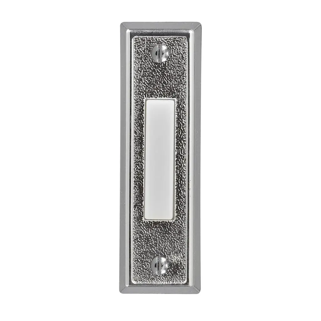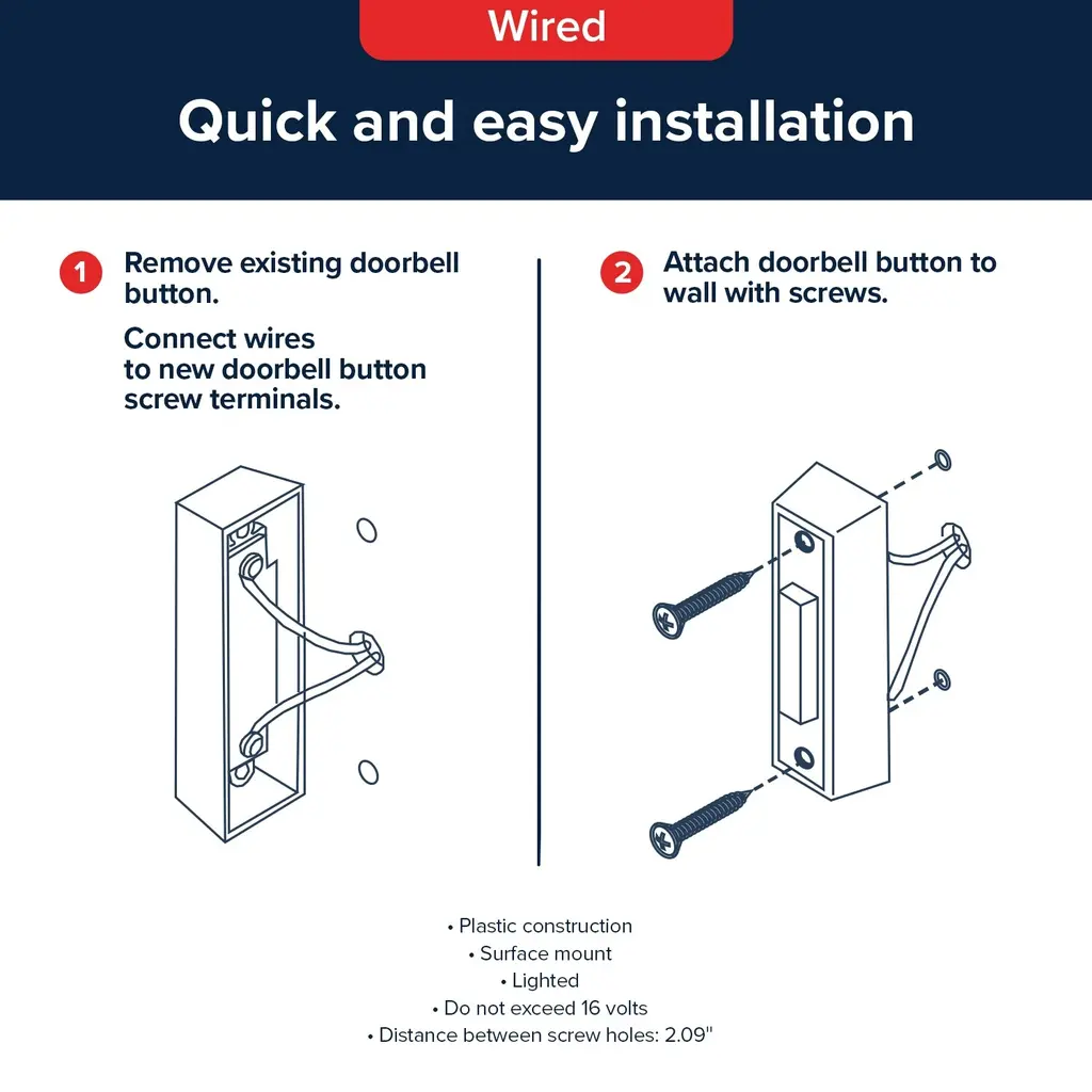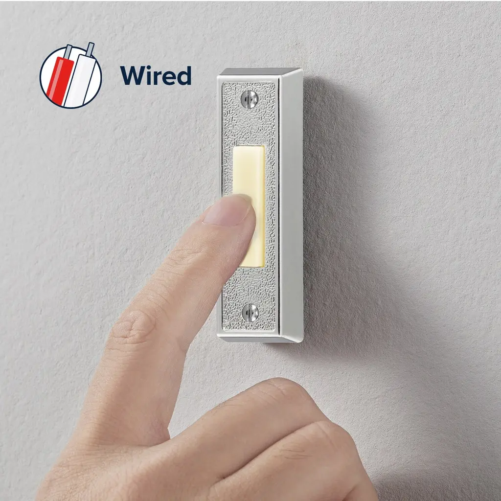 Immerse your house in the modern sophistication of the Heath Zenith Silver Plastic Wired Lighted Push Doorbell Button. The built-in light provides a helpful visual cue, ensuring button visibility when someone is at your door, even in darker settings. With a surface-mount design, this doorbell effortlessly installs on almost any wall or flat surface area, adapting seamlessly to your home's aesthetic, while the sleek silver color effortlessly enhances your home's curb appeal. Wired for hardwired installation, it's an excellent choice for new homes or upgrading your existing push button doorbells. Backed by a 1-year limited manufacturer's warranty, this doorbell button combines style, functionality, and reliability to make your home's entrance truly exceptional – do not exceed 16 volts when using.