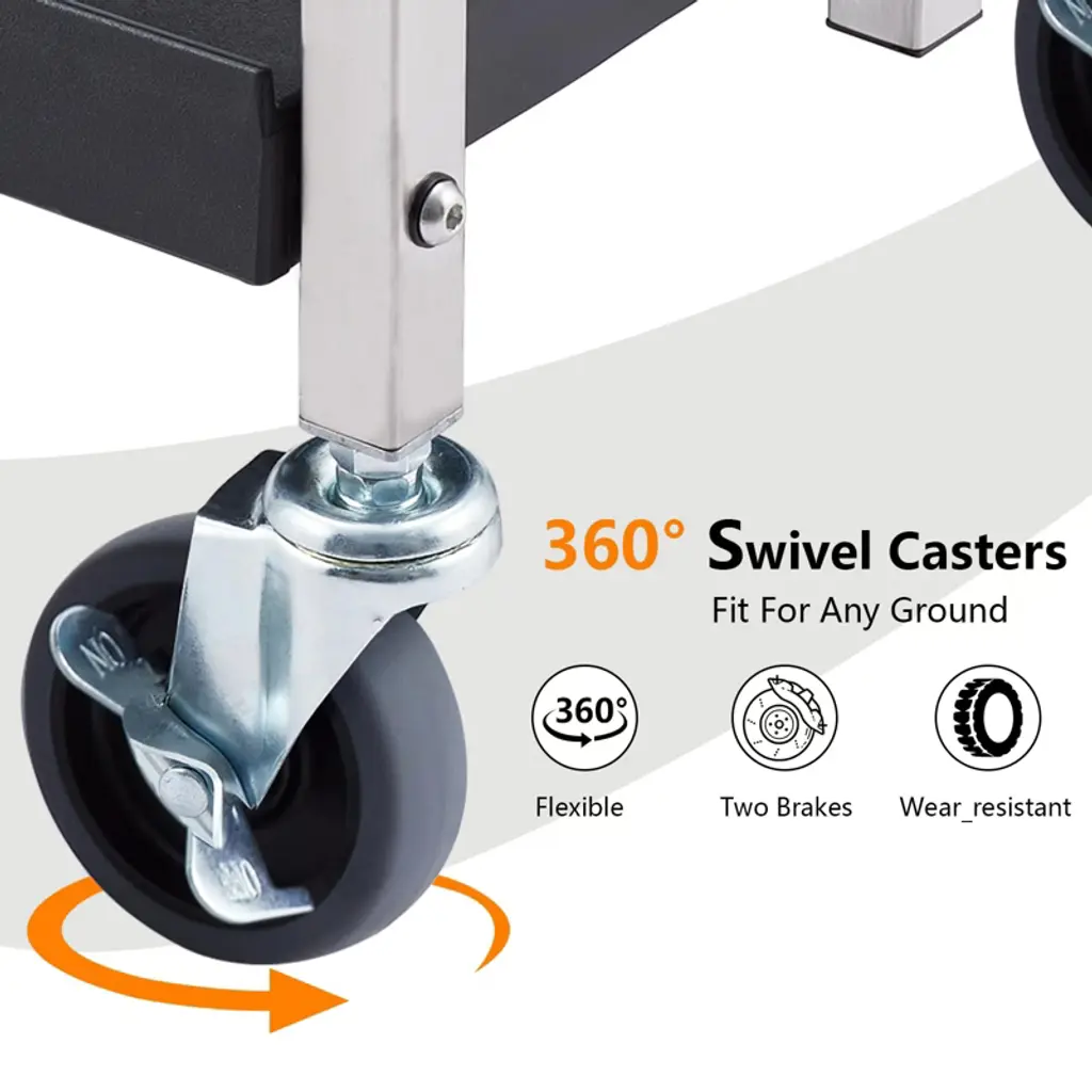 This heavy-duty 3-shelf rolling cart is built for performance and versatility. Its upgraded folding structure and thickened shelves offer impressive strength and stability, supporting up to 330 lbs across all tiers. With swivel wheels and a reliable brake system, this cart provides smooth mobility and secure parking wherever needed. Easily fold it for compact storage, making it perfect for busy kitchens, warehouses, offices, and outdoor events.