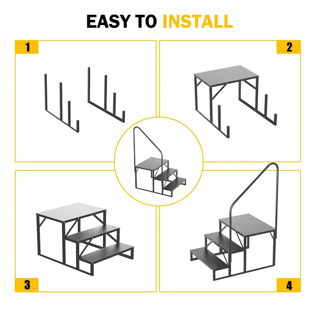 Specification:Key Features: Description: This RV step stool with handrail is a heavy-duty, 3-step ladder designed for outdoor use, including mobile homes, campers, pools, and hot tubs. Featuring a 440-pound weight capacity, the ladder provides superior stability with its anti-slip platform and thickened 2mm construction. The durable, electrostatically sprayed metal frame is corrosion-resistant and reinforced with triangular bars for added safety, minimizing the risk of falls. The portable step ladder is simple to install with the included tools and can be fitted with a handrail on either side for extra support, making it ideal for children and elderly users. Versatile and detachable, it can serve as steps for RVs, trailers, mobile homes, pools, spas, porches, or bunk beds, and stores easily when not in use. This multi-purpose step stool offers a practical solution for various needs, including individuals with balance or mobility challenges.