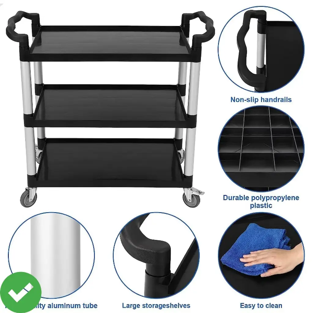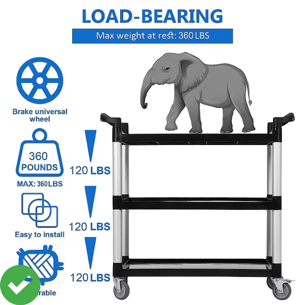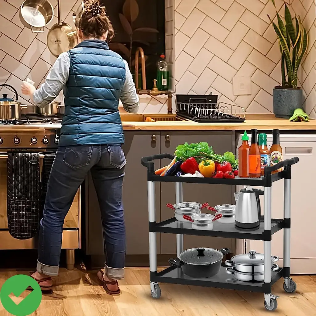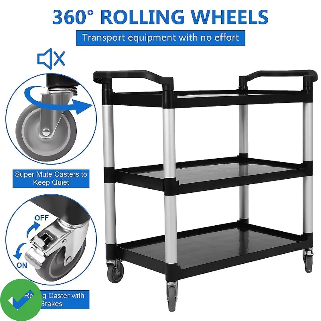 Heavy-Duty 3-Tier Utility Cart with Wheels - 360 LB Capacity Rolling Service Cart for Kitchen, Office, Warehouse, Garage & Cleaning, Black. uilt with industrial-grade structural foam plastic and aluminum framing¡ªrustproof, dent-proof, and crack-resistant. Stays tough in damp environments, freezers, or high-traffic areas without corrosion or peeling. Weighs less than 35 lbs for easy lifting.