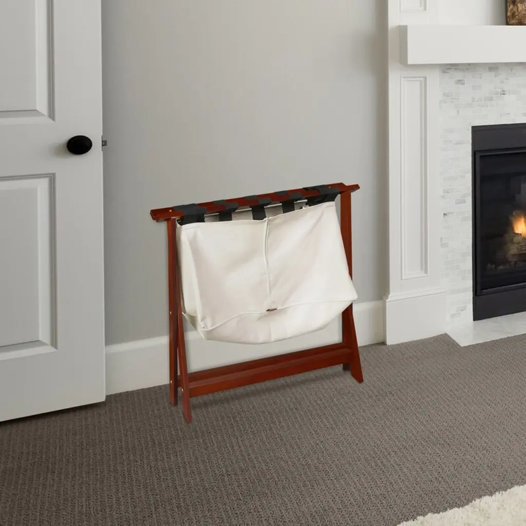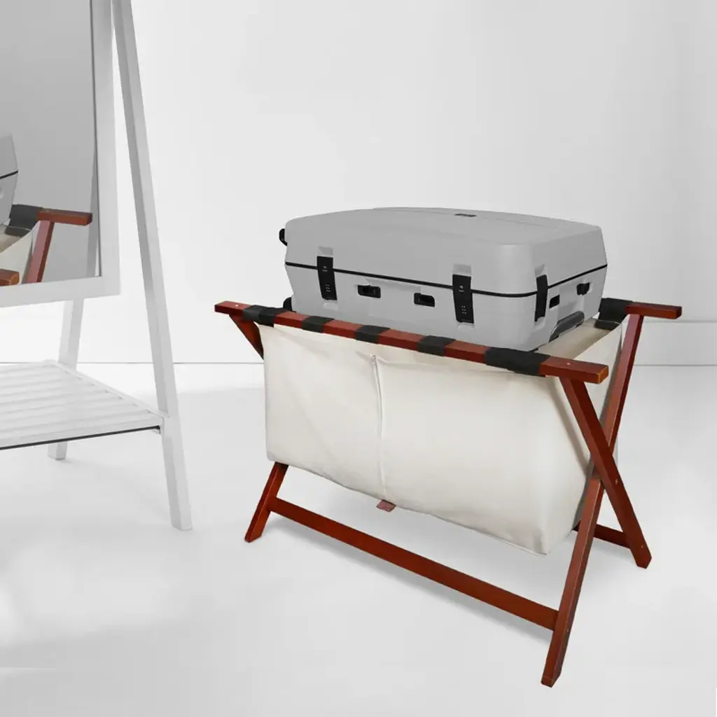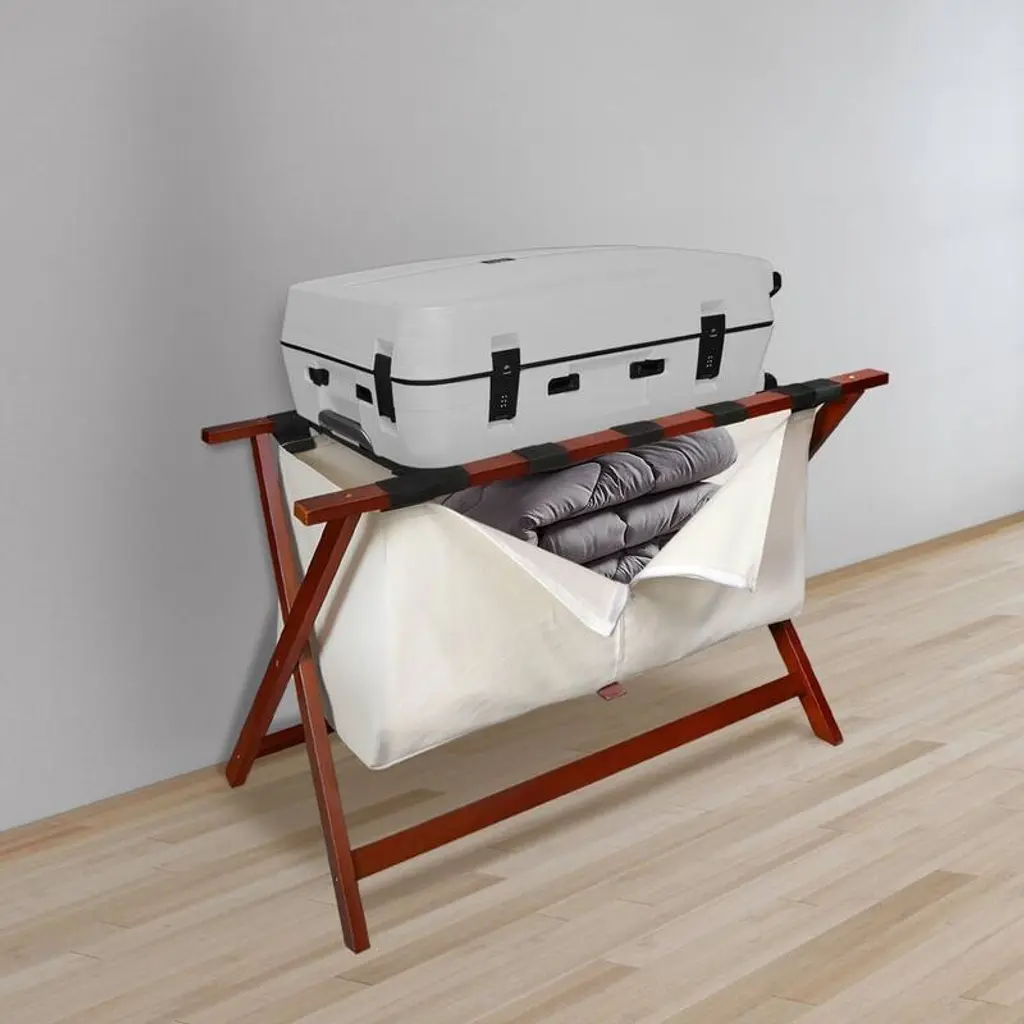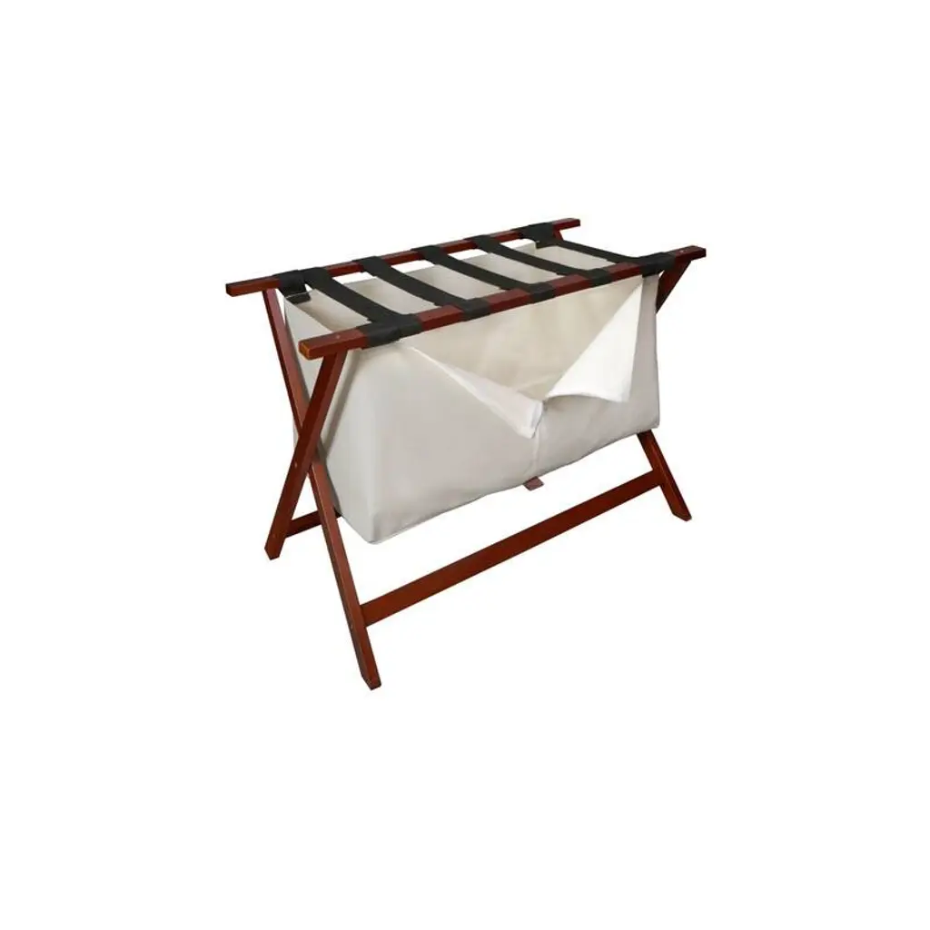 Upgrade your guest's travel experience with our 100% Solid Wood Heavy Duty 34" Extra Wide Luggage Rack. Designed for durability and convenience, this stylish rack offers a perfect blend of functionality and sophistication. Finished in rich Walnut, it adds a touch of elegance to any room while providing ample space for luggage. The heavy-duty construction supports even the heaviest suitcases, ensuring stability and ease of use. Plus, the included zippered laundry bag keeps dirty clothes organized, making it the ultimate addition to your guest room or hotel suite. •100% Solid Wood Construction: Crafted from premium, high-quality solid wood, ensuring long-lasting strength and durability. •Heavy Duty Design: Built to support heavy luggage, this rack is sturdy enough for even the largest suitcases. •Extra Wide 34" Size: Offers ample space for all types of luggage, providing easy access and storage for your travel essentials. •Zippered Laundry Bag Included: Keep your dirty clothes neatly organized with the convenient, removable zippered laundry bag. •Elegant Walnut Finish: A rich, warm walnut finish that complements any decor, adding a touch of sophistication to your space. •Compact and Convenient: Folds flat for easy storage when not in use, making it ideal for both home and hotel settings.