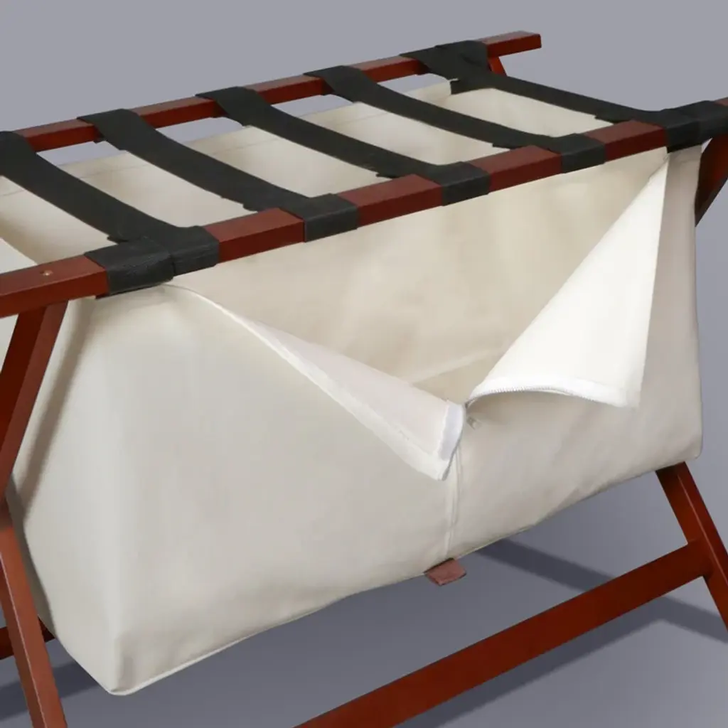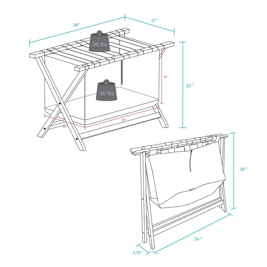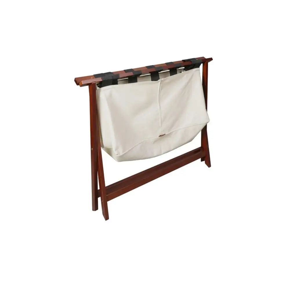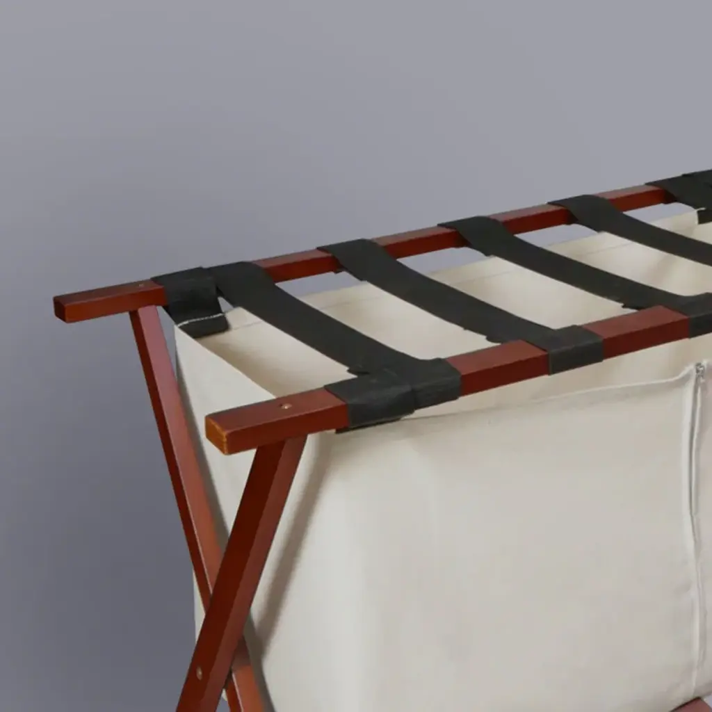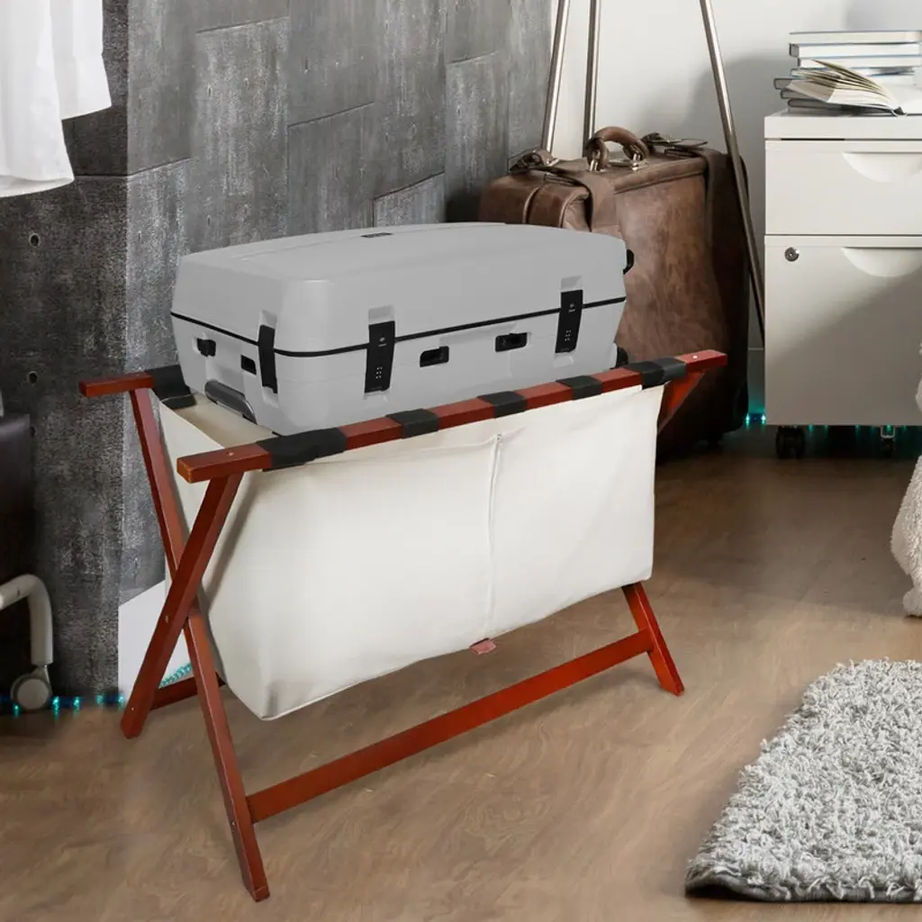 Upgrade your guest's travel experience with our 100% Solid Wood Heavy Duty 34" Extra Wide Luggage Rack. Designed for durability and convenience, this stylish rack offers a perfect blend of functionality and sophistication. Finished in rich Walnut, it adds a touch of elegance to any room while providing ample space for luggage. The heavy-duty construction supports even the heaviest suitcases, ensuring stability and ease of use. Plus, the included zippered laundry bag keeps dirty clothes organized, making it the ultimate addition to your guest room or hotel suite. •100% Solid Wood Construction: Crafted from premium, high-quality solid wood, ensuring long-lasting strength and durability. •Heavy Duty Design: Built to support heavy luggage, this rack is sturdy enough for even the largest suitcases. •Extra Wide 34" Size: Offers ample space for all types of luggage, providing easy access and storage for your travel essentials. •Zippered Laundry Bag Included: Keep your dirty clothes neatly organized with the convenient, removable zippered laundry bag. •Elegant Walnut Finish: A rich, warm walnut finish that complements any decor, adding a touch of sophistication to your space. •Compact and Convenient: Folds flat for easy storage when not in use, making it ideal for both home and hotel settings.