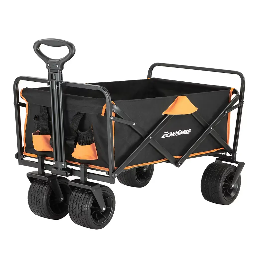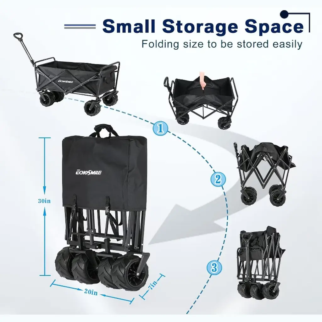Product Features High-Capacity: Made of a heavy-duty Metal frame, the structure welded is absolutely solid and durable. The fabric material is made of 600D fabric and PVC coating to be waterproof and durable. Size: 35.4"x21.6"x19.6". Folding Dimension: 30¡±x20¡±x7¡±. The collapsible wagons and carts' load capacity is up to 350lbs, which can be effectively transported with a high load. Fast Set-Up & Fold: No assembly required for EchoSmile big collapsible wagon heavy duty. A convenient size for both storage and expanded use. Fast and easy to set up in seconds and has an attached handle to move the beach cart. This folding heavy-duty wagon can be folded compactly to store easily in a compact car, or garage, ensuring easy transport. All-Terrain Wheels Wagon: This cart with wheels heavy duty has solid wheels of 4¡±x7¡±, not just for the sandy beach, but for snow, dirt, street, or grass maneuvering. It also makes the hand wagon cart sturdy for navigating street curbs or rocks fast, as you pull heavy loads on the rugged and outdoor terrain. Adjustable Handle: The tilting pulling handle of the folding beach wagon is telescopic with an adjustable length of 20" to 30" for a comfortable height; a handle with a locking system keeps it in place. The adjustable handle makes it easy to pull the beach cart wagon when it's heavily loaded. Widely Use: Folding utility wagons are used in a wide range of applications, such as outdoor activities, beaches, gardens, parks, camping, or shopping to make your life more convenient.