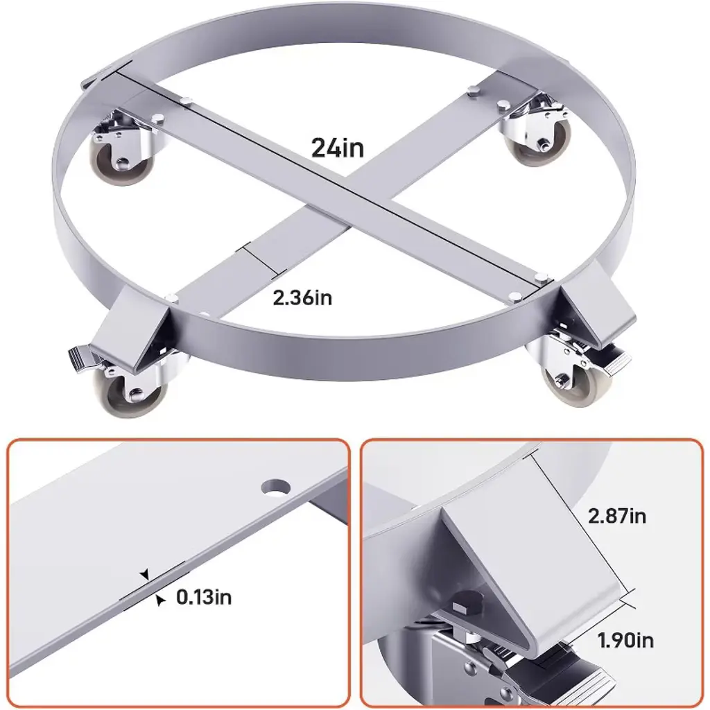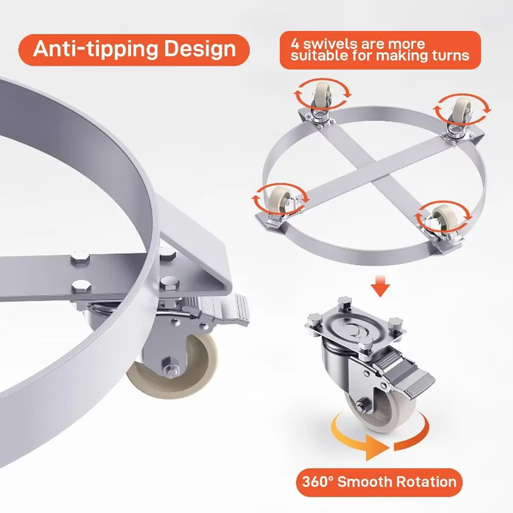 Move heavy drums with ease using this industrial-strength 55 gallon drum dolly. The all-steel construction supports up to 1000lbs, making it ideal for warehouses, garages, and industrial facilities. Four 3in polyurethane swivel casters provide 360° maneuverability while protecting floors, with two locking wheels for secure positioning. The reinforced frame securely cradles standard 55-gallon drums (22.5in diameter) and features a low-profile design for easy loading. Perfect for transporting chemicals, oils, or other liquids safely.