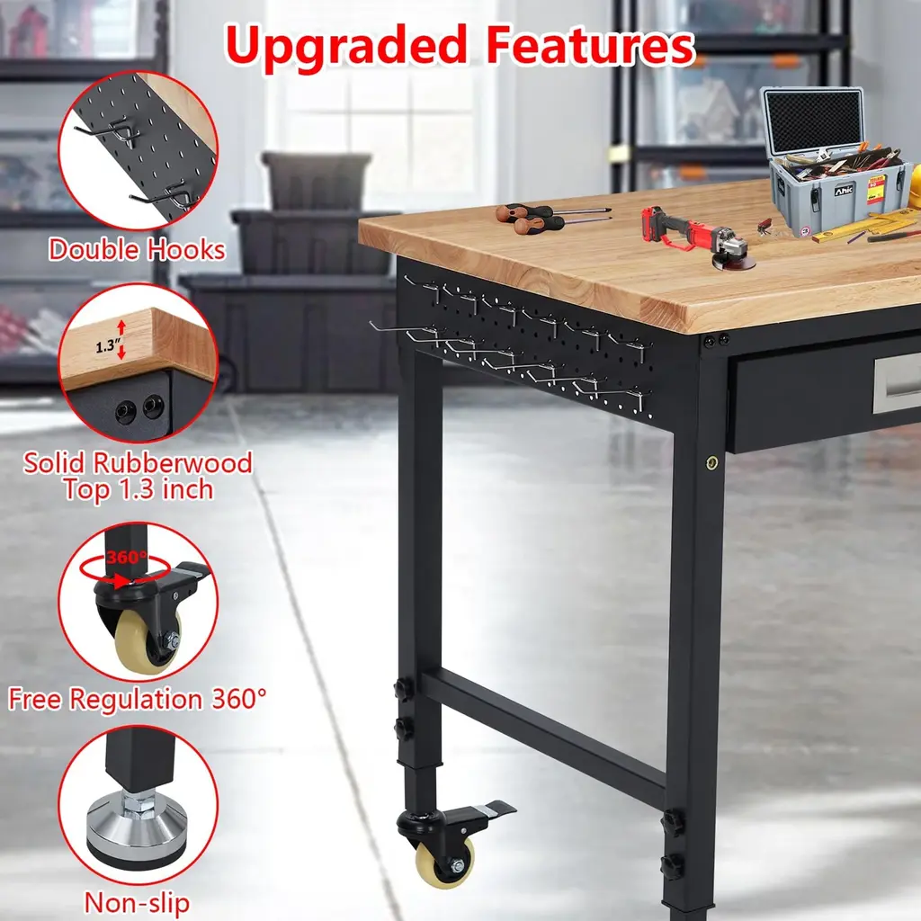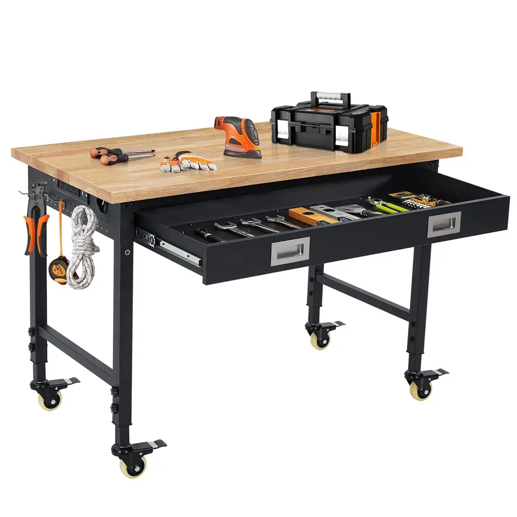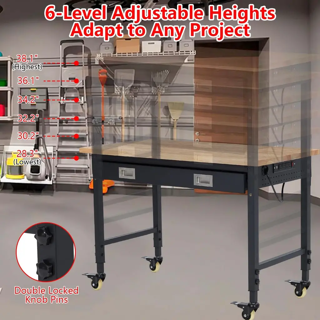 This heavy-duty multifunctional workbench is built with a robust construction and generous storage capacity. It features 4 rolling casters, 4 power outlets, adjustable height, and extra storage space to keep your workspace orderly and organized. Its versatile functionality makes it ideal for a wide range of projects, whether for DIY at home or professional studio work.【Solid Rubber Wood & Metal Frame】The garage workbench is meticulously crafted with a solid rubber wood tabletop coated with an eco-friendly varnish for long-lasting durability. Combined with a precision-cut steel frame, this workbench offers a maximum load-bearing capacity of 2000 lbs, making it the perfect choice for a variety of projects, from gardening to car repairs. It provides the stability and strength necessary for hammering, painting, drilling, and cutting tasks.【Heavy Duty Workbench with Drawer】Featuring a 48 x 24-inch tabletop, this workbench offers an adjustable height range of 28.3 to 38.1 inches. Whether you prefer to work sitting or standing in your garage, you can easily adjust the table to your desired height manually, without requiring additional tools. The workbench comes with a spacious drawer with a 2-inch inner height and a maximum drawer support of up to 50 lbs., providing ample room for storing screwdrivers, wrenches, and even small power tools.【Recessed Power Outlet】Equipped with a 9.8 ft electric cable and 125V/12A power outputs, our workbench allows for convenient connection and charging of your devices. With 2 USB ports and 4 AC outlets, you can simultaneously connect multiple devices while staying organized and powered up with our recessed power outlet feature.【Upgrade Replaceable Metal Wheels】Featuring upgraded metal wheels, this workbench offers flexibility with four lockable wheels for easy mobility around indoor and outdoor spaces. Need it to remain stationary? Simply switch to the four flat feet. We provide 4 casters and 4 flat feet, allowing you to easily move the worktable anywhere to enhance your productivity and seamlessly complete your tasks.【Easy Assembly】With clear instructions and included screws, assembling the workstation is a breeze. However, it's important to remember this tip: leave all screws loose until they are all installed, and then tighten them at the end. This ensures a smooth and successful assembly process.