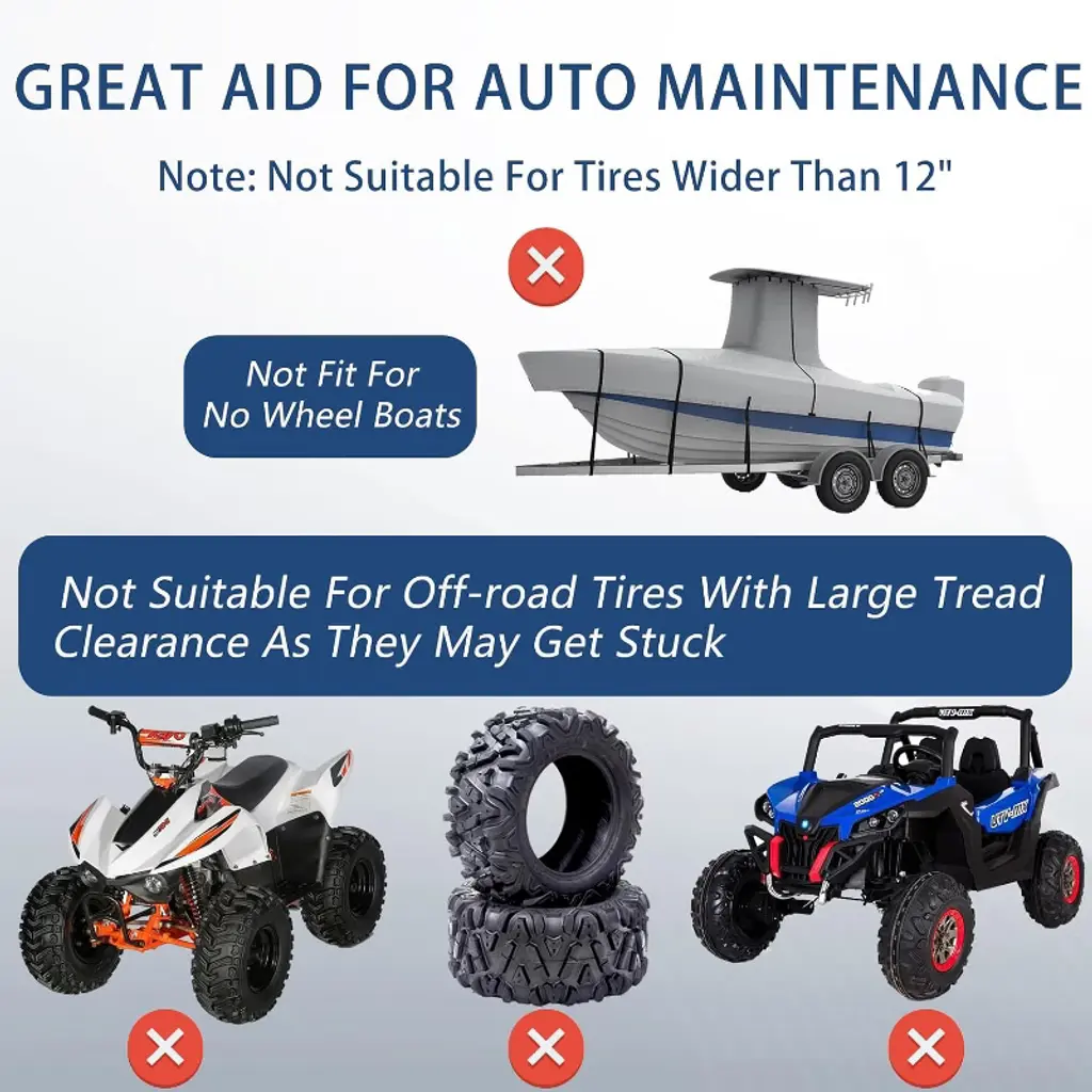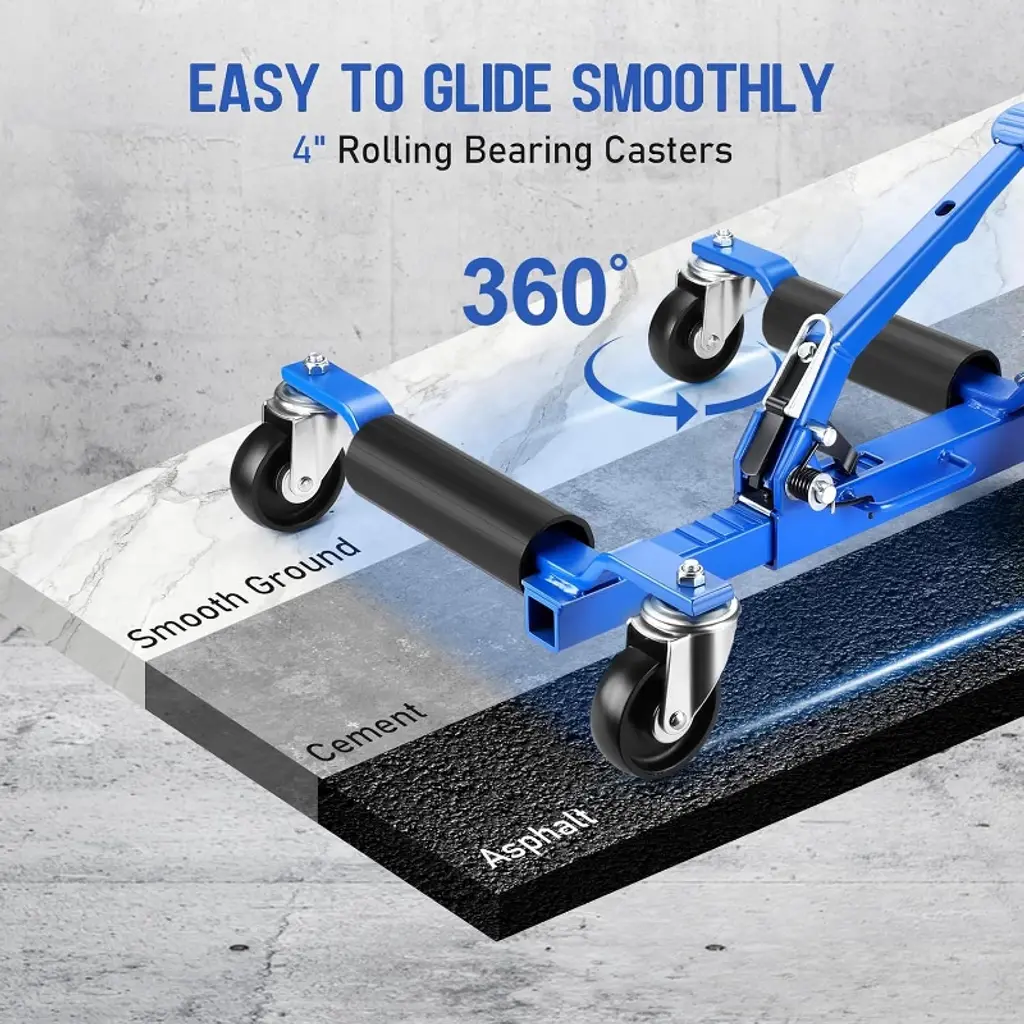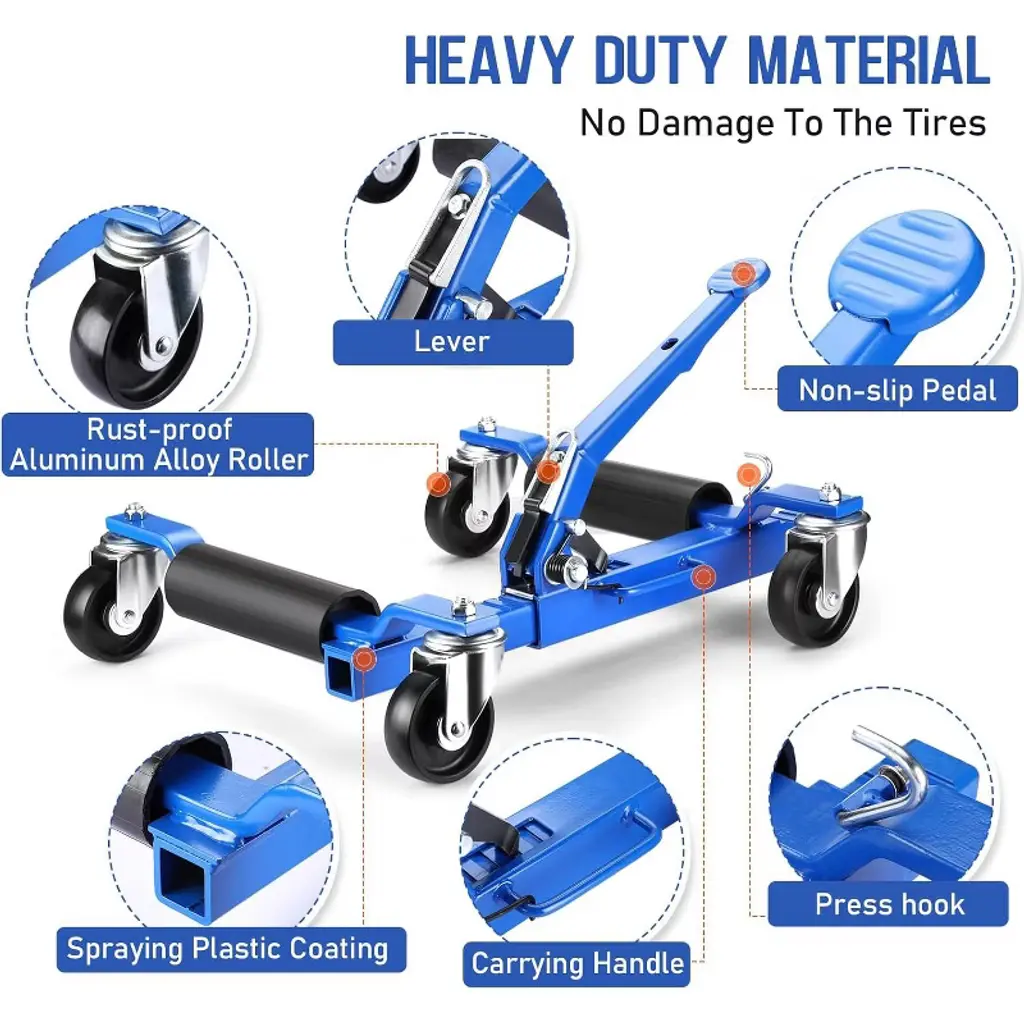 Transform your garage or shop with these professional-grade car dollies that make vehicle positioning effortless. Available in sets of 1, 2, 3, or 4 dollies to match your needs, each unit supports up to 1,500 lbs (6,000 lbs total for 4-dolly set). The reinforced steel construction features dual-wheel casters for smooth 360° movement, while the built-in tire jack lifts vehicles 2.5" for easy dolly placement. Perfect for auto repairs, detailing, or compact storage - roll sedans, classics, or project cars with minimal effort. Includes non-marking polyurethane wheels that protect concrete floors.