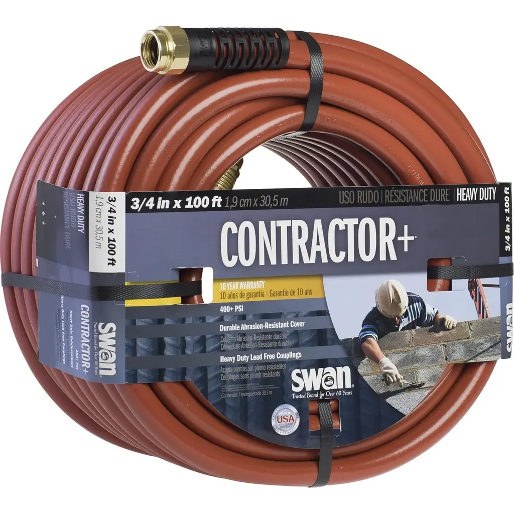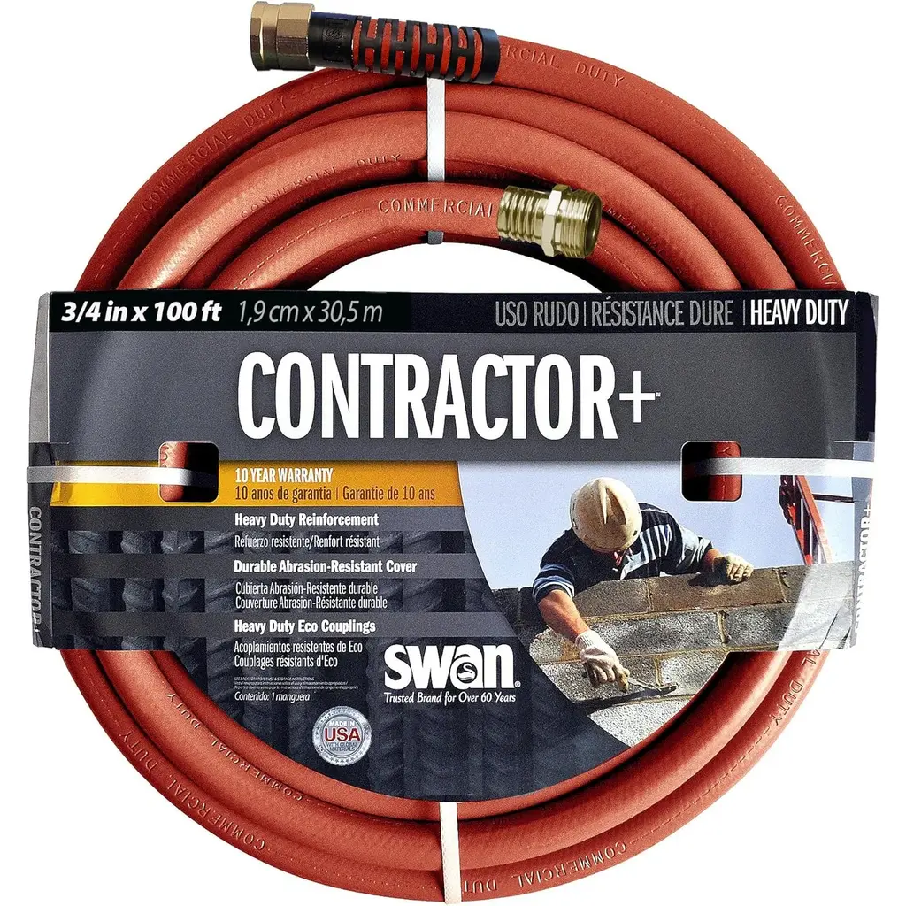 The Swan Commercial Use Contractor Heavy Duty Clay Water Hose is a water hose ideal for industrial applications such as construction job sites that require wide areas of coverage, by moving water in higher volumes. Designed with a special material that is covered in an abrasion-proof jacket for on the job reliability and high-performance use with a powerful burst strength of 400 PSI; includes crush-proof couplings and is kink-resistant allowing you to connect and forget, while concentrating on the job without interruptionsDelivers powerful burst strength of 400 PSI; Backed by heavy duty, crush proof couplingsHose construction allows kink resistance; Concentrate on the job without interruptionsDesigned with special material covered by an abrasion-proof jacketIdeal for industrial applications such as contruction job sites; Moves water in high volumes