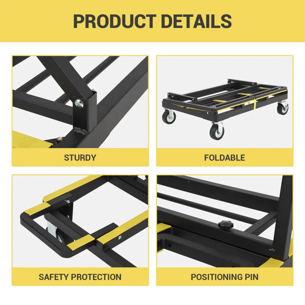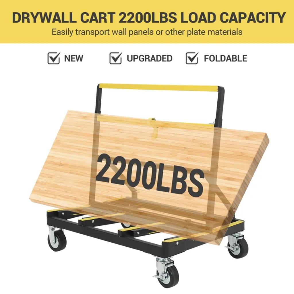 1.Industrial 2200LB Load Capacity? Reinforced triangular steel frame construction with 2mm thick tubing? Military-grade welding at stress points for maximum durability? Tested to handle 40+ sheets of 1/2" drywall simultaneously? Powder-coated finish resists jobsite wear and corrosion2. Smart Adjustable Transport System? Extendable deck adjusts from 32.8" to 58" width (fits 54" panels)? Telescoping handle extends from 43.3" to 55" for operator comfort? 6-position height adjustment (34"-46") for different load types? Rubber-lined deck protects delicate surfaces (glass, finished panels)3. Professional Safety Features? 10¡ã sloped loading deck prevents material slippage? Heavy-duty nylon straps (included) secure loads up to 3000lbs? Non-marking rubber casters (2 locking) protect floor surfaces? Wide wheelbase prevents tipping with unbalanced loads4. Space-Saving Foldable Design? Collapses from 39.4"L¡Á32.8"W¡Á43.3"H to 39.4"L¡Á27.6"W¡Á11.7"H? Fits in standard truck beds, van compartments, or jobsite trailers? 30-second setup with patented locking hinge mechanism? Weighs just 38lbs for easy portability5. Multi-Surface Mobility? 5" dual-wheel rubber casters handle rough terrain? 360¡ã swivel front wheels for precise maneuvering? Brake system holds position on inclines up to 15¡ã? Smooth-rolling on concrete, plywood, or unfinished floors