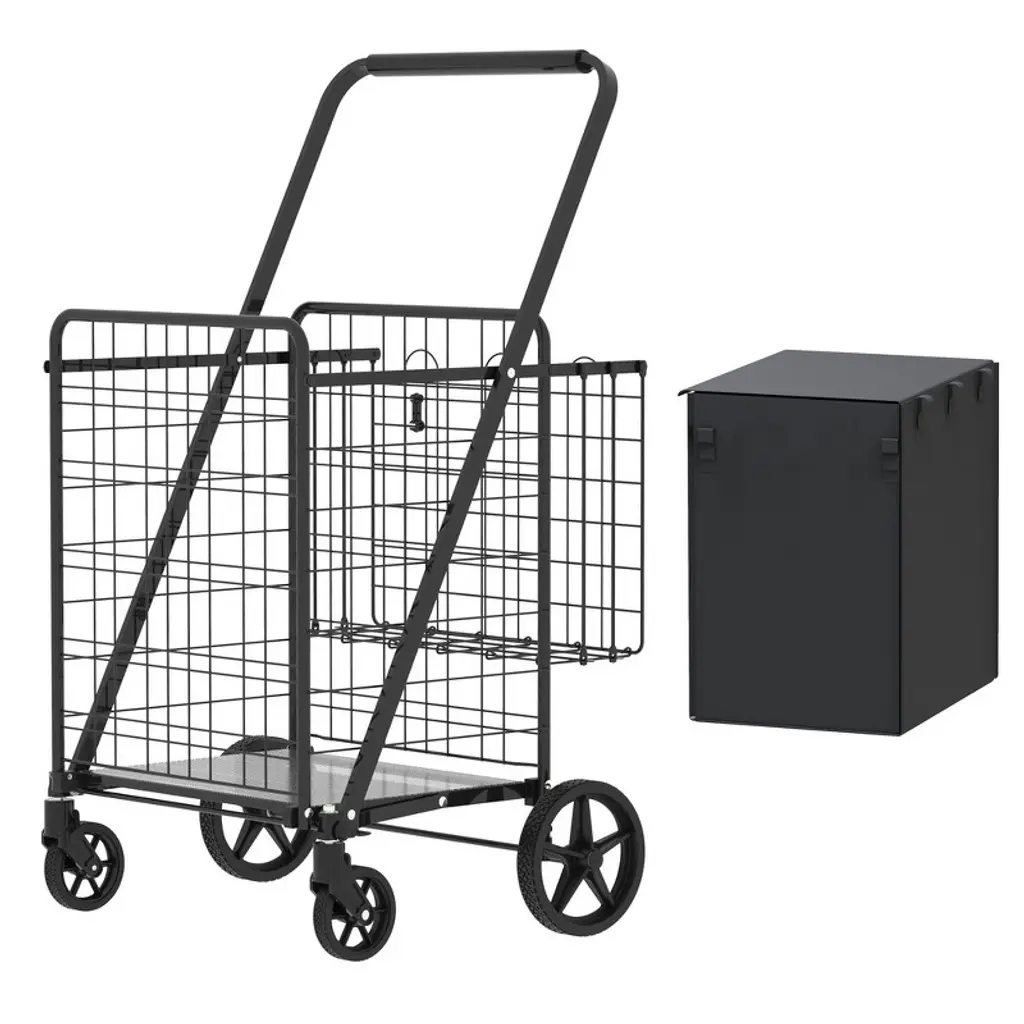 Heavy Duty Folding Utility Shopping Double Cart - 25" X 25" X 40"(l X W X H) - Black